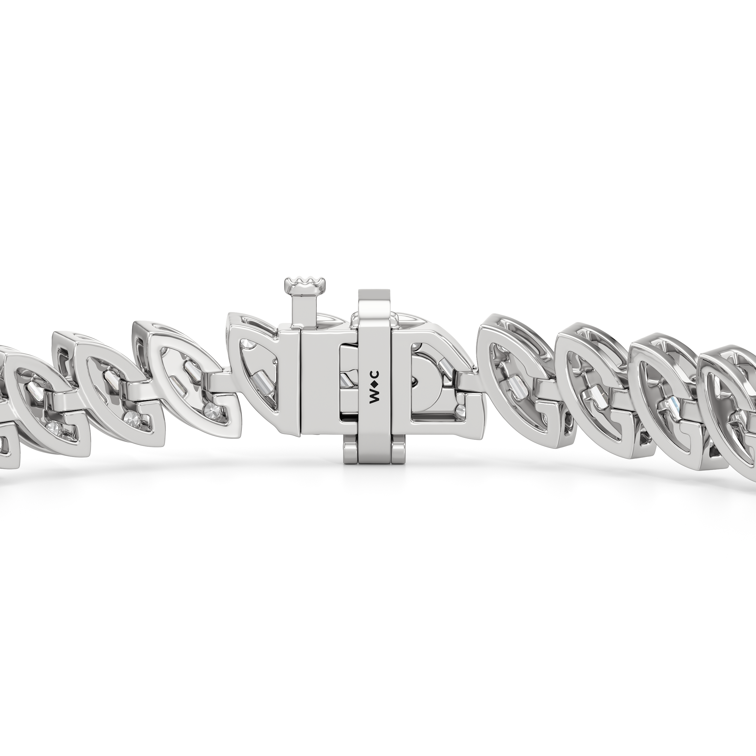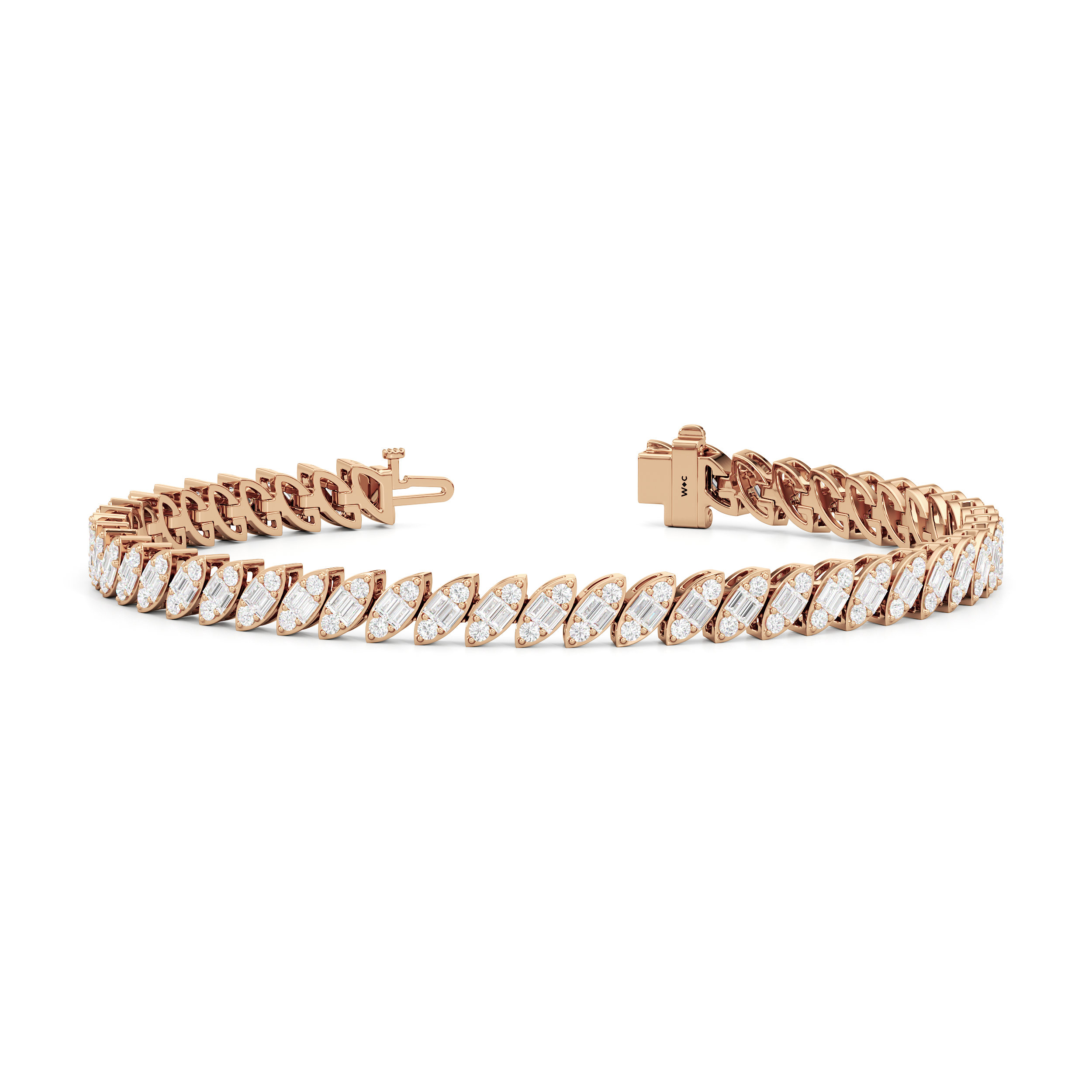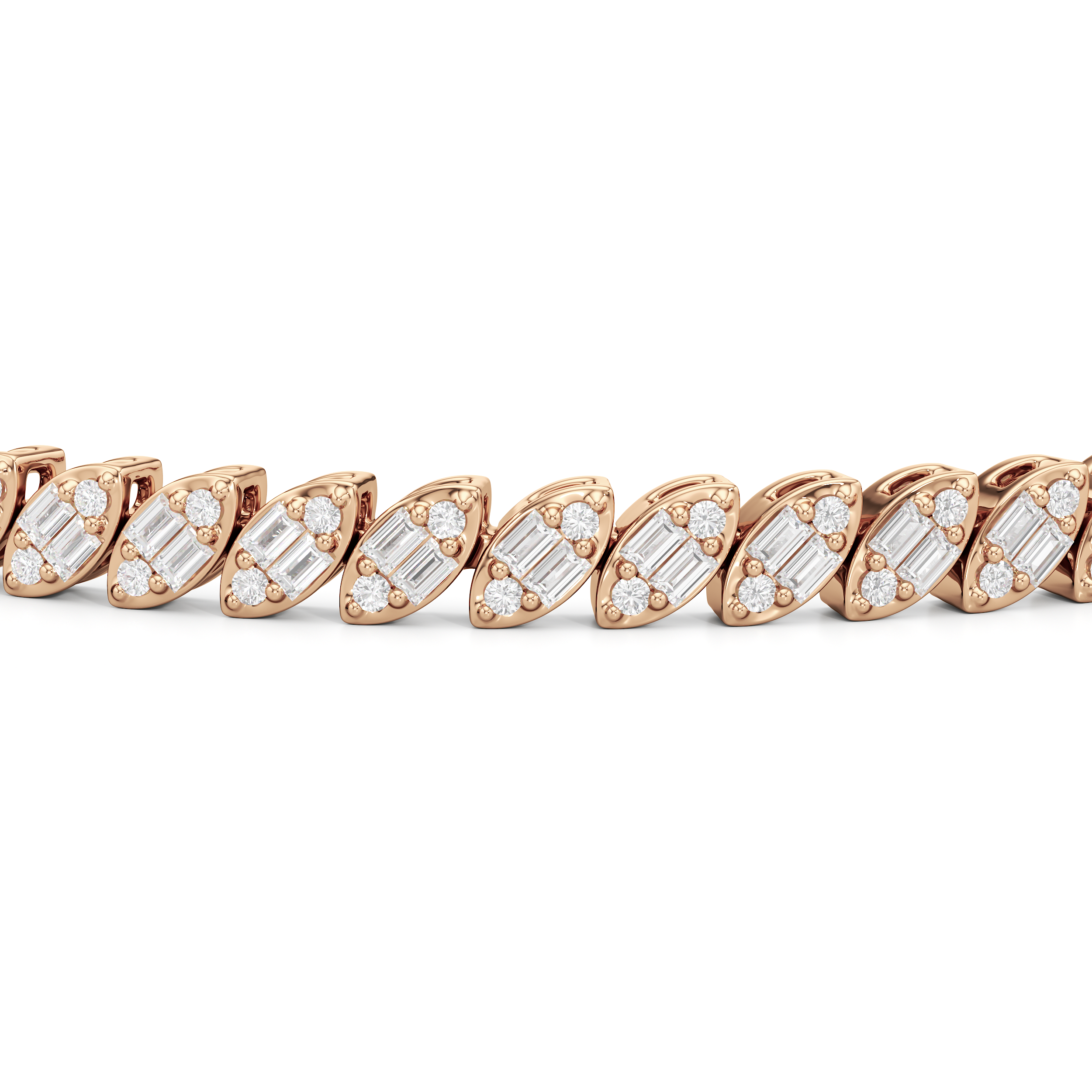 Your new fashion-daring all-rounder, ready to elegantly wrap your wrist in brilliance. This line bracelet features a continuous row of diagonally set marquise-shaped baskets, each cradling round and baguette diamonds.