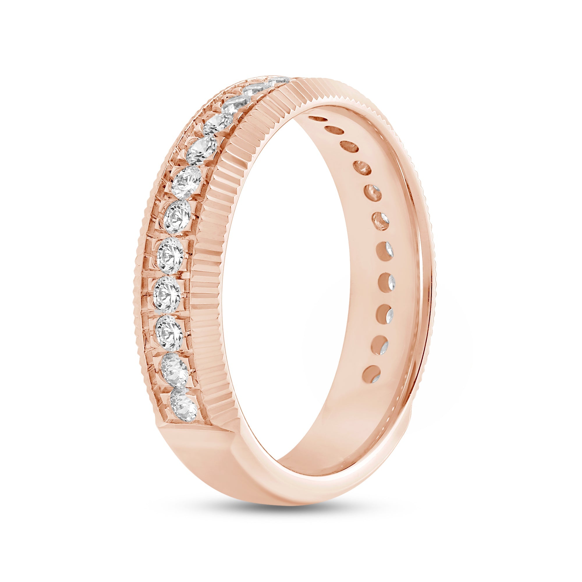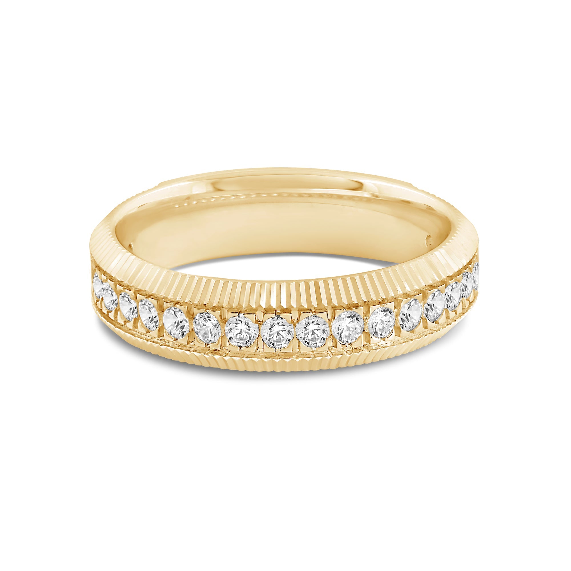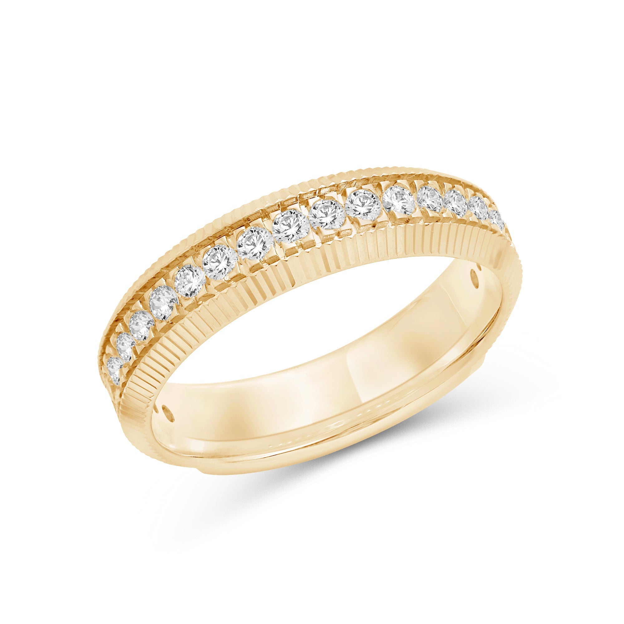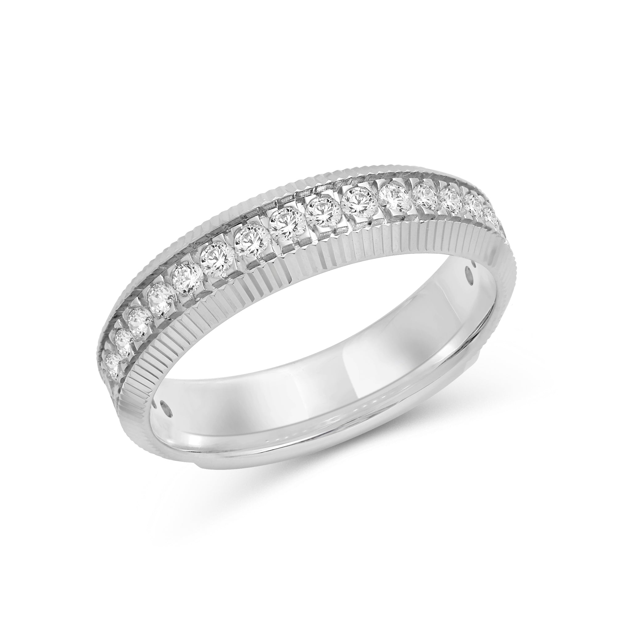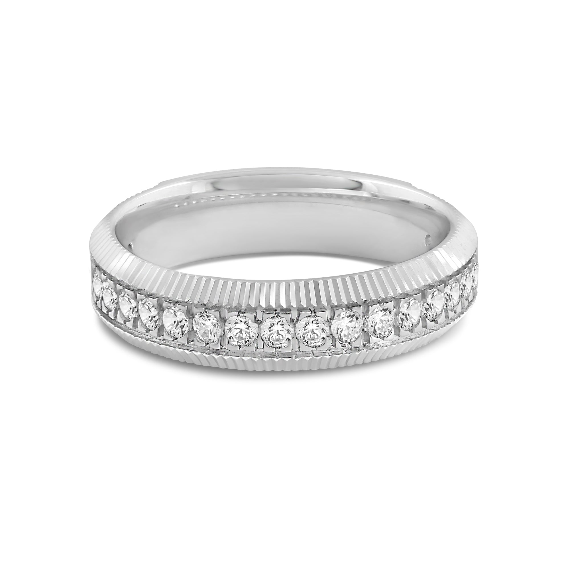 Go beyond the basics with this off-the-wall bauble. A series of diamonds run along the band's circumference, bordered by fluted detailing. The dimensional look of this ring elevates any outfit.