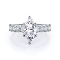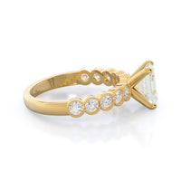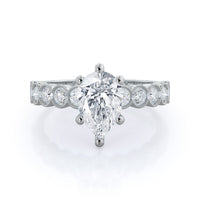 Traditionally beautiful bezel set accent diamonds are further enhanced by a intricate milgrain design around each bezel.