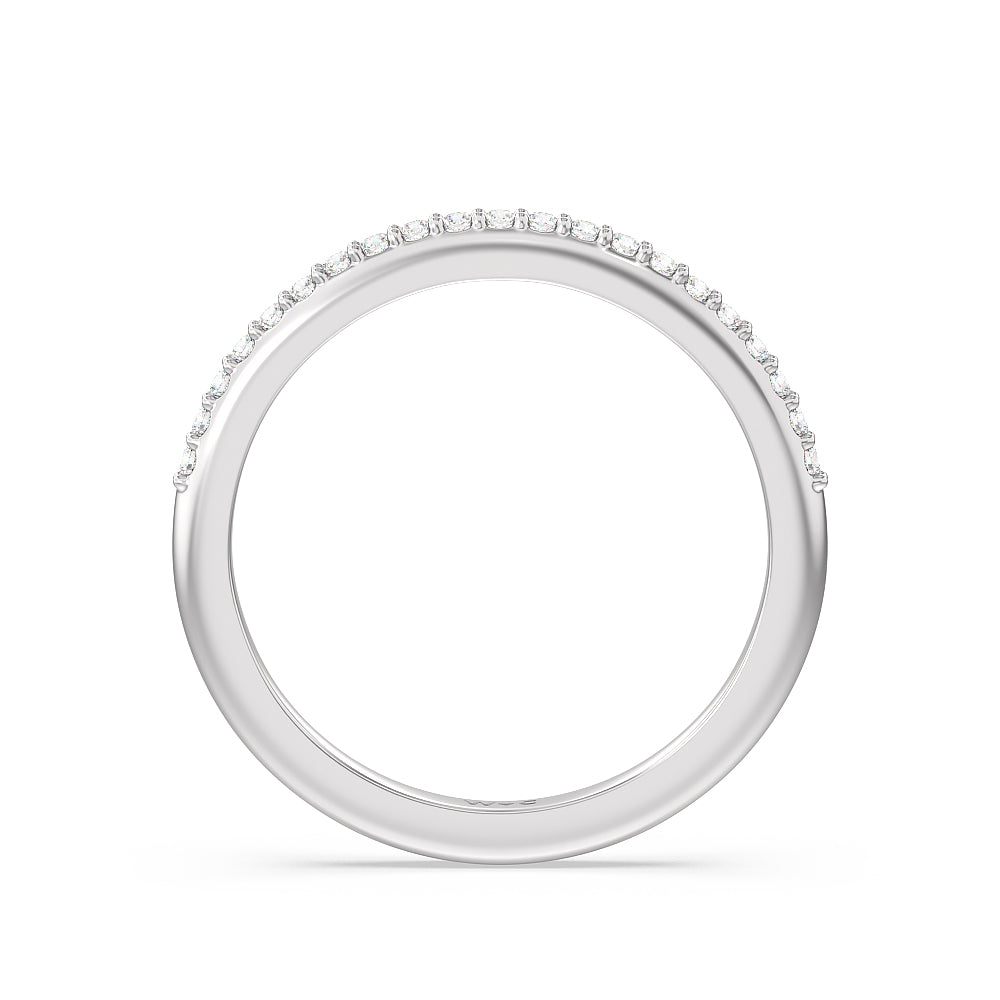 Sparkling pave diamonds set in delicately sculpted shared prongs reach almost halfway down the shank of this beautiful band. Designed to fit perfectly with our modern fine line hidden halo engagement ring.