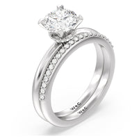 Modern in it's simplicity, the clean, fluid lines of this classic solitaire engagement ring pair with an intricate line of pave diamonds in a hidden halo design and signature claw details to create a truly luminous effect which sparkles from all angles.