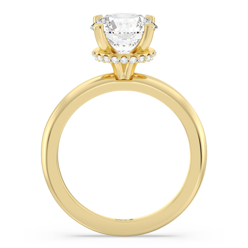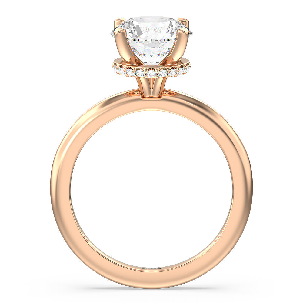 Modern in it's simplicity, the clean, fluid lines of this classic solitaire engagement ring pair with an intricate line of pave diamonds in a hidden halo design and signature claw details to create a truly luminous effect which sparkles from all angles.