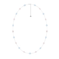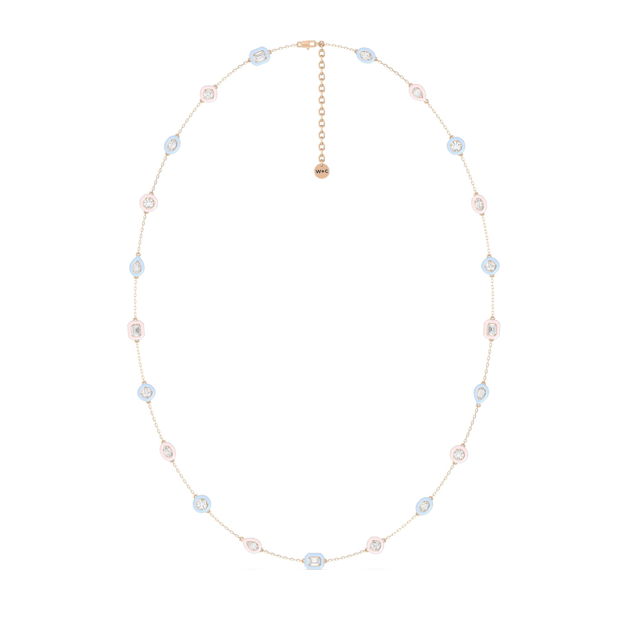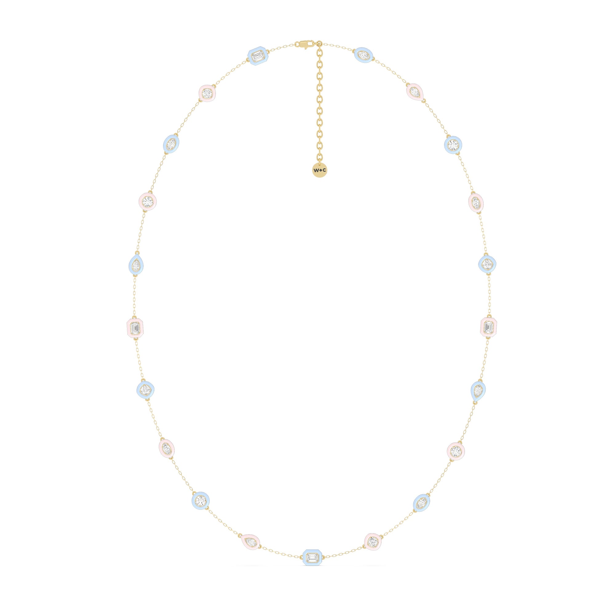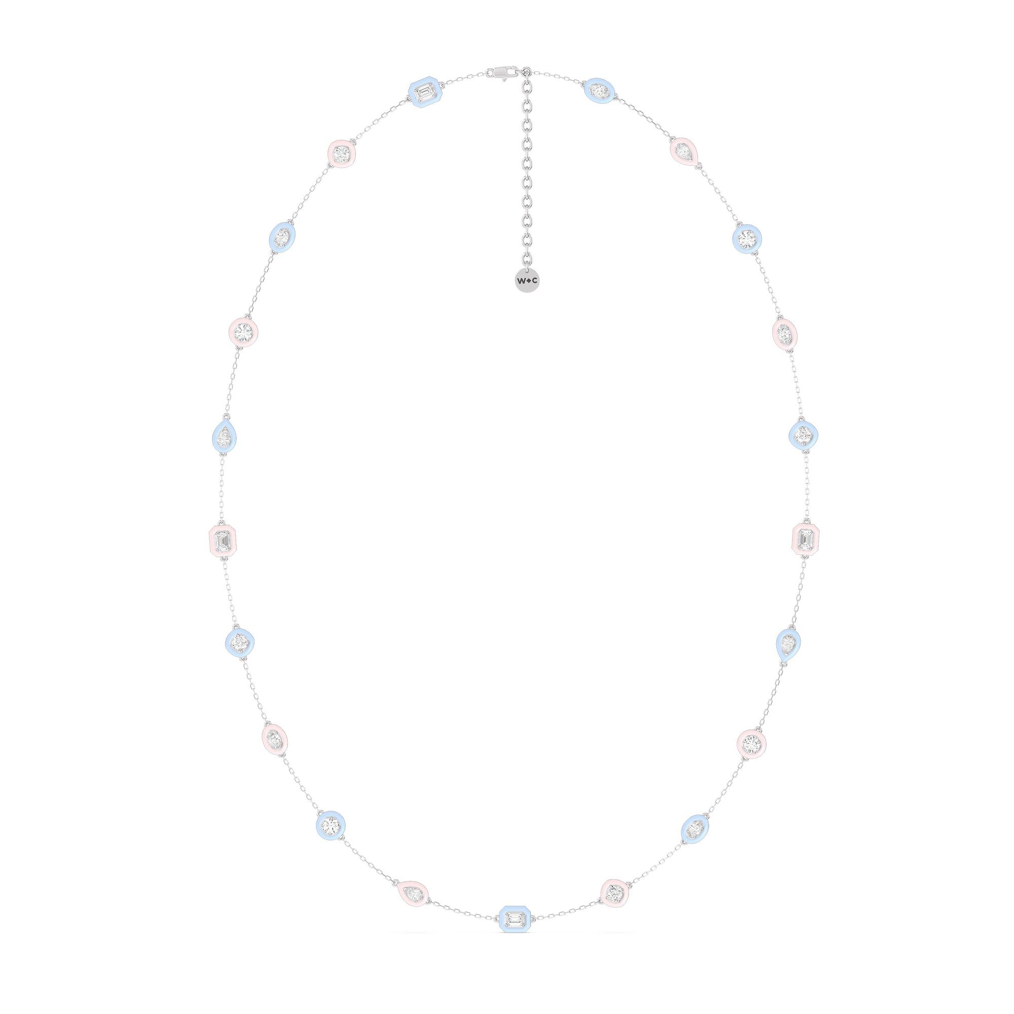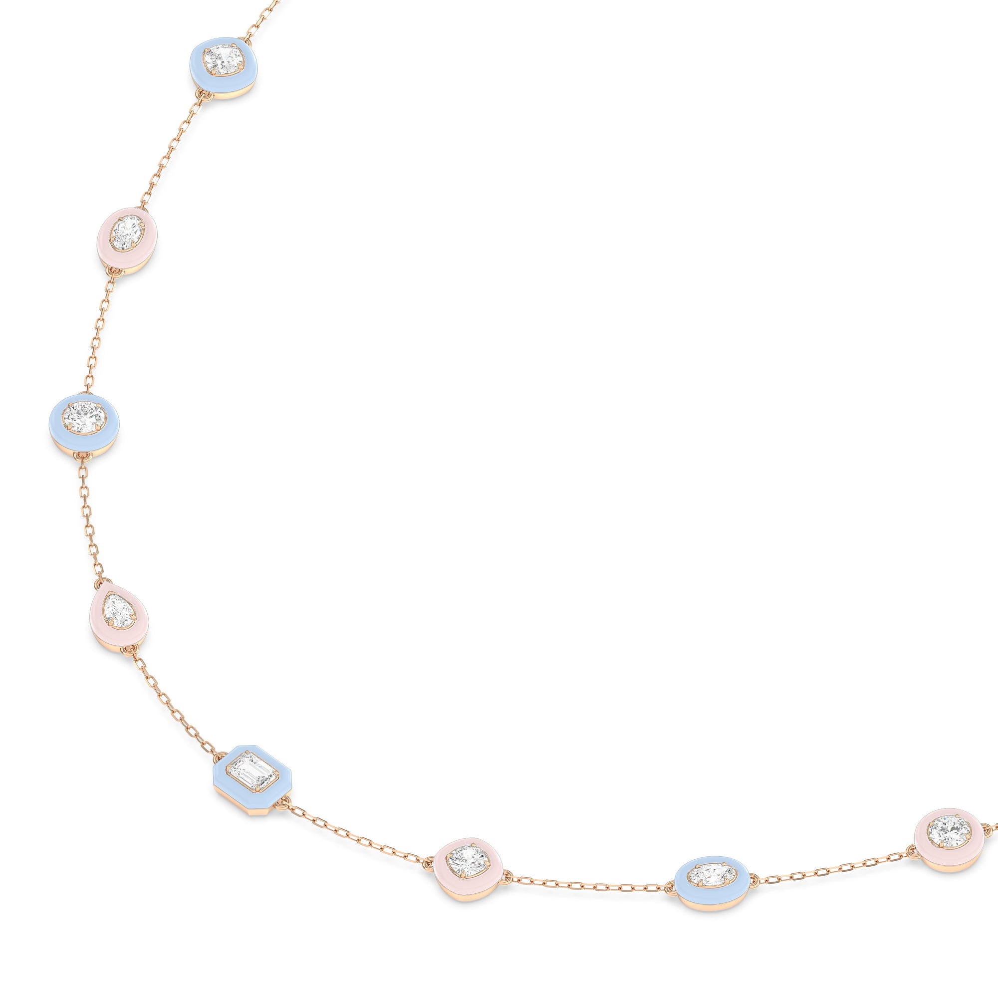 The combination of brilliance and vivid hue makes this ceramic necklace a favorite. The whimsical chain features a series of oval, pear, emerald, round, and cushion-cut diamonds set on evenly spaced stations along a necklace chain. Each brilliant gem is set on a ceramic bezel that offers a vibrant burst of color.