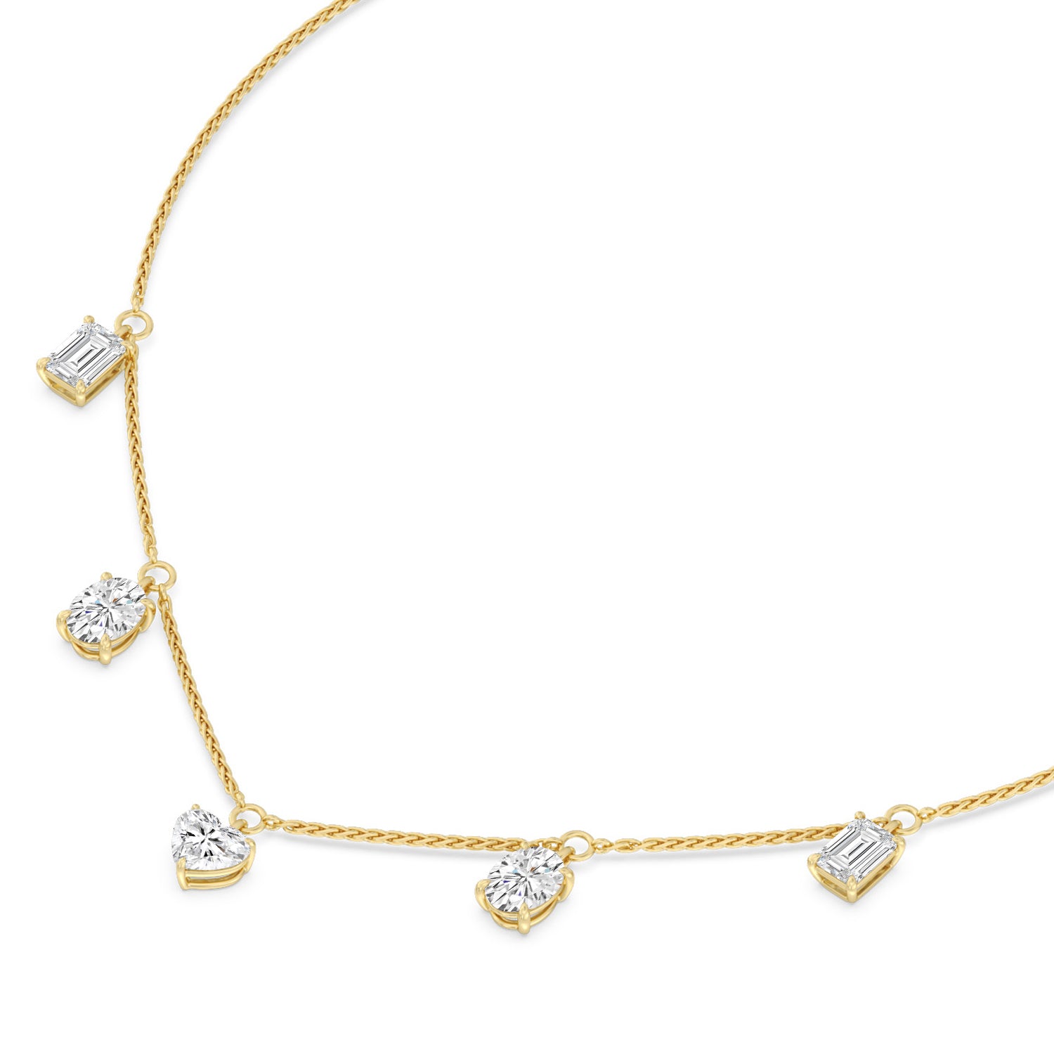 That luxurious yet understated look is easy to achieve with this diamond station necklace in your wardrobe. This beautiful piece features a barely-there chain adorned with five prong-set diamonds in different cuts. The diamonds are positioned evenly along the necklace's base, ready to catch light and deliver a subtle sparkle.