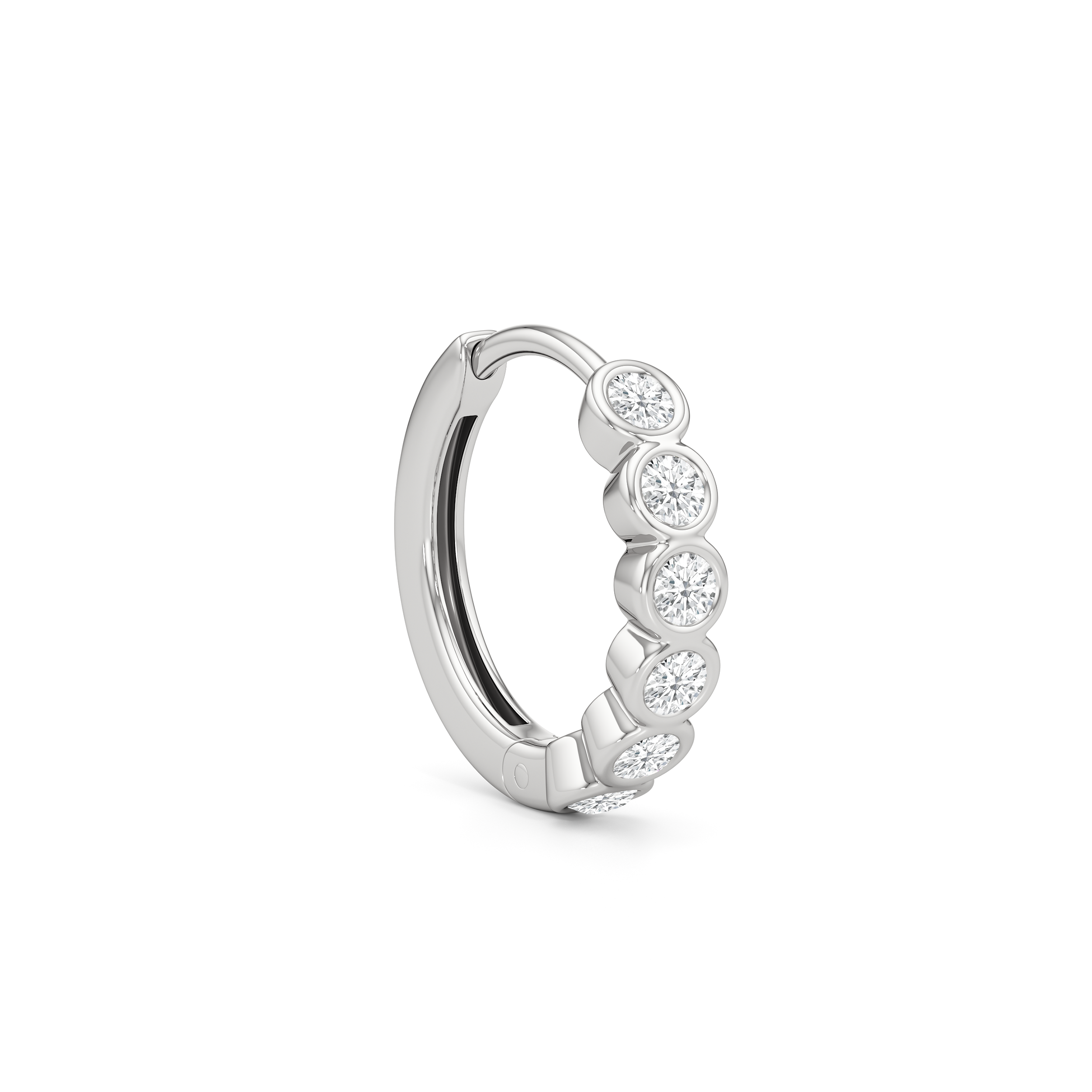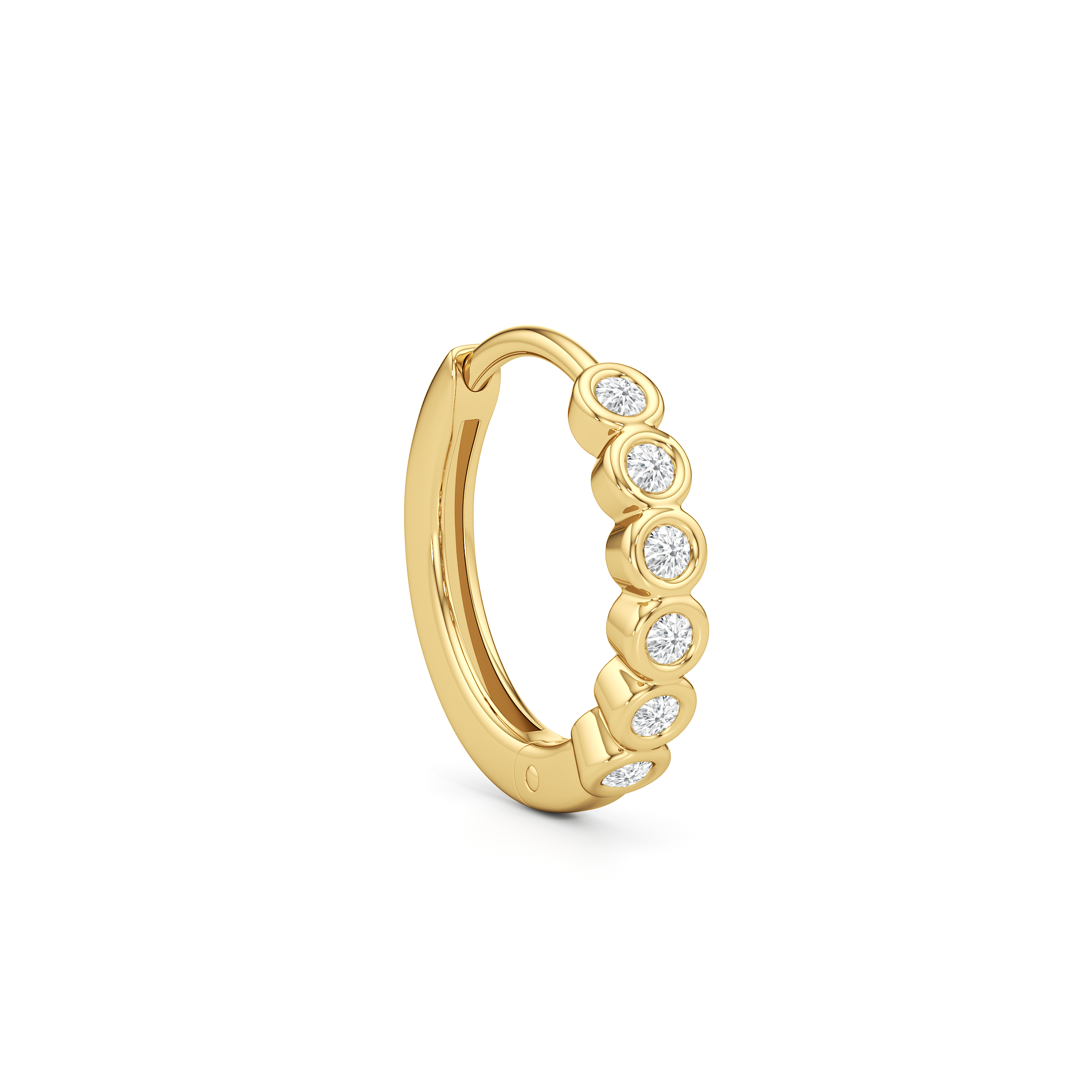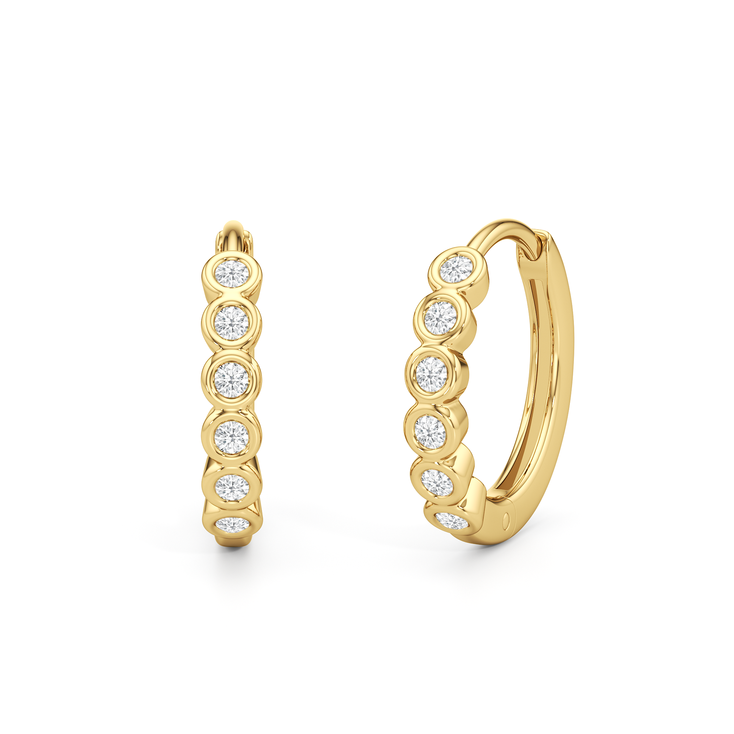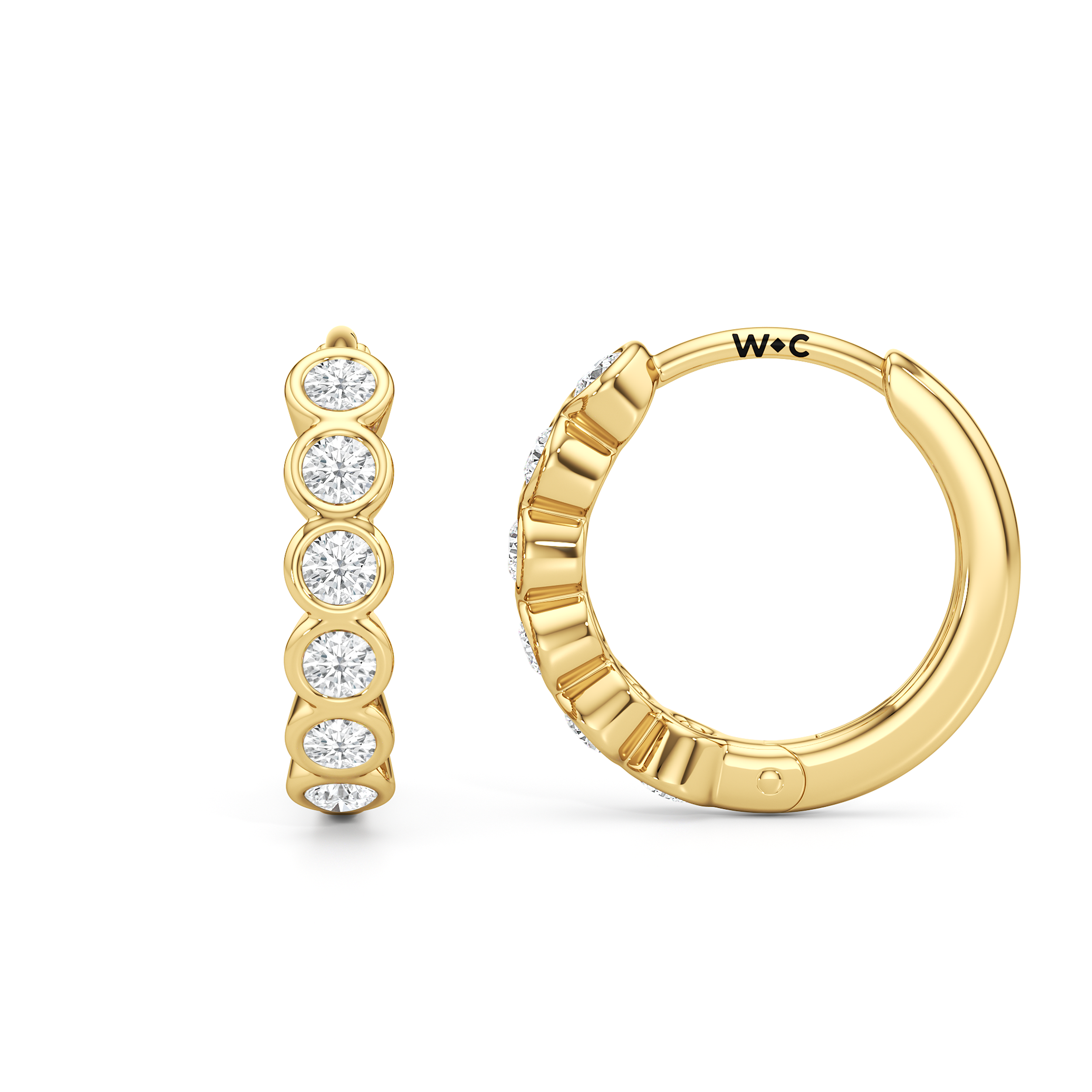 Subtle and sculpted, Muse is for those who favor zero fuss. The front of each hoop features round diamonds set in snug, protective bezels. These huggies are meant for all-day wear with their subtle brilliance and balanced look.