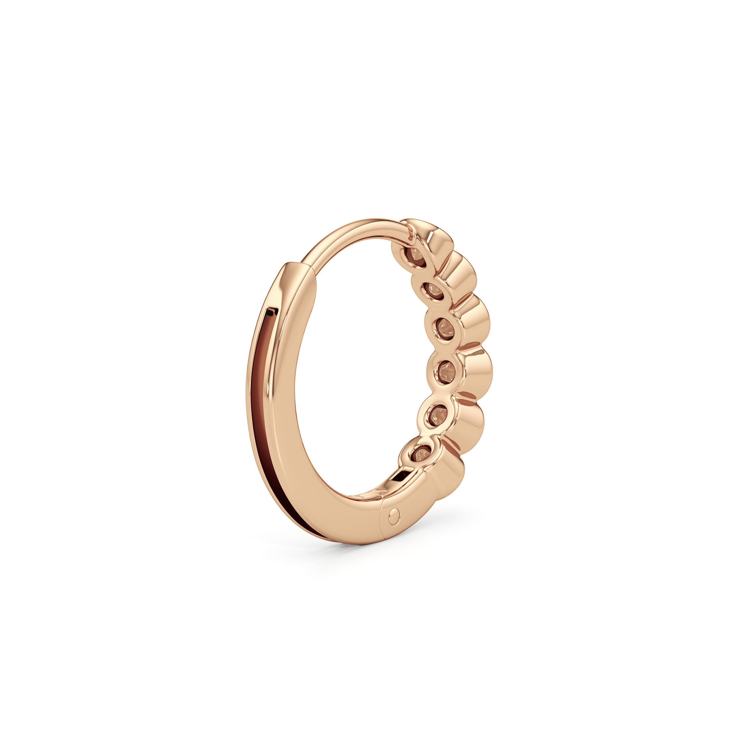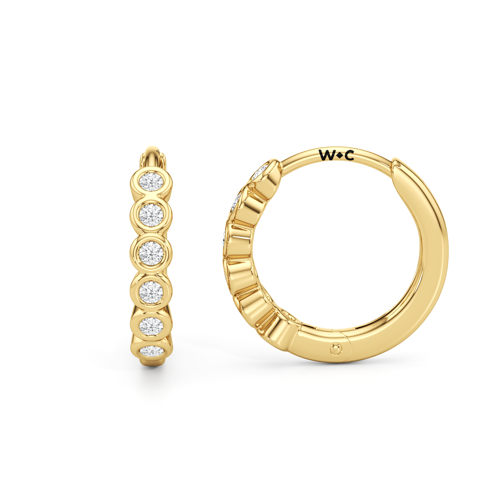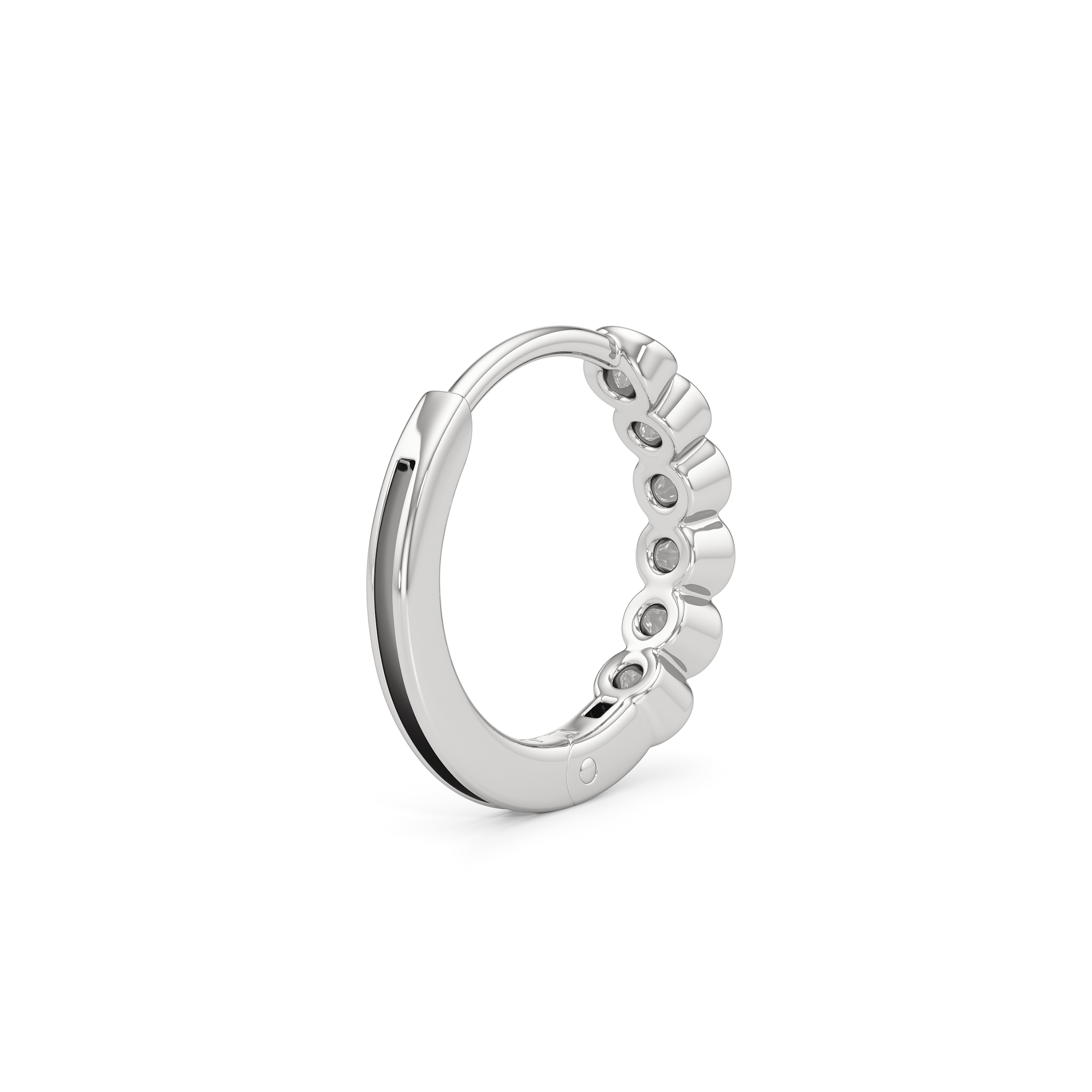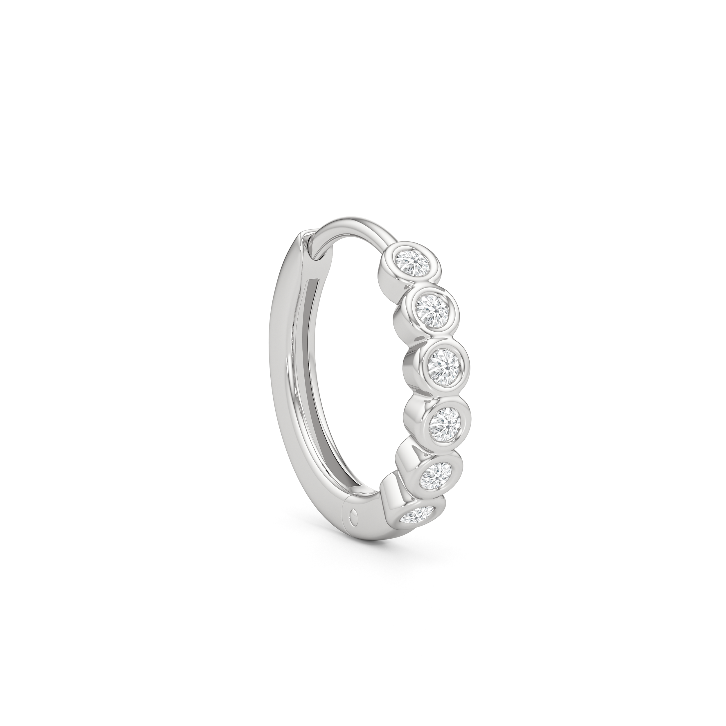 Subtle and sculpted, Muse is for those who favor zero fuss. The front of each hoop features round diamonds set in snug, protective bezels. These huggies are meant for all-day wear with their subtle brilliance and balanced look.