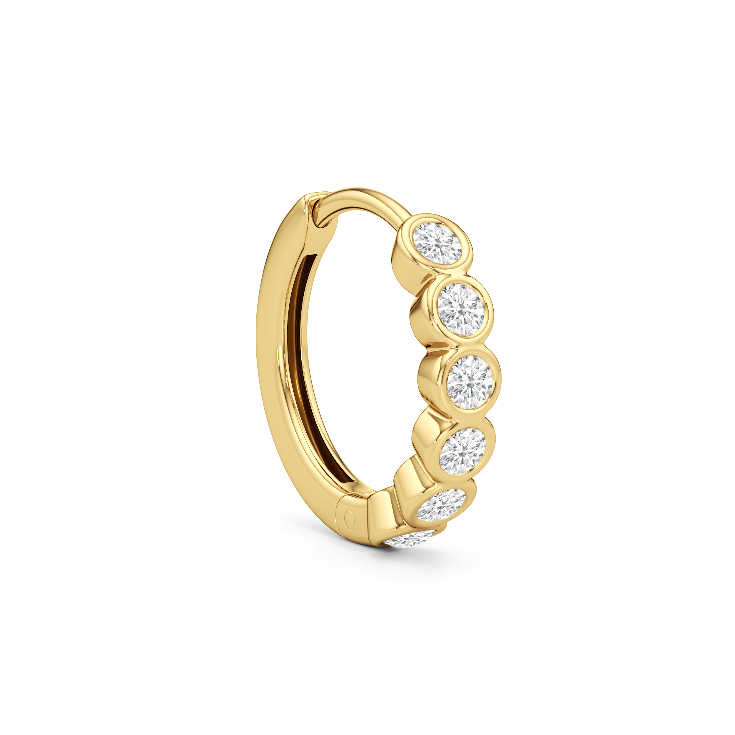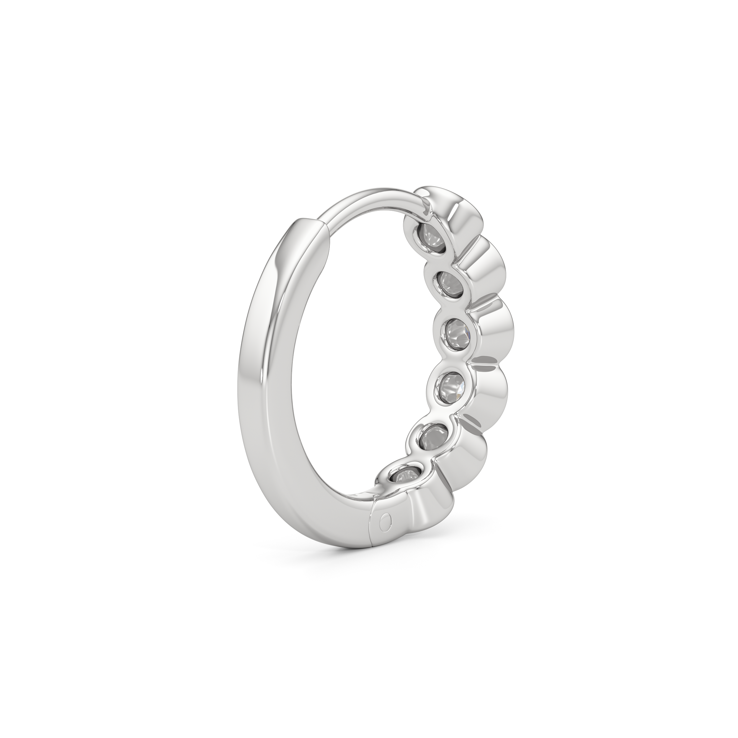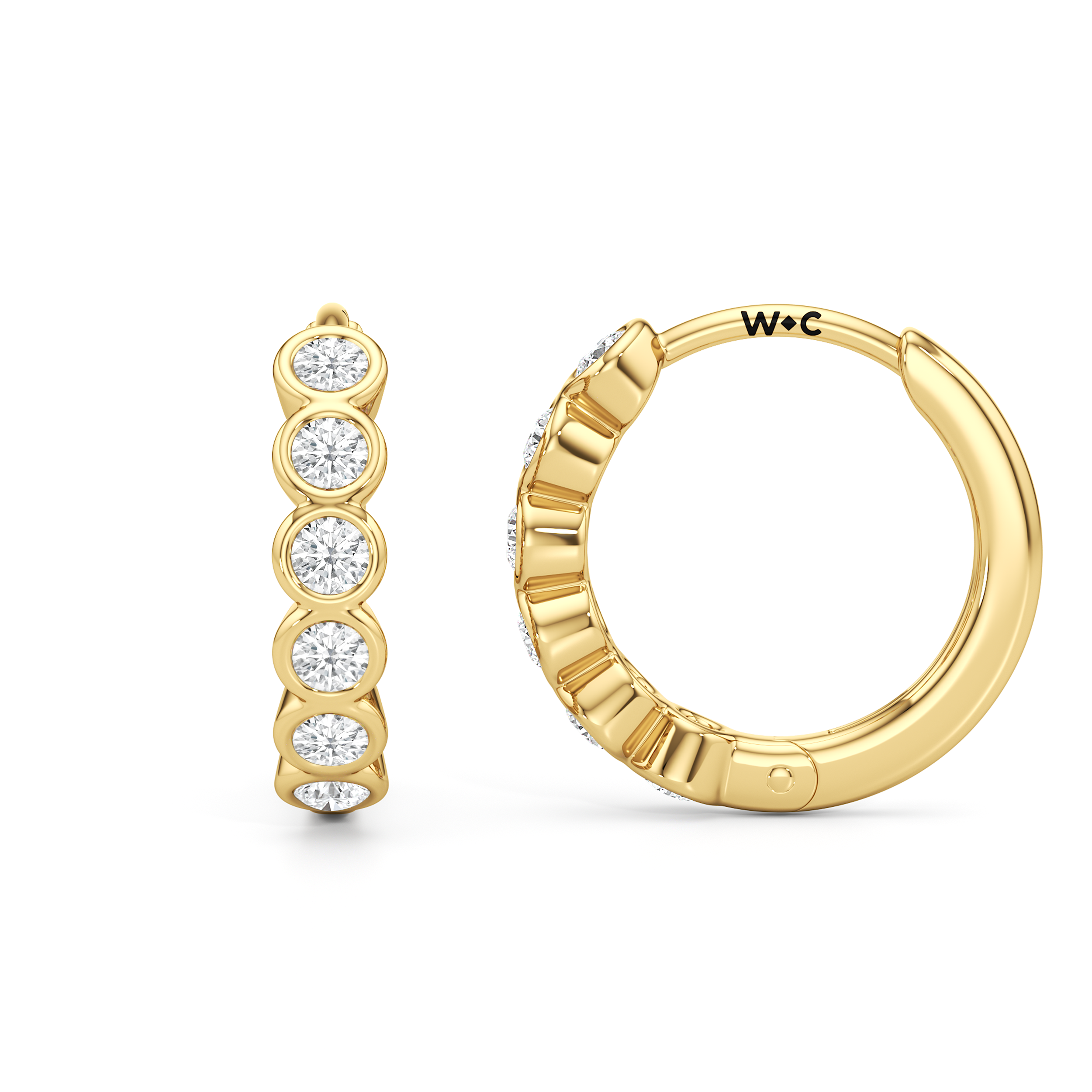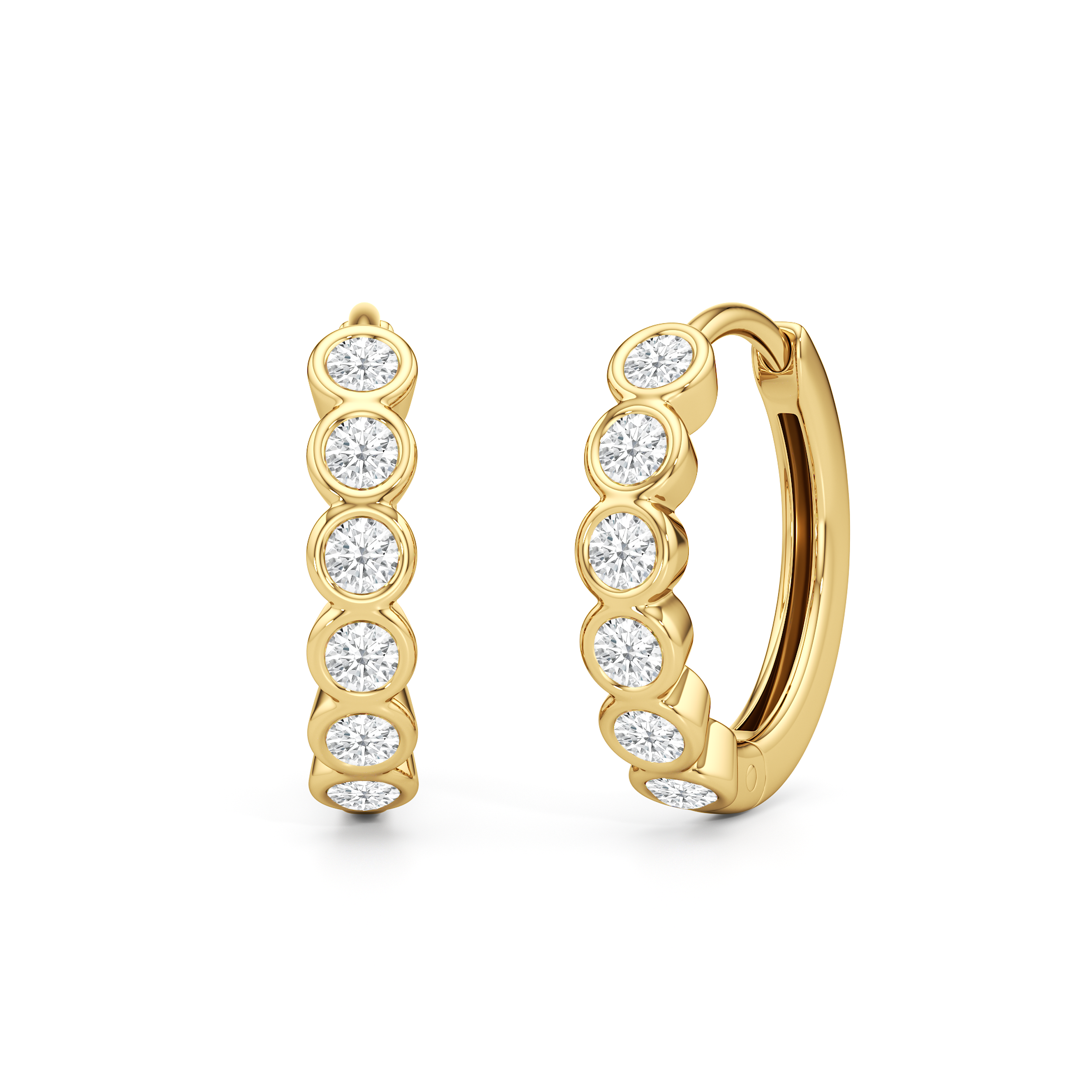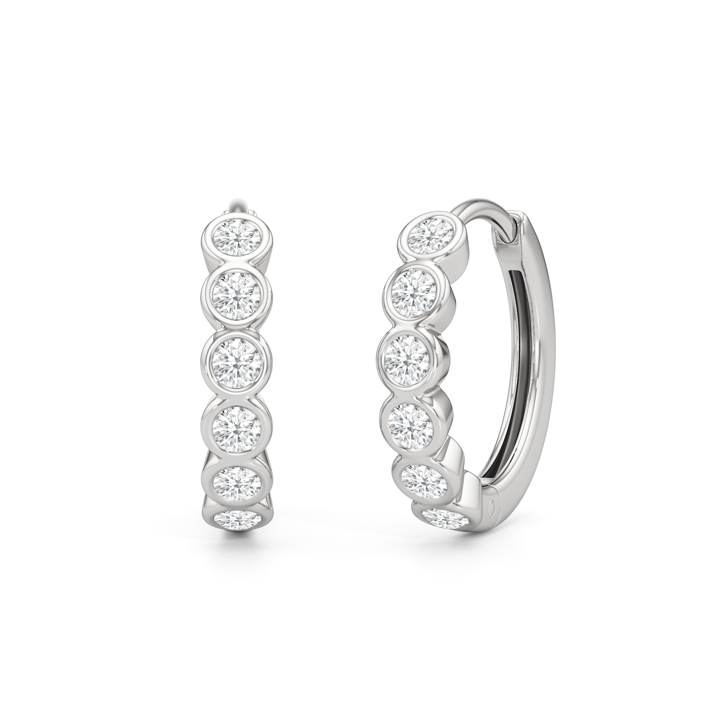 Subtle and sculpted, Muse is for those who favor zero fuss. The front of each hoop features round diamonds set in snug, protective bezels. These huggies are meant for all-day wear with their subtle brilliance and balanced look.