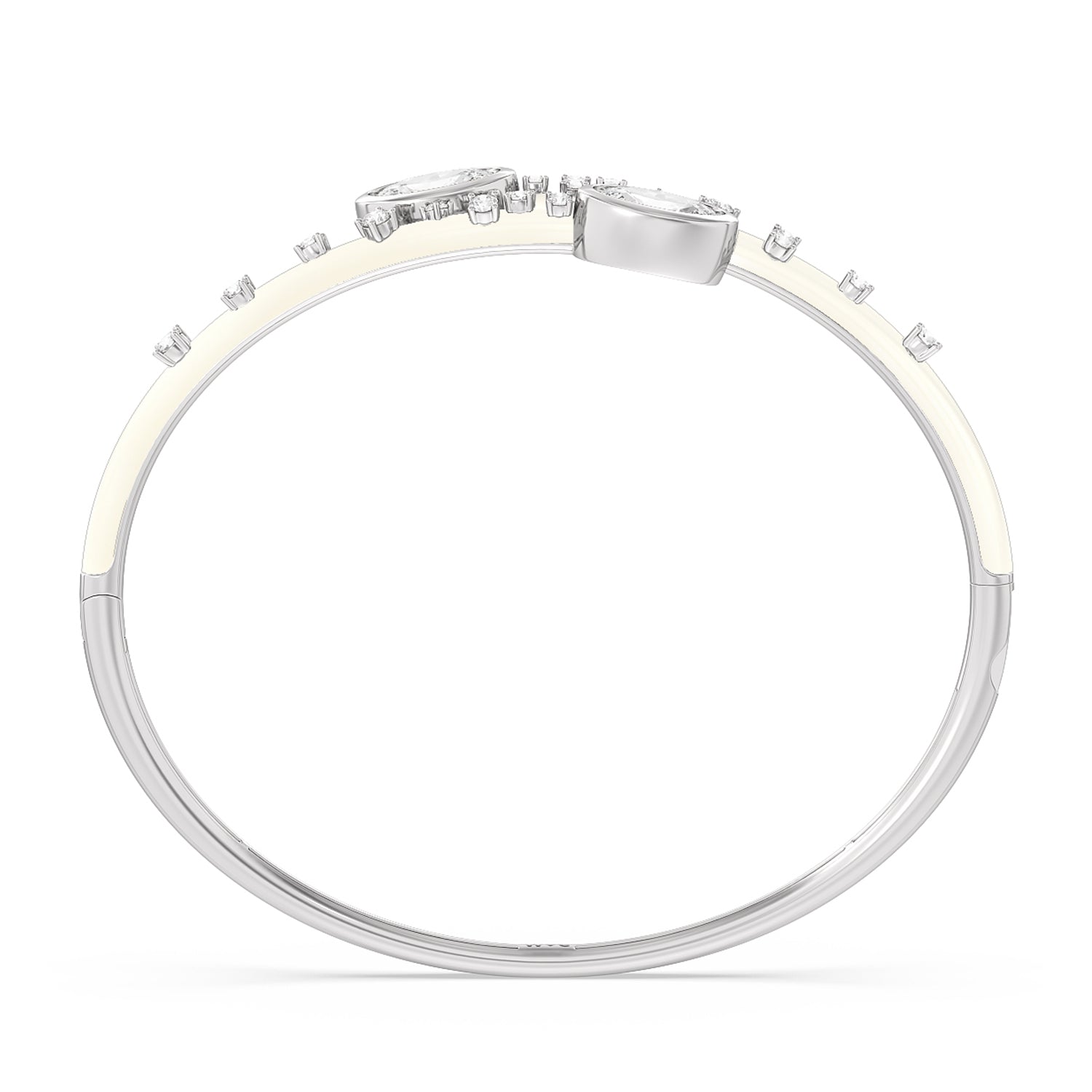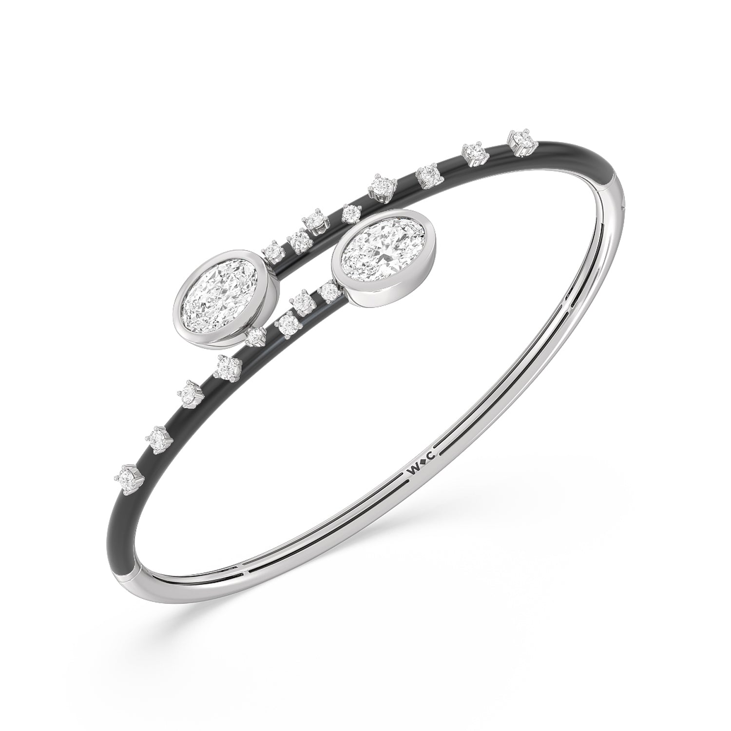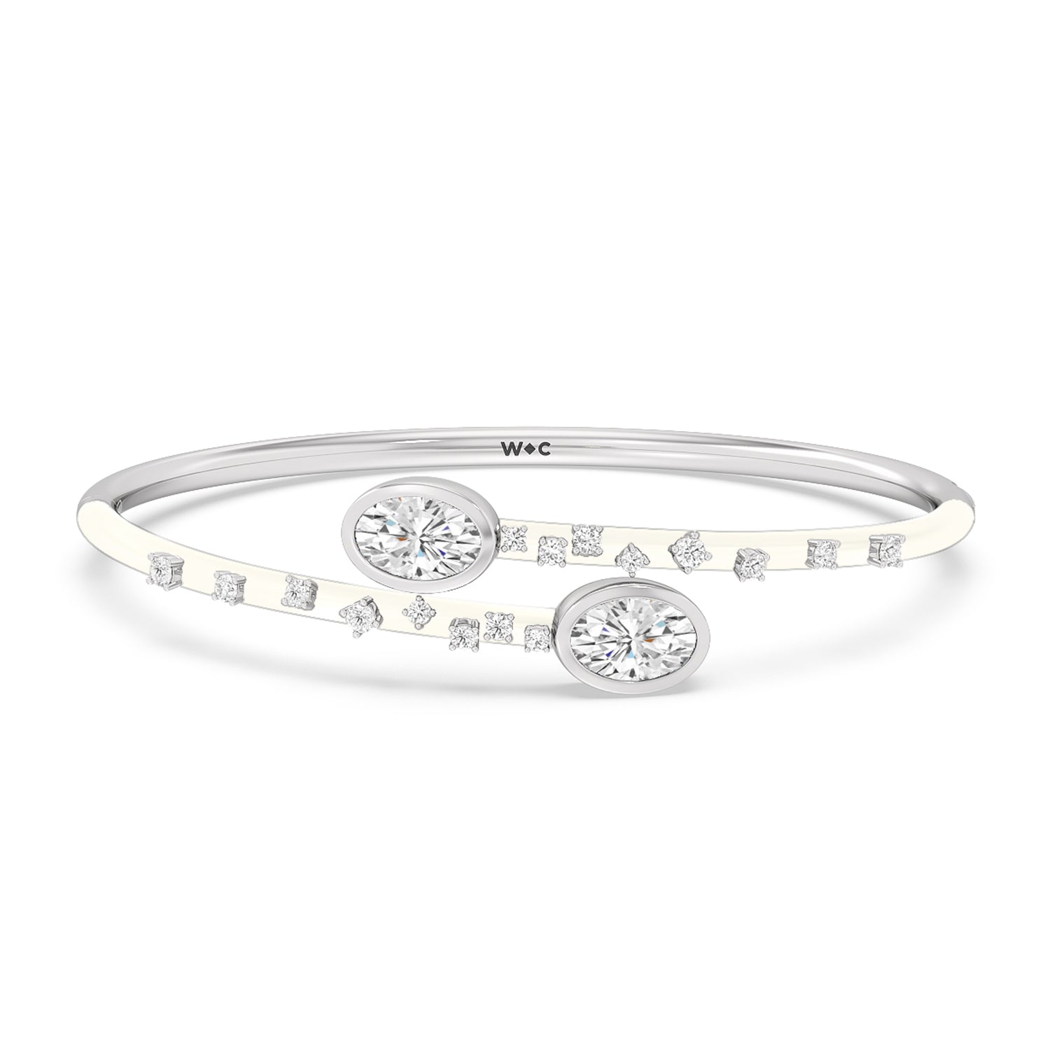 A mood boosting bracelet that elevates any look. It features an open bypass design with ceramic coating and diamond embellishment on the bangle's top half circumference. Two oval diamonds sit at each tip of the bangle's opening.
