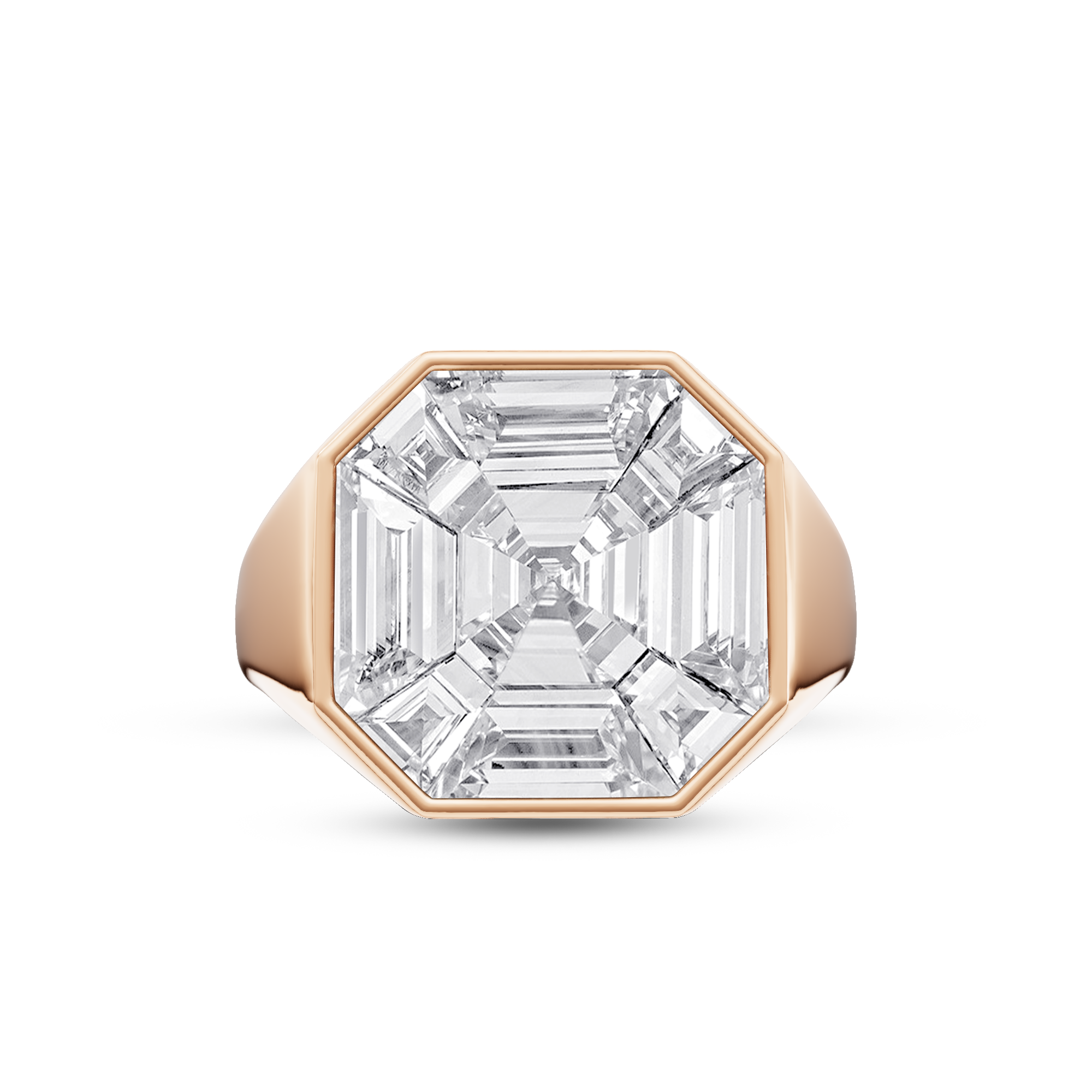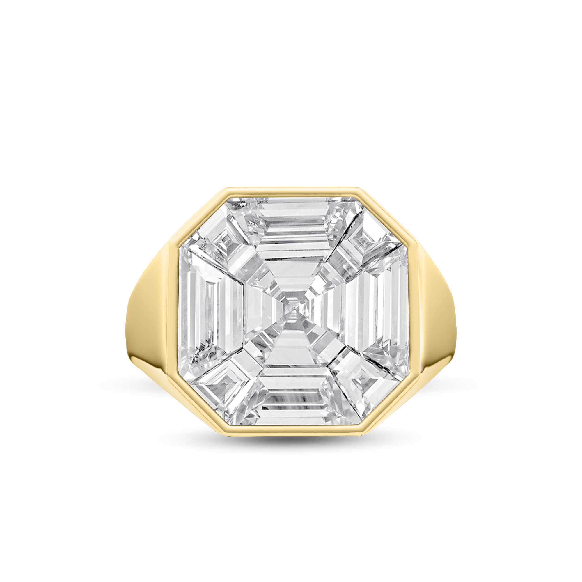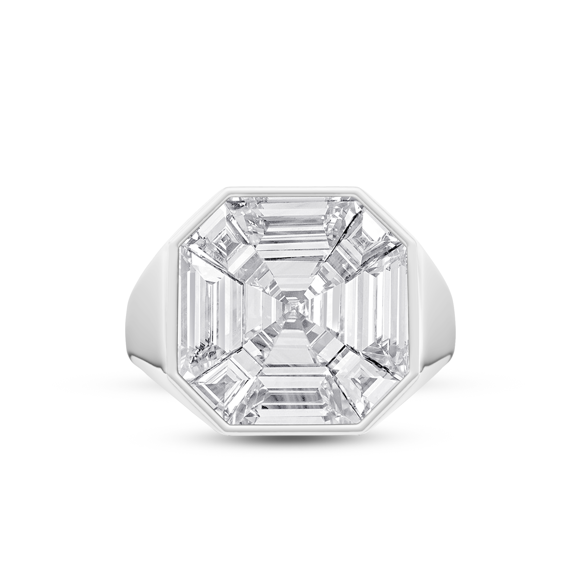 Designed for effortless luxury. Tapered trapezoid and baguette diamonds come together to embrace an Asscher center stone, maximizing light reflection for a striking shine. The eight-sided frame gives the ring an edgy, sculptural look.