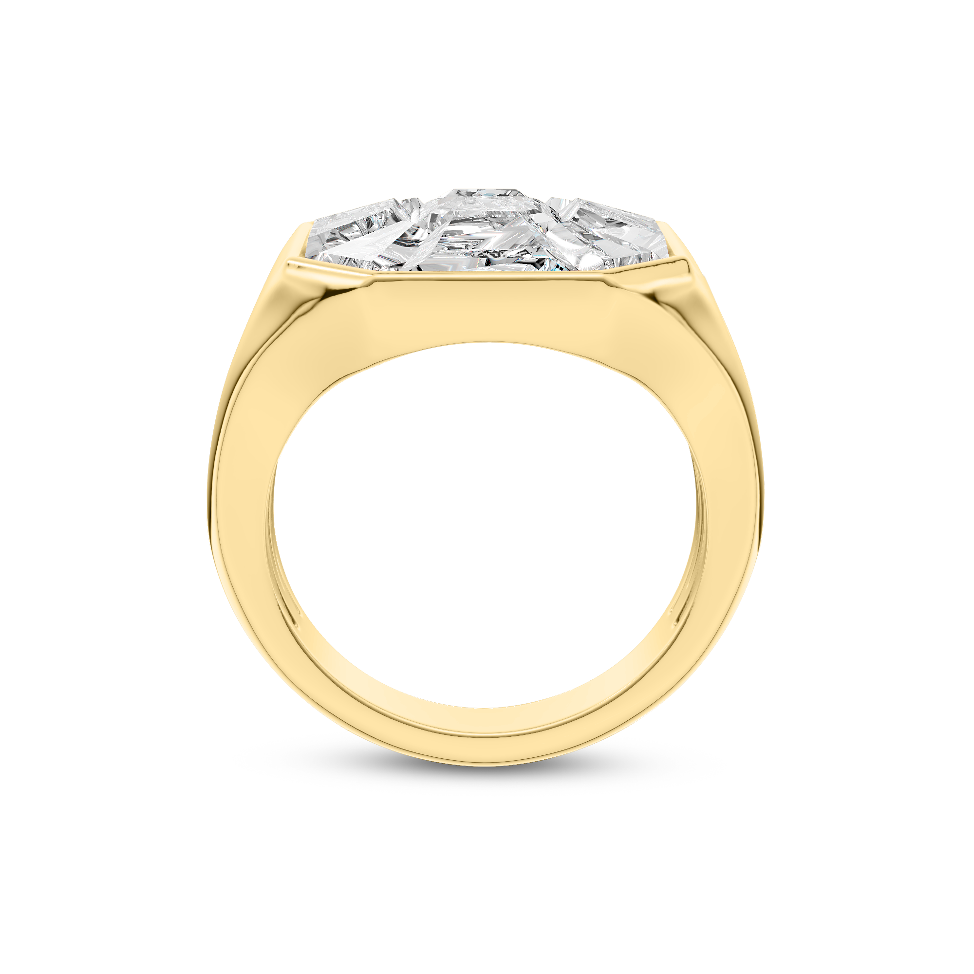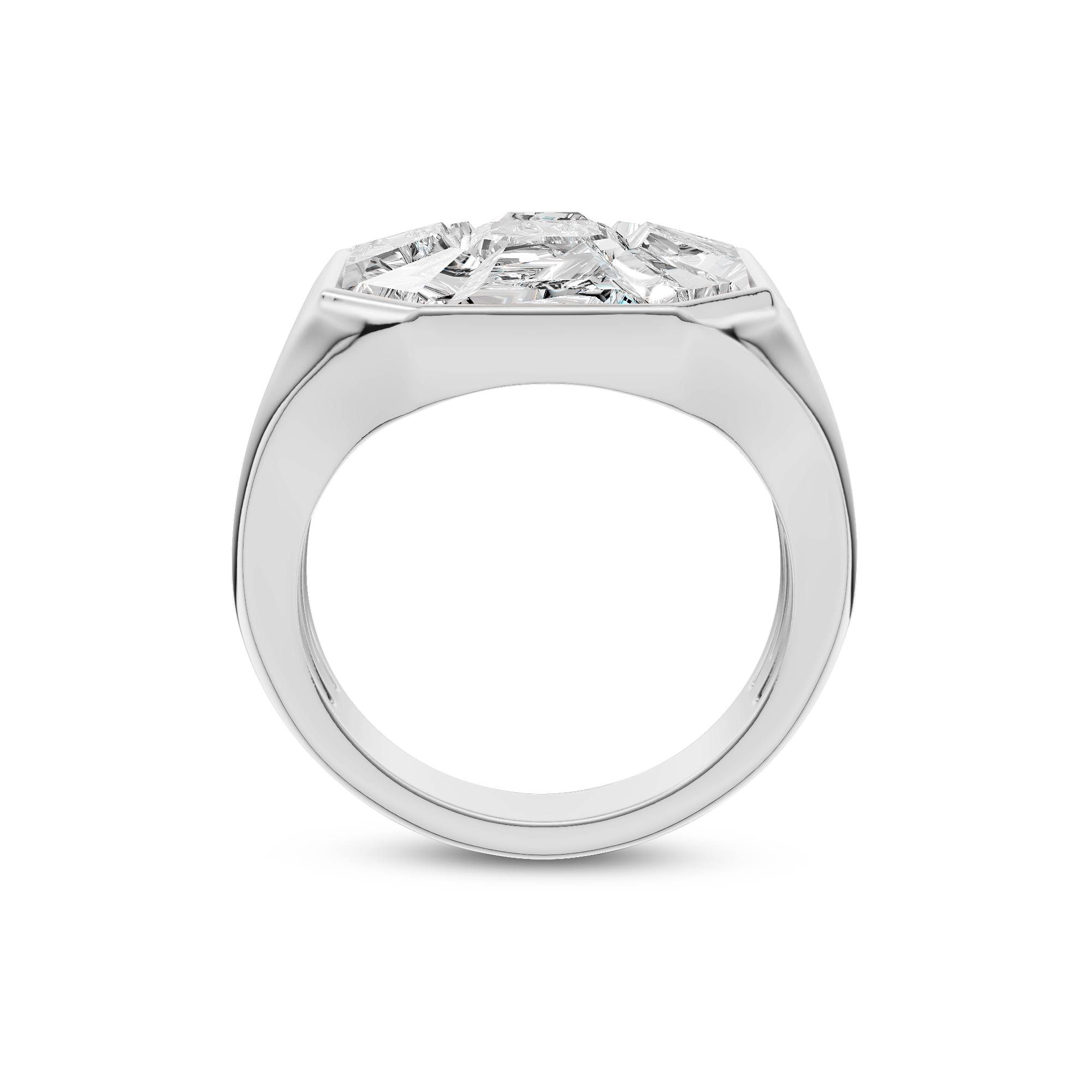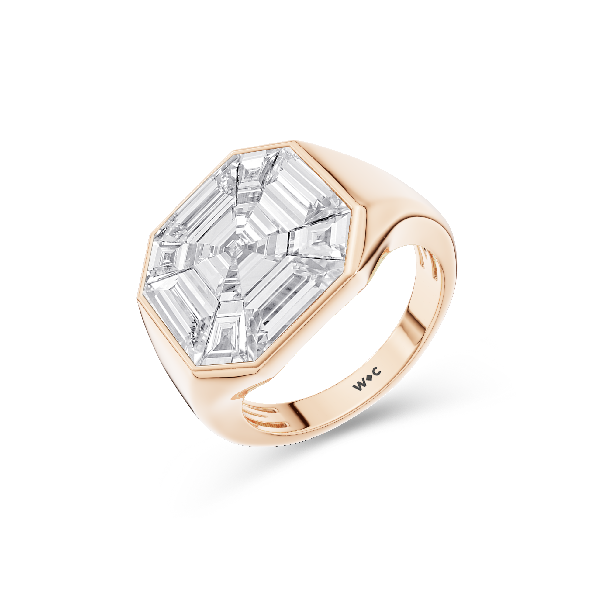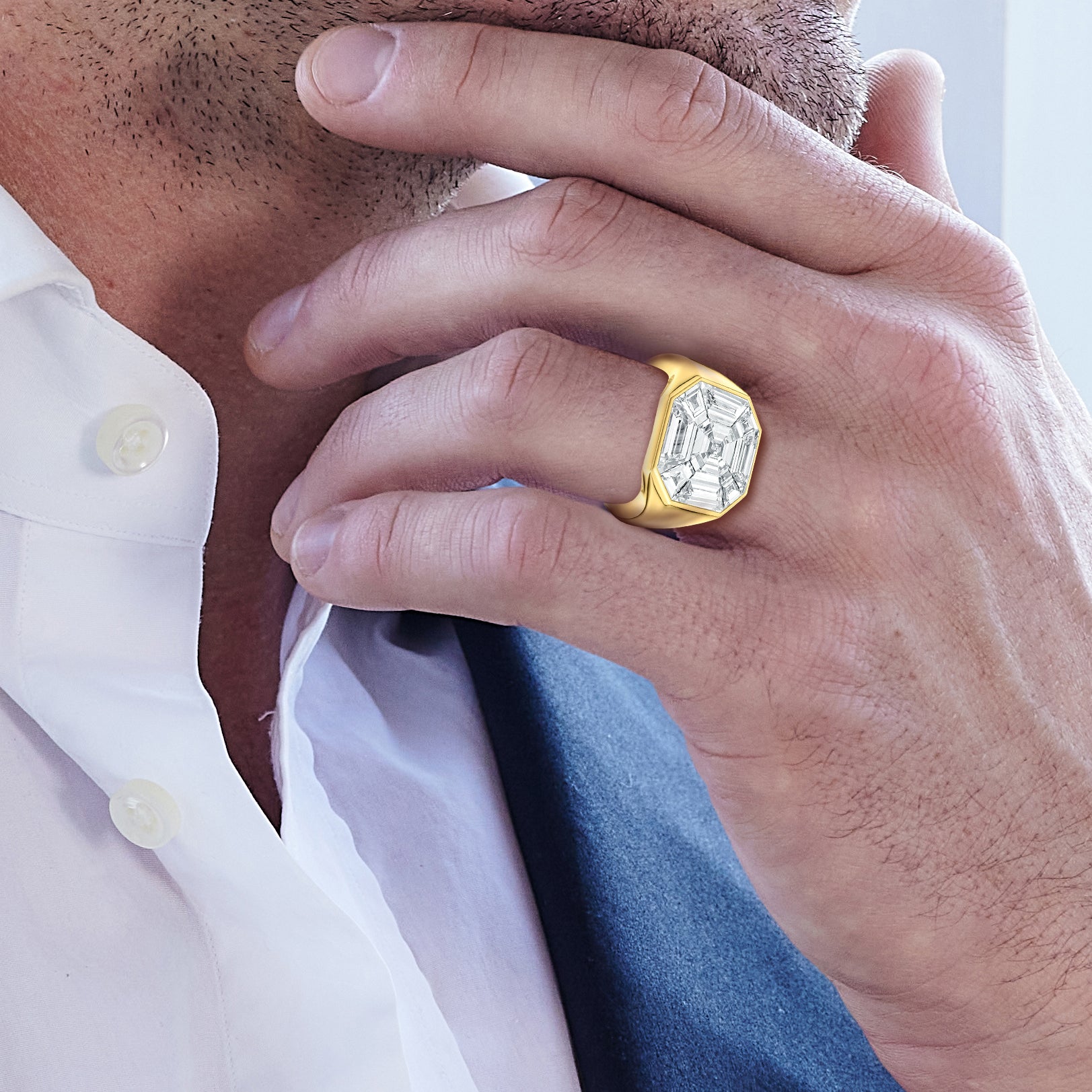 Designed for effortless luxury. Tapered trapezoid and baguette diamonds come together to embrace an Asscher center stone, maximizing light reflection for a striking shine. The eight-sided frame gives the ring an edgy, sculptural look.