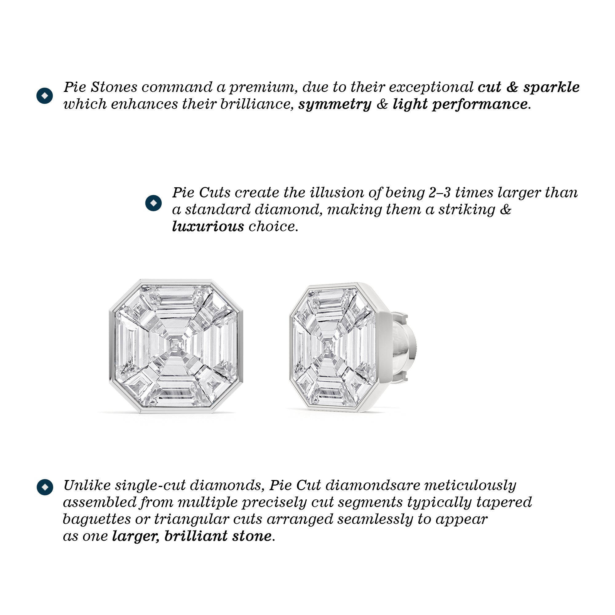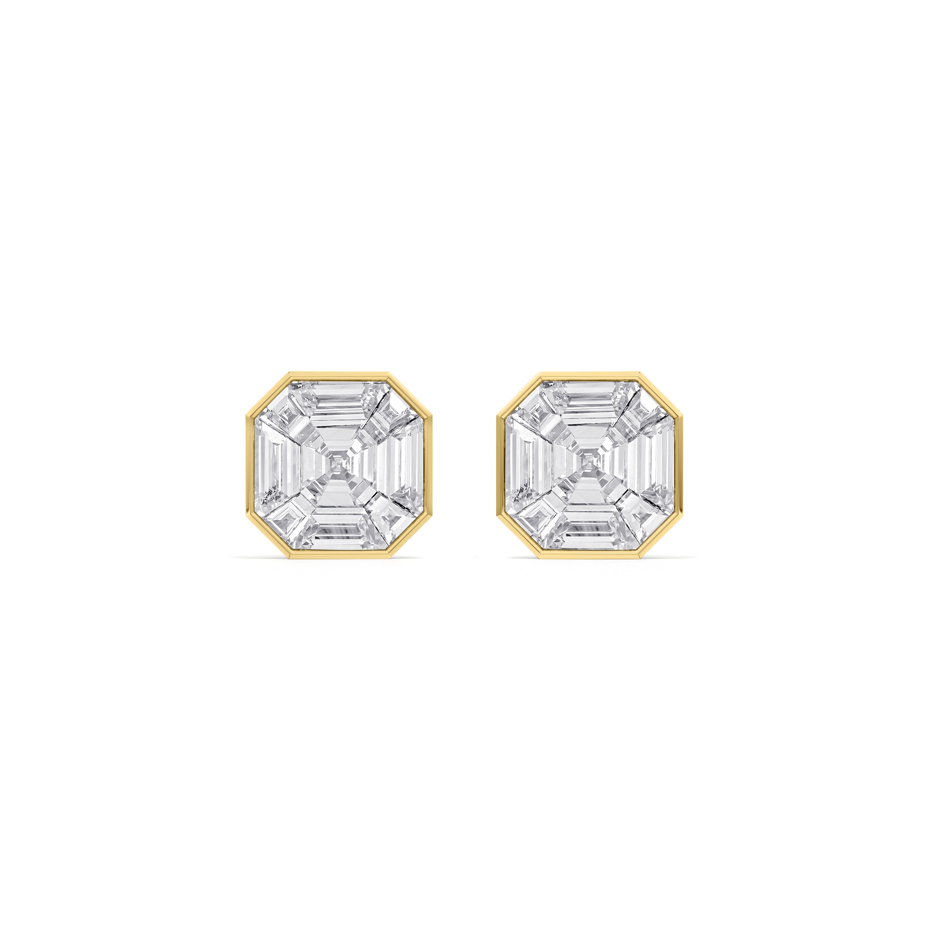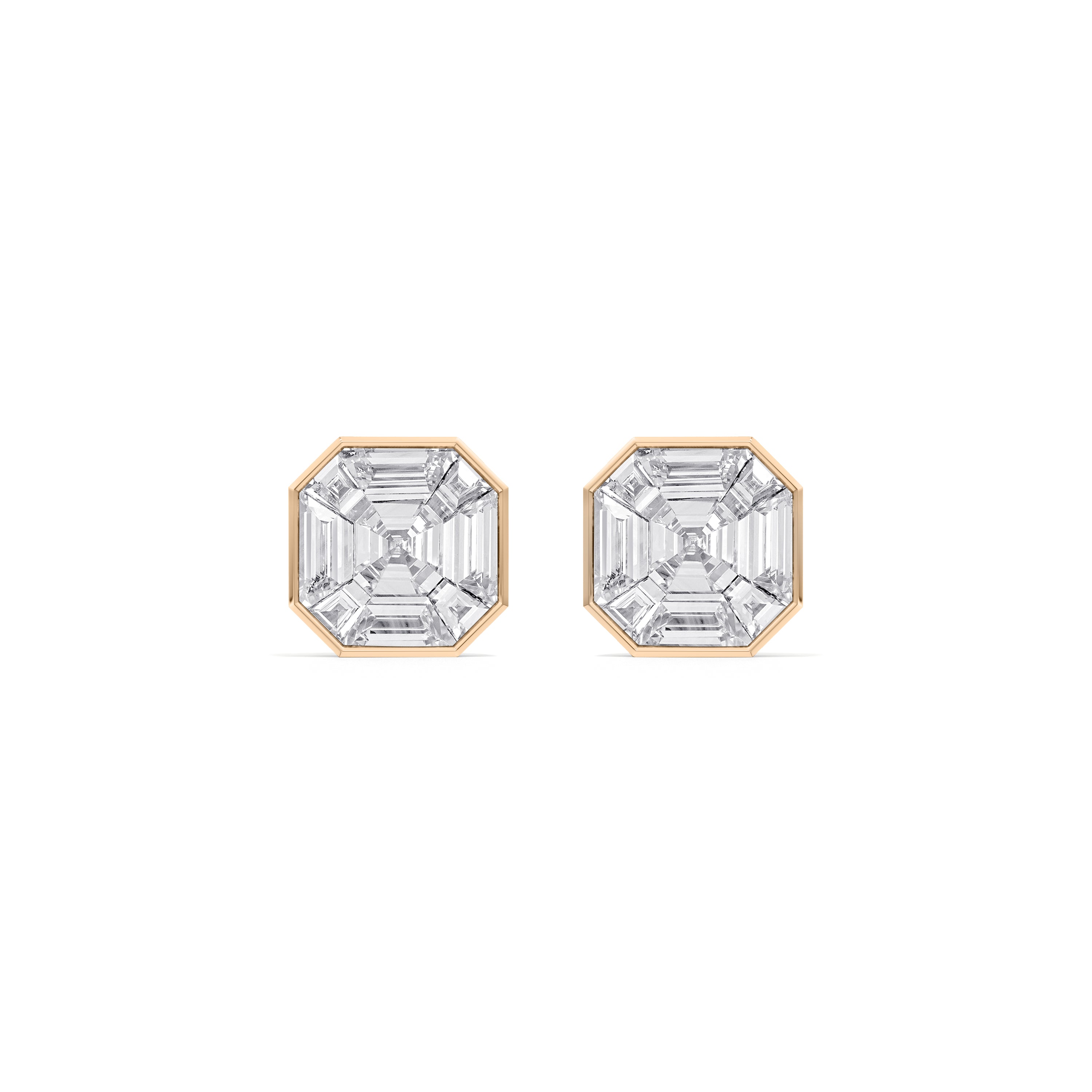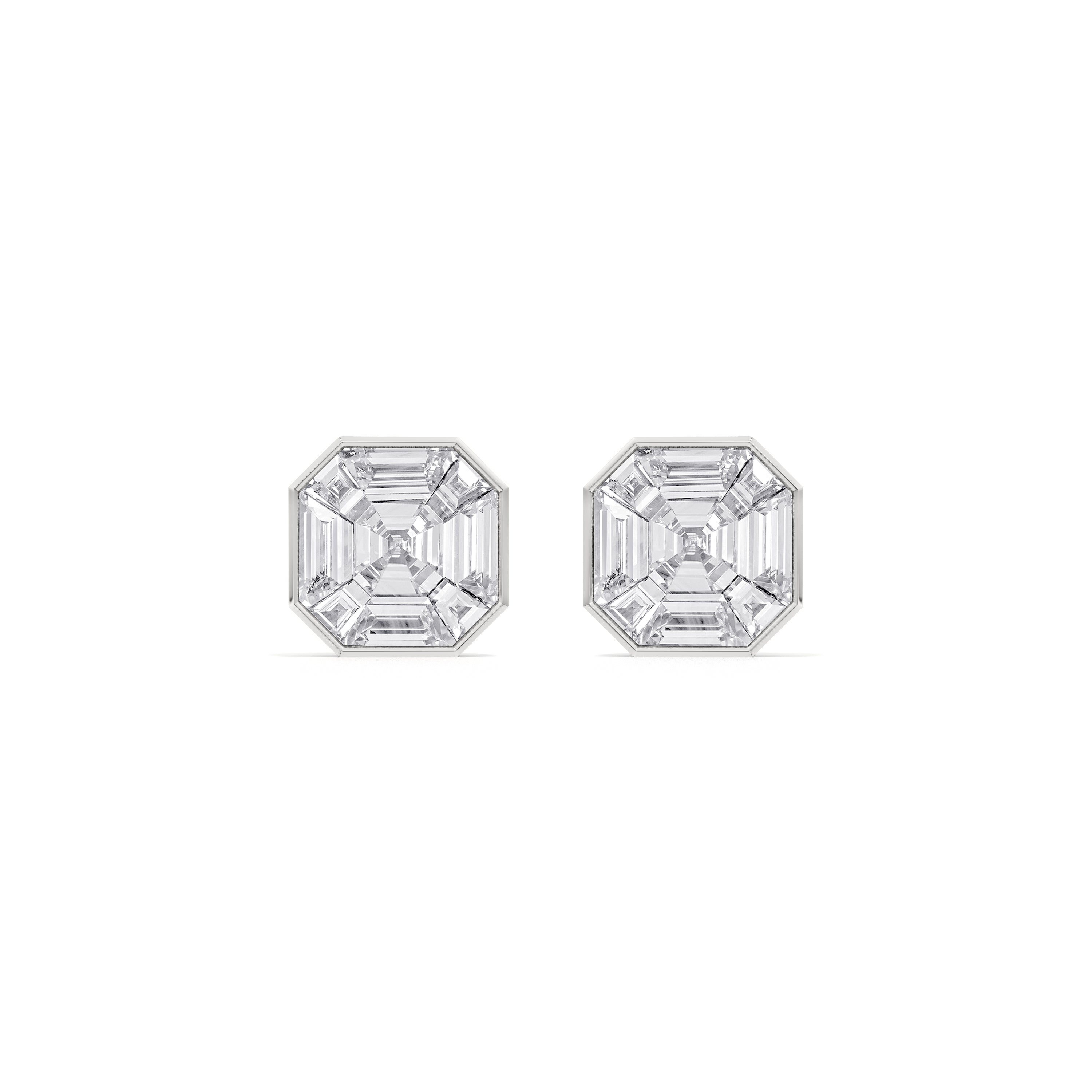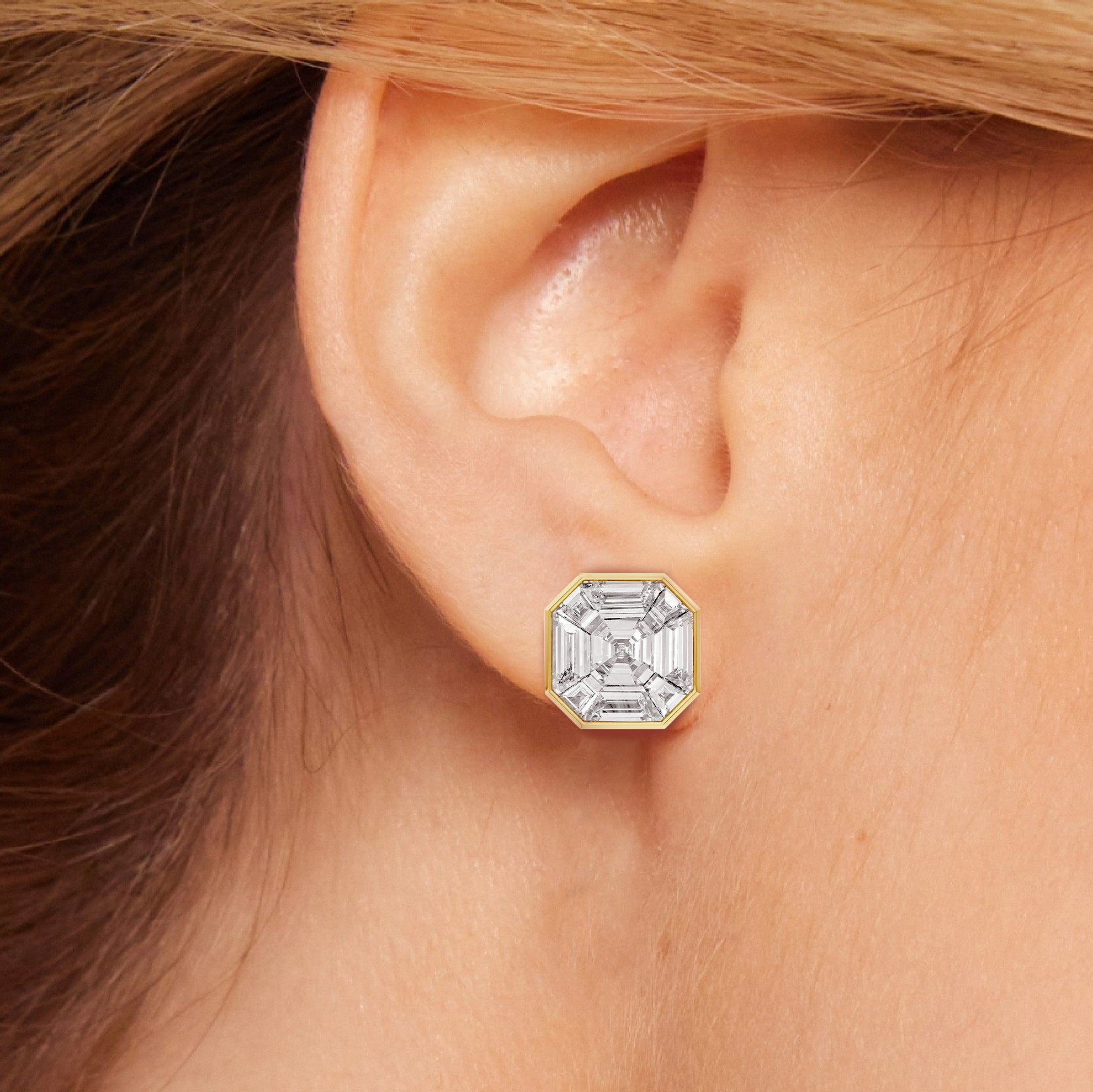 These studs present a balance of structure and fluidity. Tapered baguette and trapezoid diamonds envelop an Asscher central diamond, creating an illusion of a larger stone with an impressive presence. Expect timeless allure from the geometric elegance of this design.