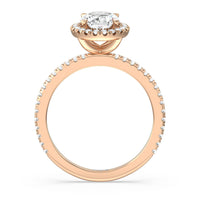 This beautiful engagement ring features pave set diamonds on the halo and along each side of the shank, highlighting the center stone perfectly. Set in gold.