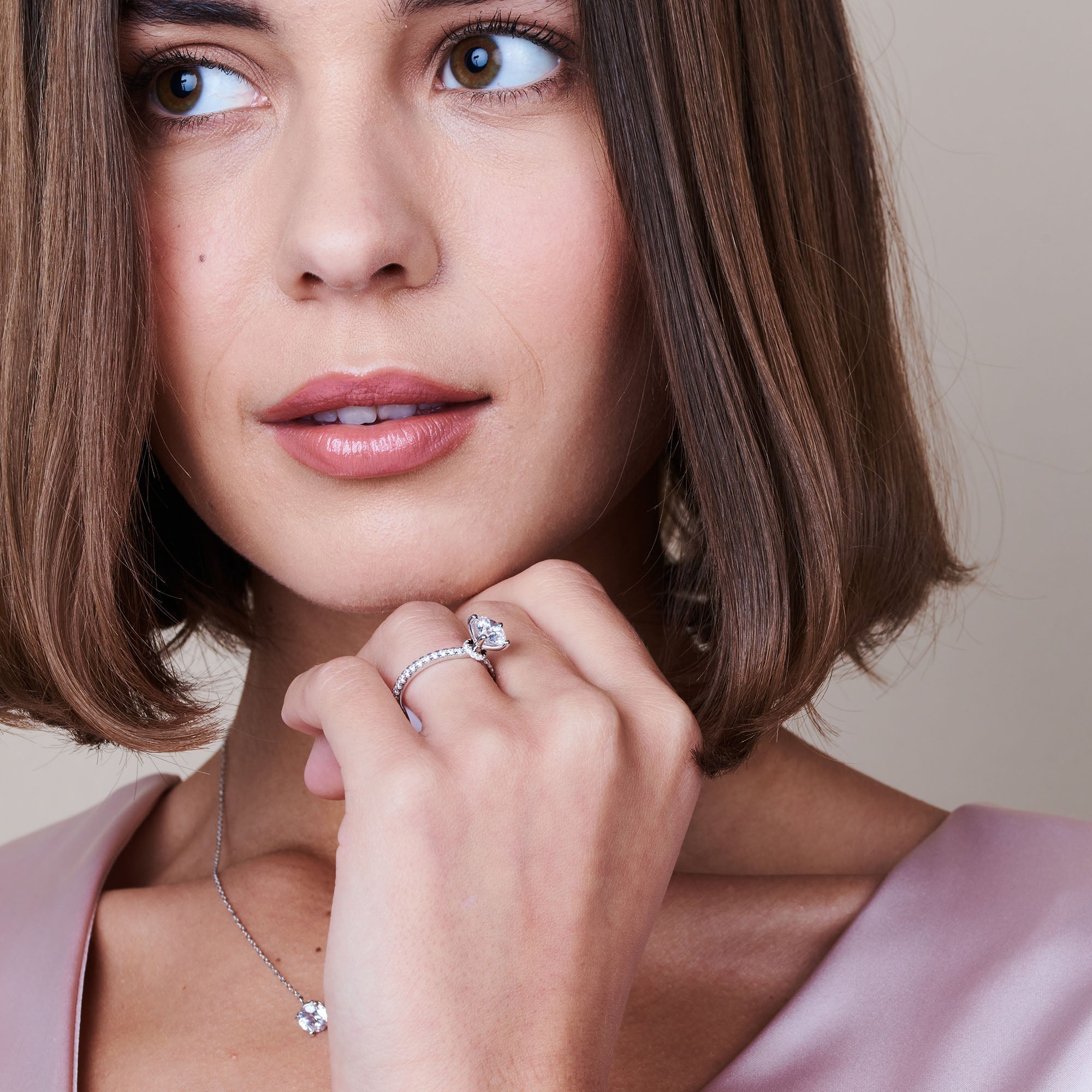 A sparkling ring style that showcases the center diamond with diamonds in a modern love knot design encircling the bottom of the diamond.