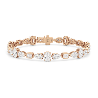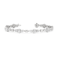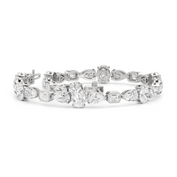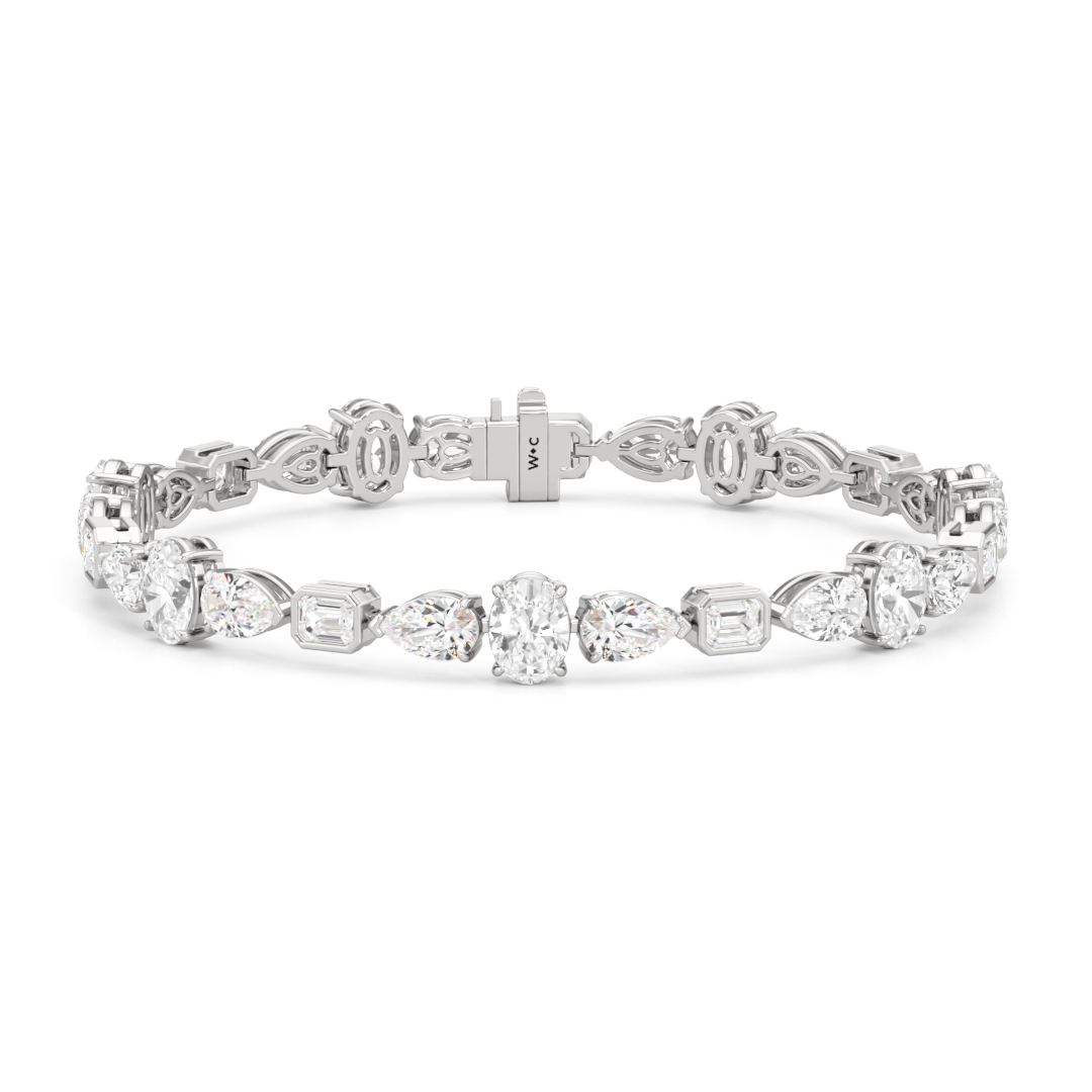 Embellished with high-quality diamonds, this tennis bracelet dazzles with intense brightness. It features bezel-set emerald-cut diamonds, claw-prong set oval diamonds, and claw-prong set pear diamonds all arranged in an intriguing geometric pattern. Make a statement in any room you walk into with this luxe piece of jewelry.
