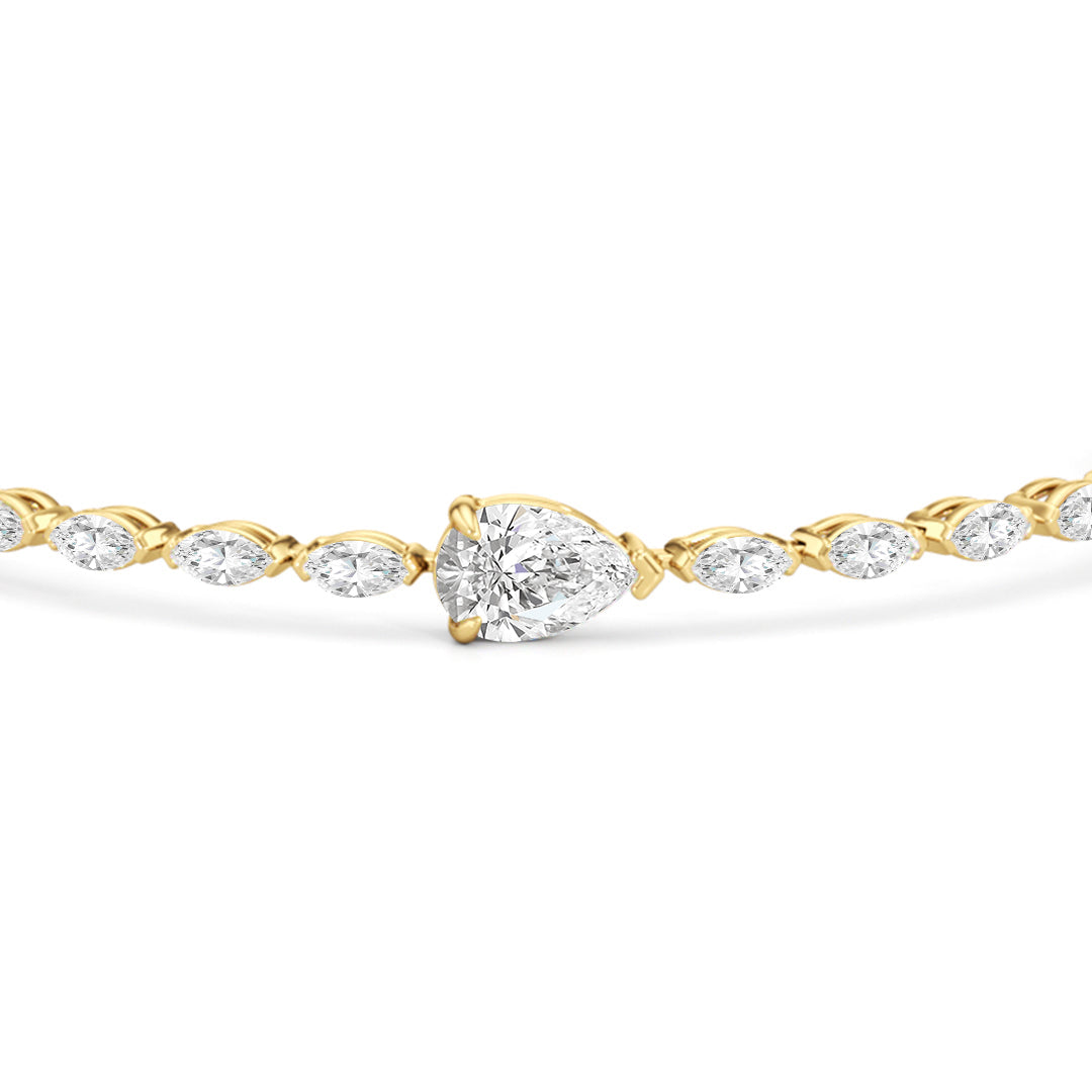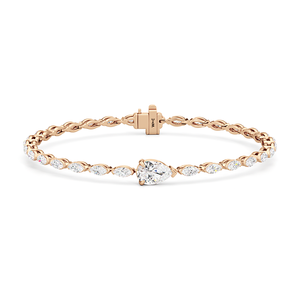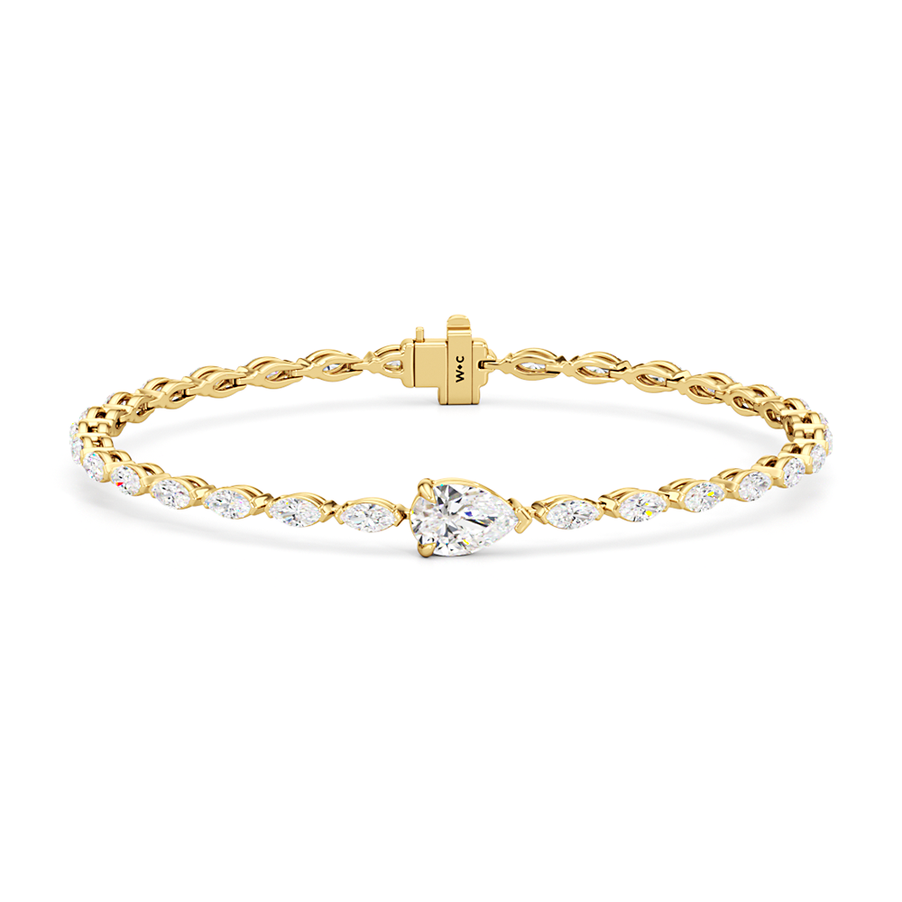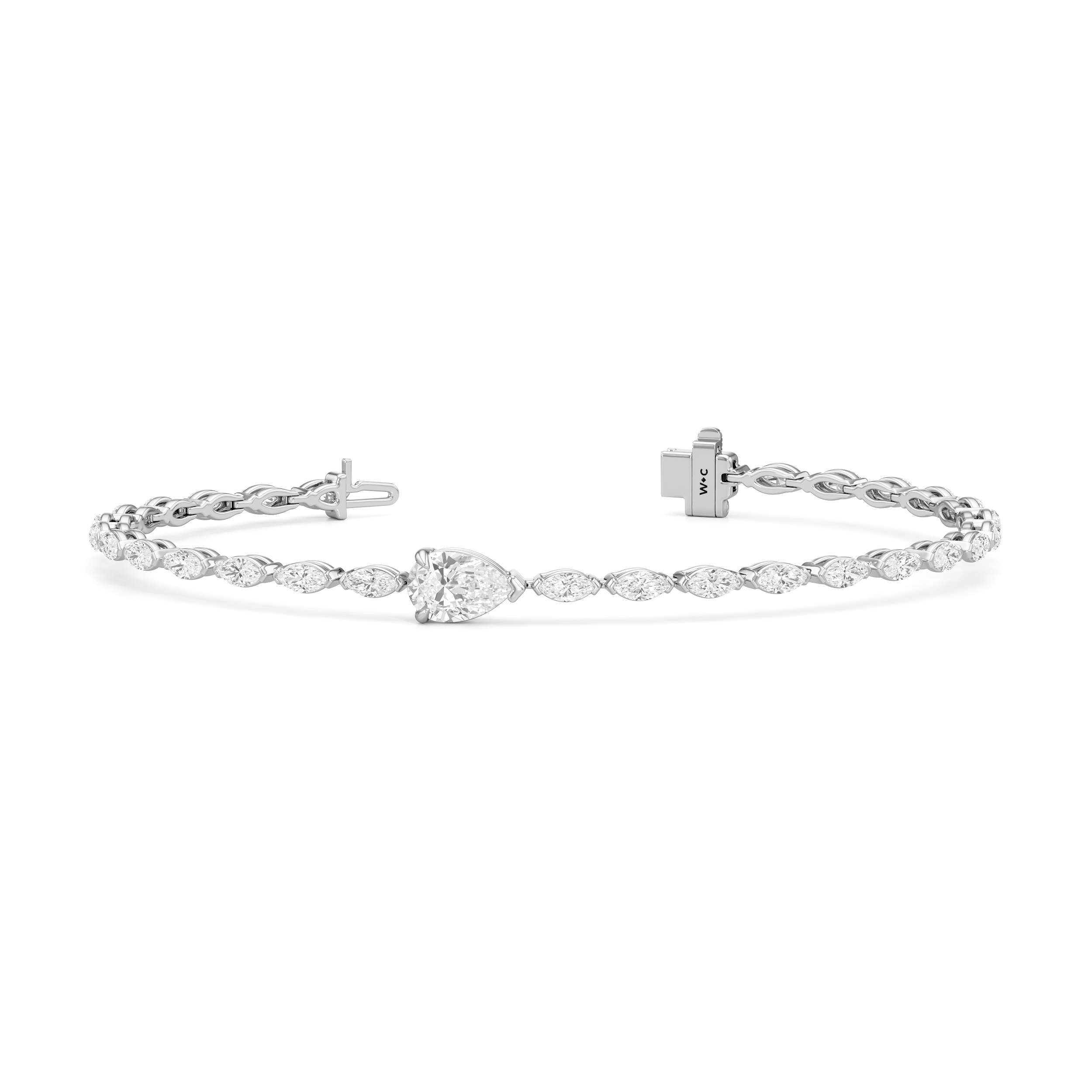 Composed of diamonds steeped in historical romance, this tennis bracelet is enchanting. The bracelet features marquise diamonds arranged in a single row. For a subtle yet striking contrast, a pear diamond marks the center of the diamond line.