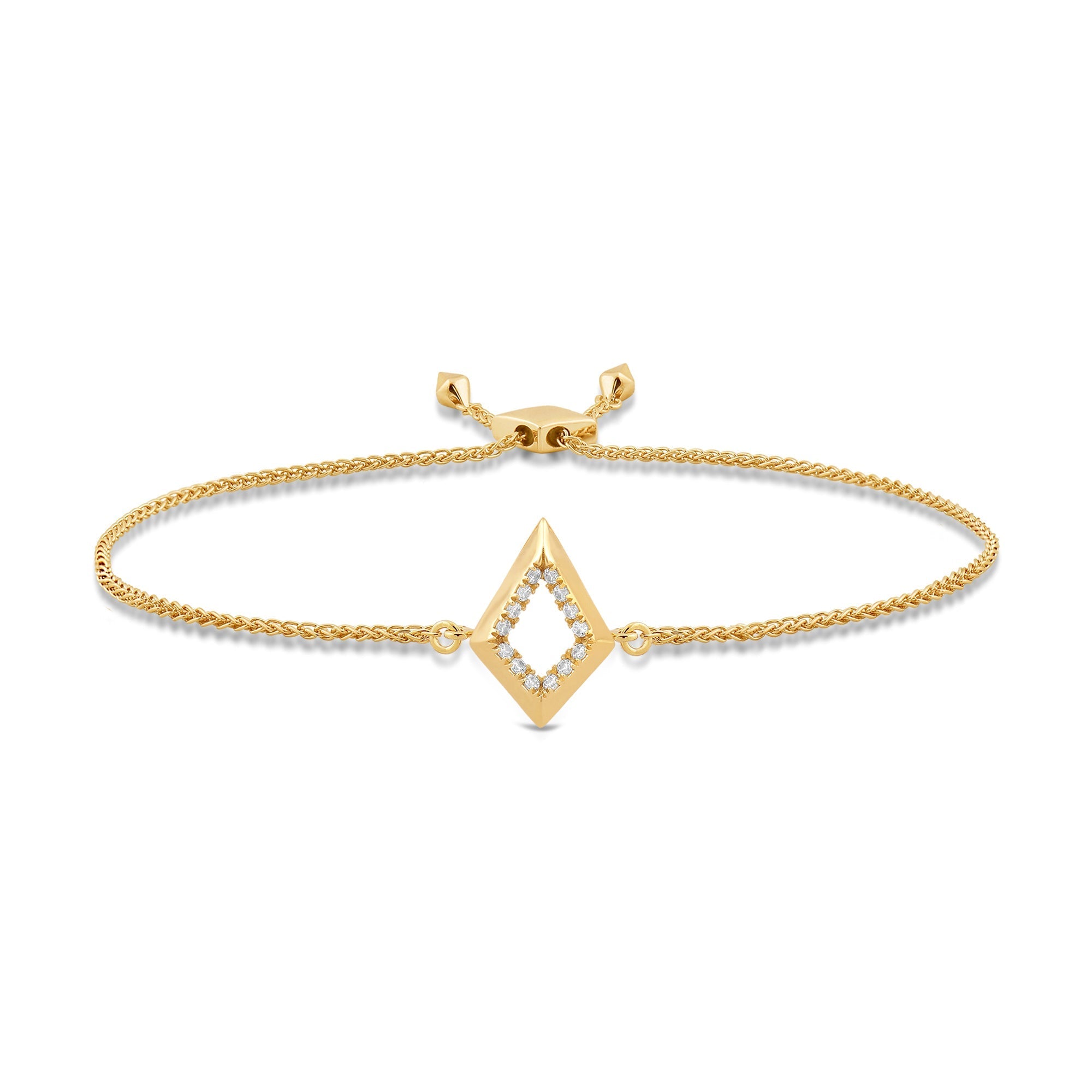 Looking tidy and chic, this trend-forward geometric bracelet will complement just about any outfit. The bolo bracelet features a kite-shaped accent in cut-out form where the inner outline is traced by petite diamonds. This yellow gold adjustable bracelet is secured by a sliding pulley clasp so it will fit your wrist exactly how you want it to.