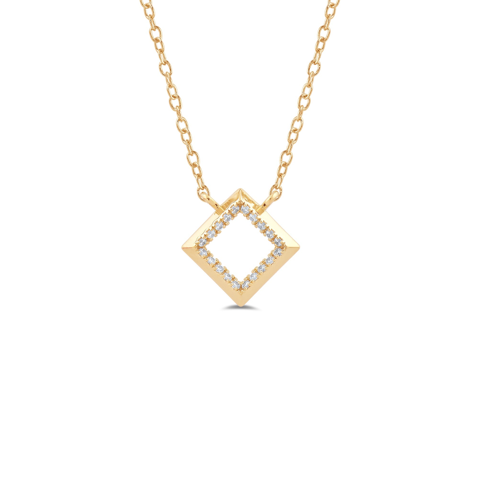 Simplicity is always in - and this necklace tells us just that. This yellow-gold piece features a petite quadrilateral pendant inspired by a kite. It has a cut-out silhouette where the inner outline is adorned with round diamonds. Add this to your everyday fine jewelry collection and let it bring some sparkle and style to your daily ensembles.