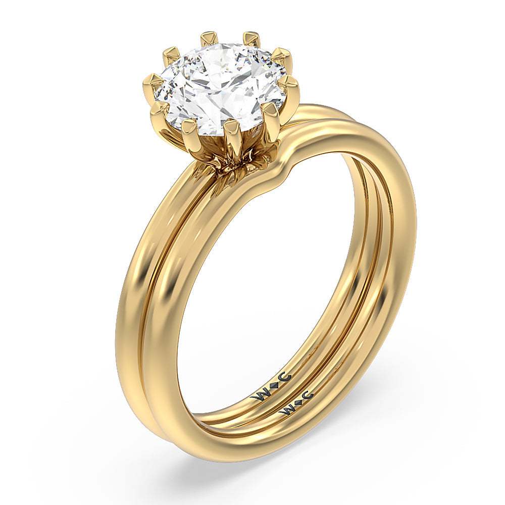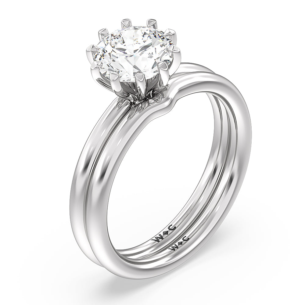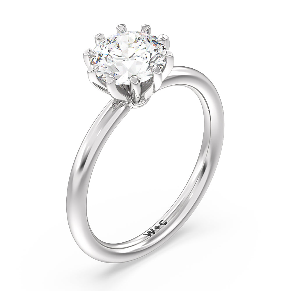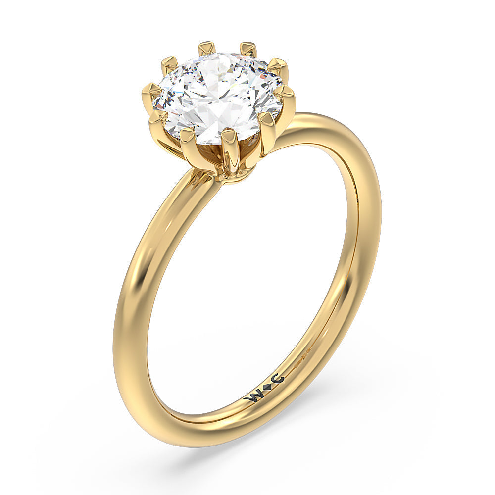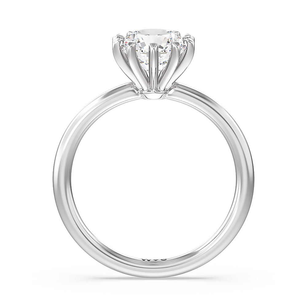 A classic yet uncommon engagement ring. This chic and charming sparkler has a petite band topped with a striking center diamond held firmly in place by ten prongs. The ultra-secure setting provides protection for the center gem while also delivering a modern vintage vibe to the ring.