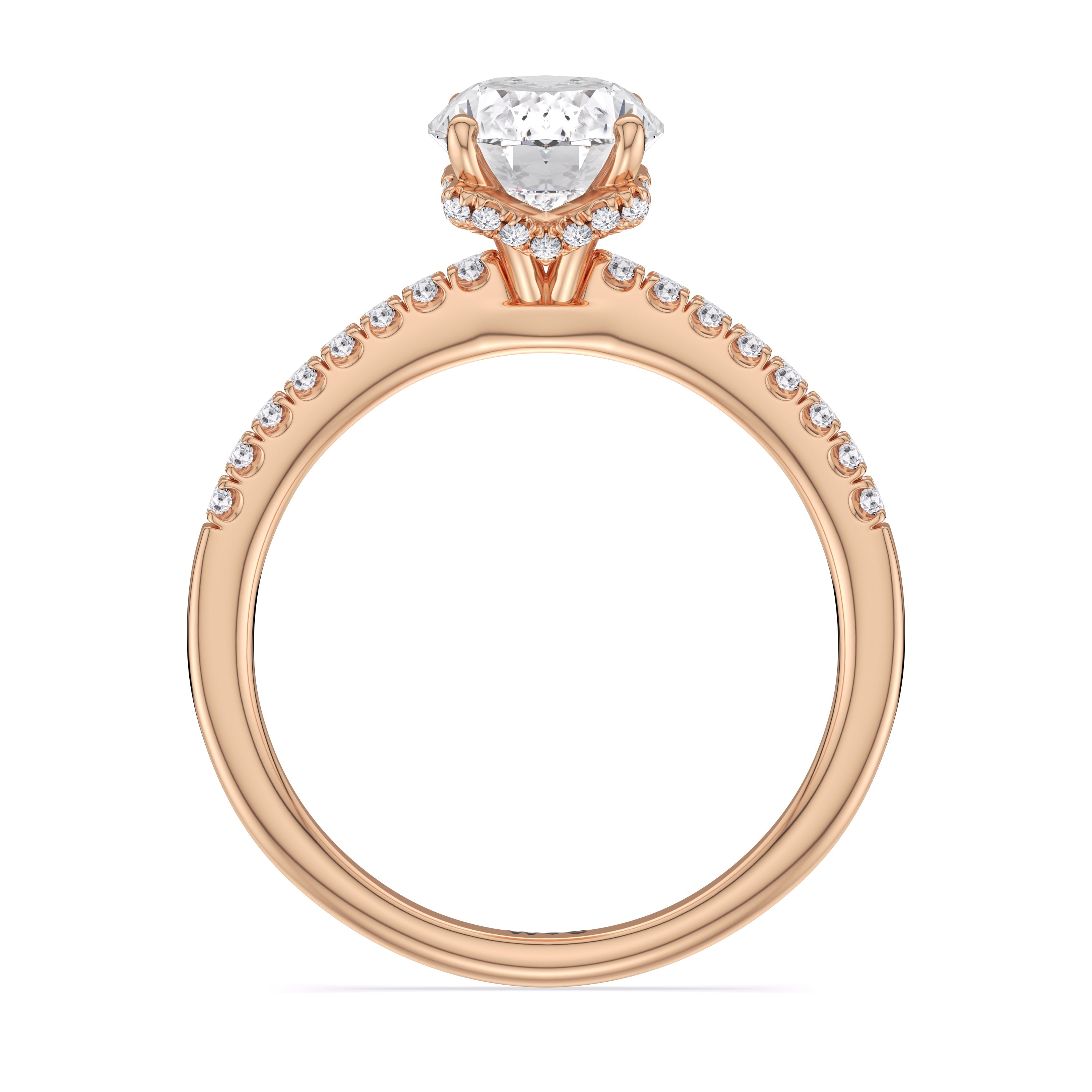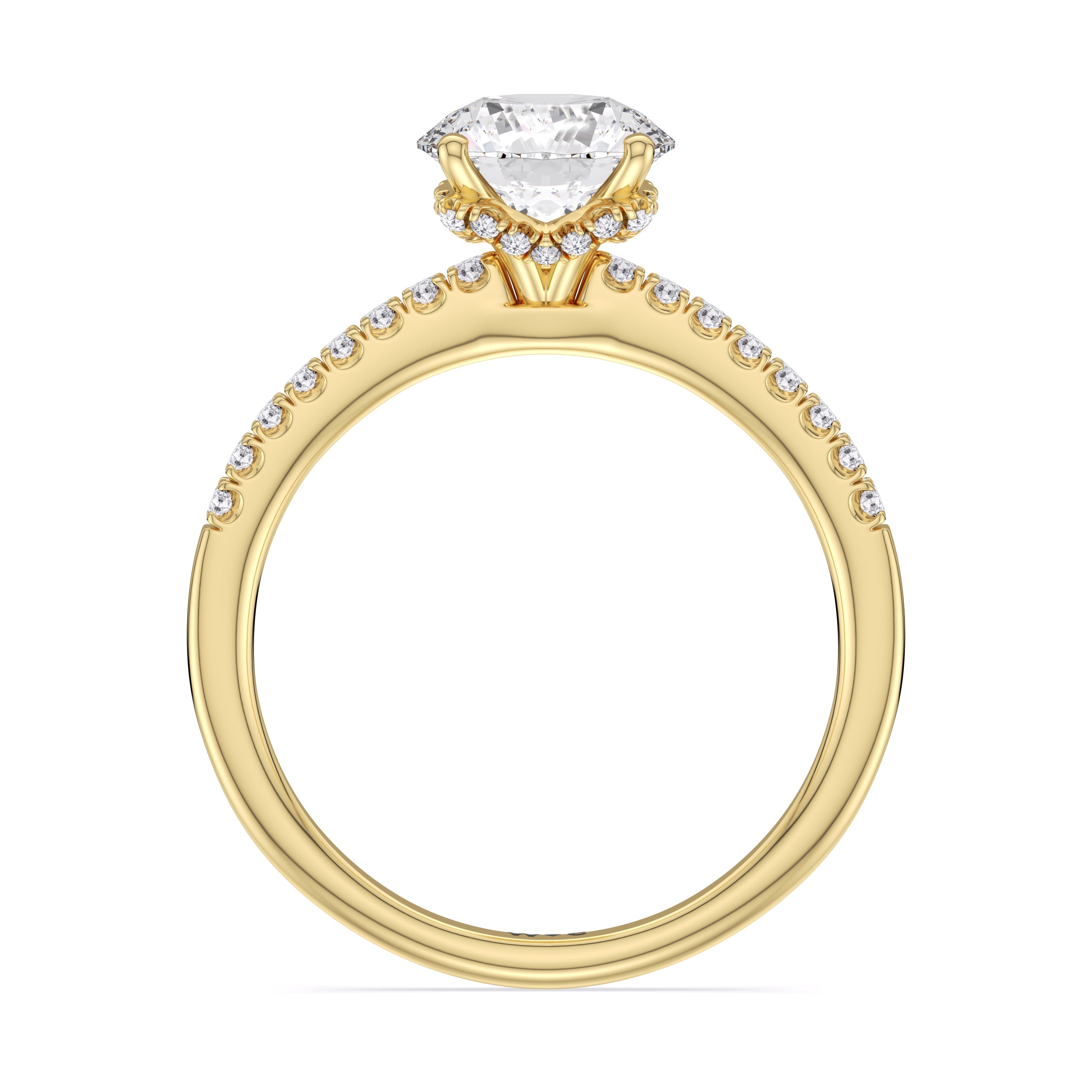 This sophisticated engagement ring features our signature arc hidden halo design along with a diamond pave band to highlight the center stone perfectly! A modern take on a classic style.