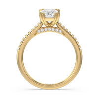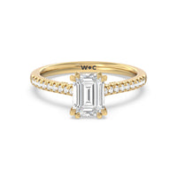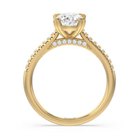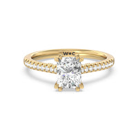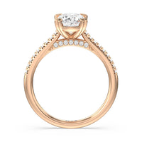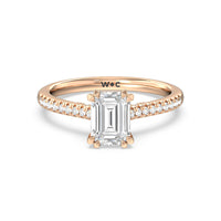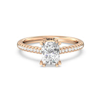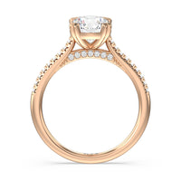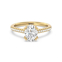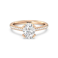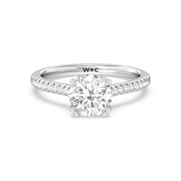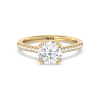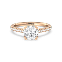 A classic double claw gives this solitaire ring an alluring vintage like beauty. The front view also has a sparkling diamond studded bridge that glitters & shines as your fingers move.