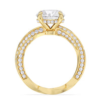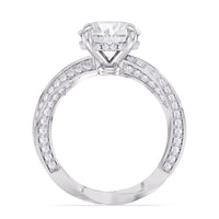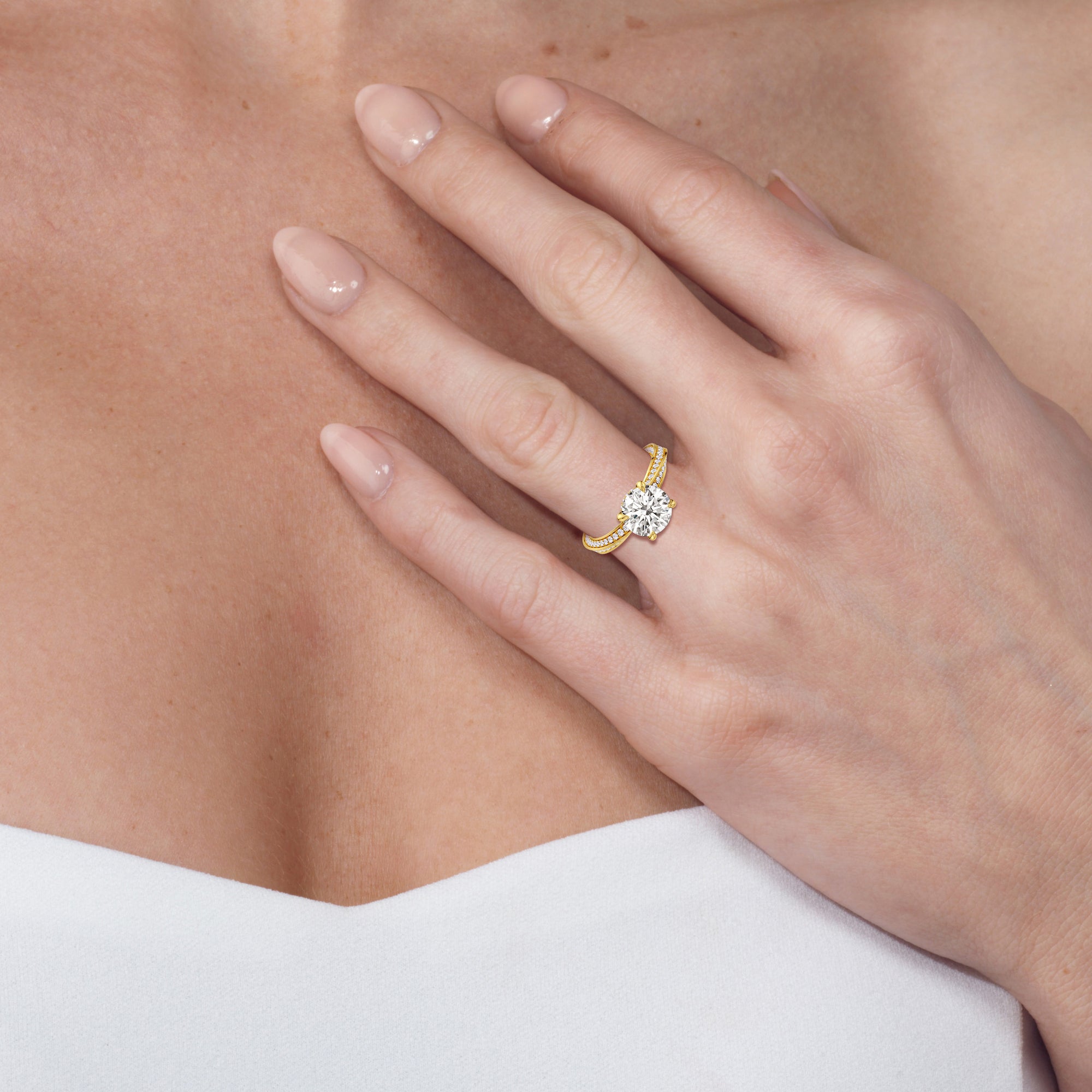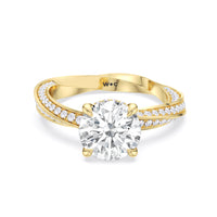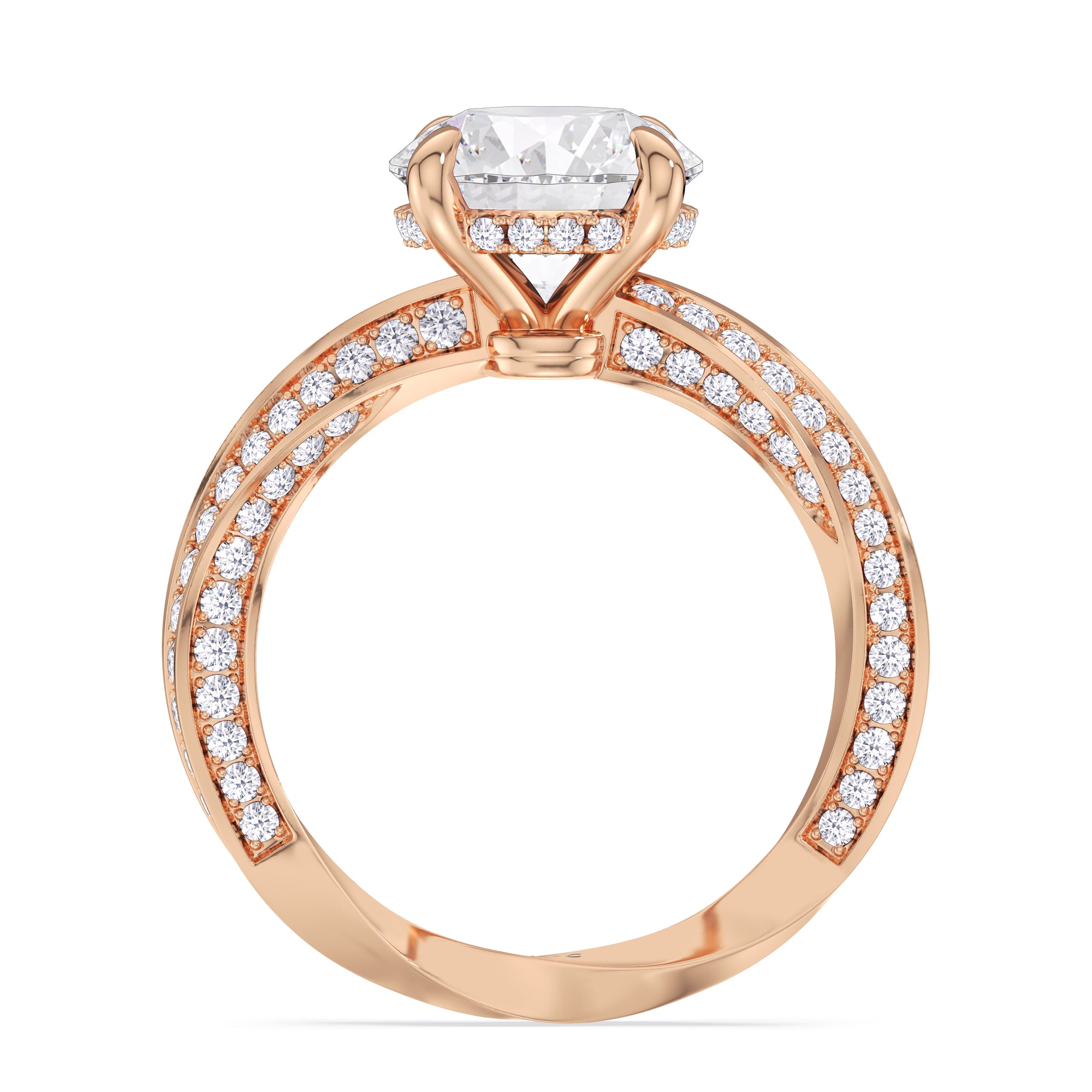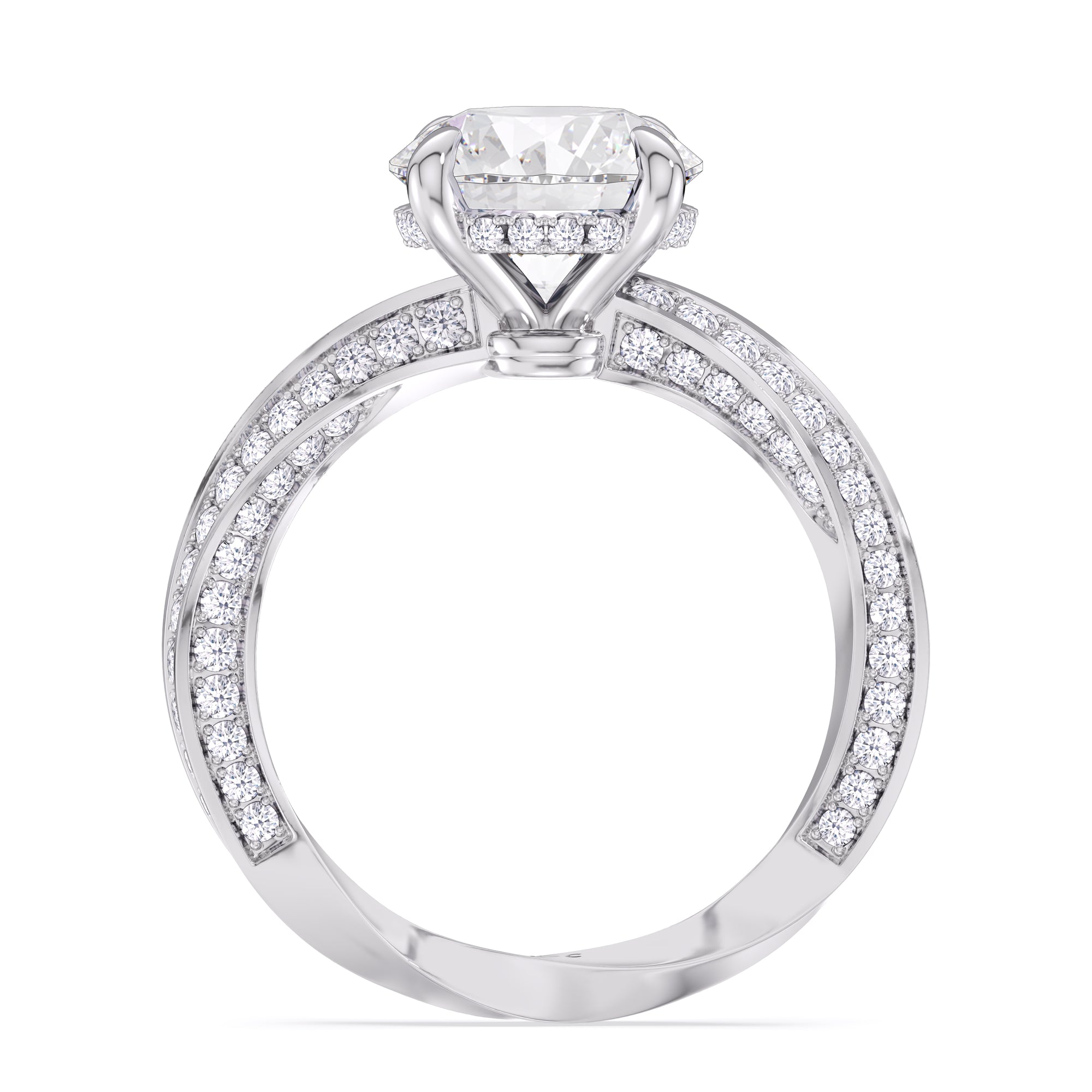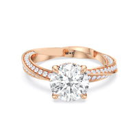 The Bond Engagement Ring is a sculptural tribute to eternal connection, drawing inspiration from our iconic With Clarity emblem. At its heart, a brilliant center stone is topped on the emblem’s signature geometry—a diamond shape nestled within a perfect circle—symbolizing unity and infinite love. The shank, an interpretation of the emblem’s form, takes inspiration from the infinite nature of a Möbius loop, creating a seamless, continuous flow of precious metal. Adorned with micro-pavé diamonds, its elegant curves catch the light from every angle, enhancing the ring’s radiant brilliance.