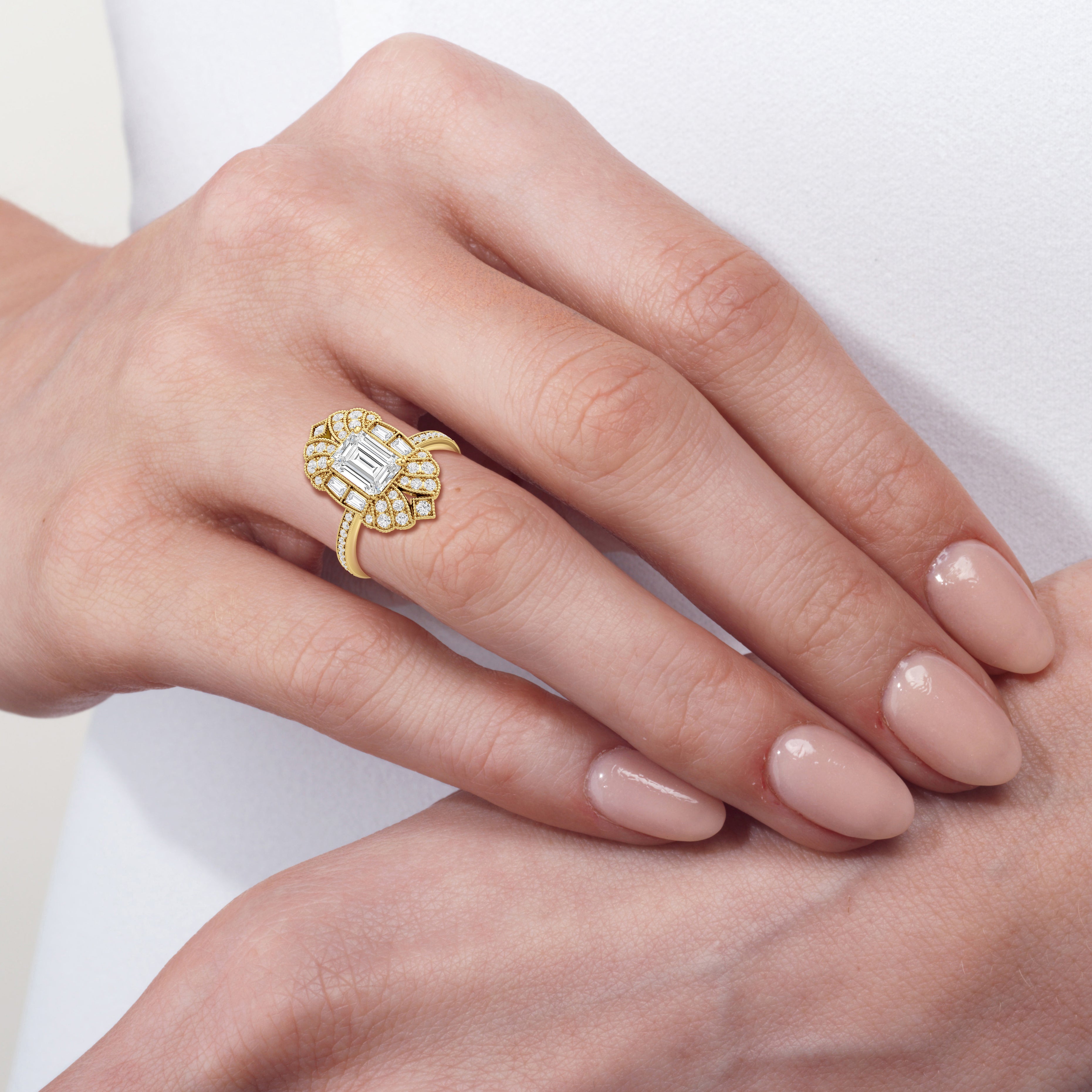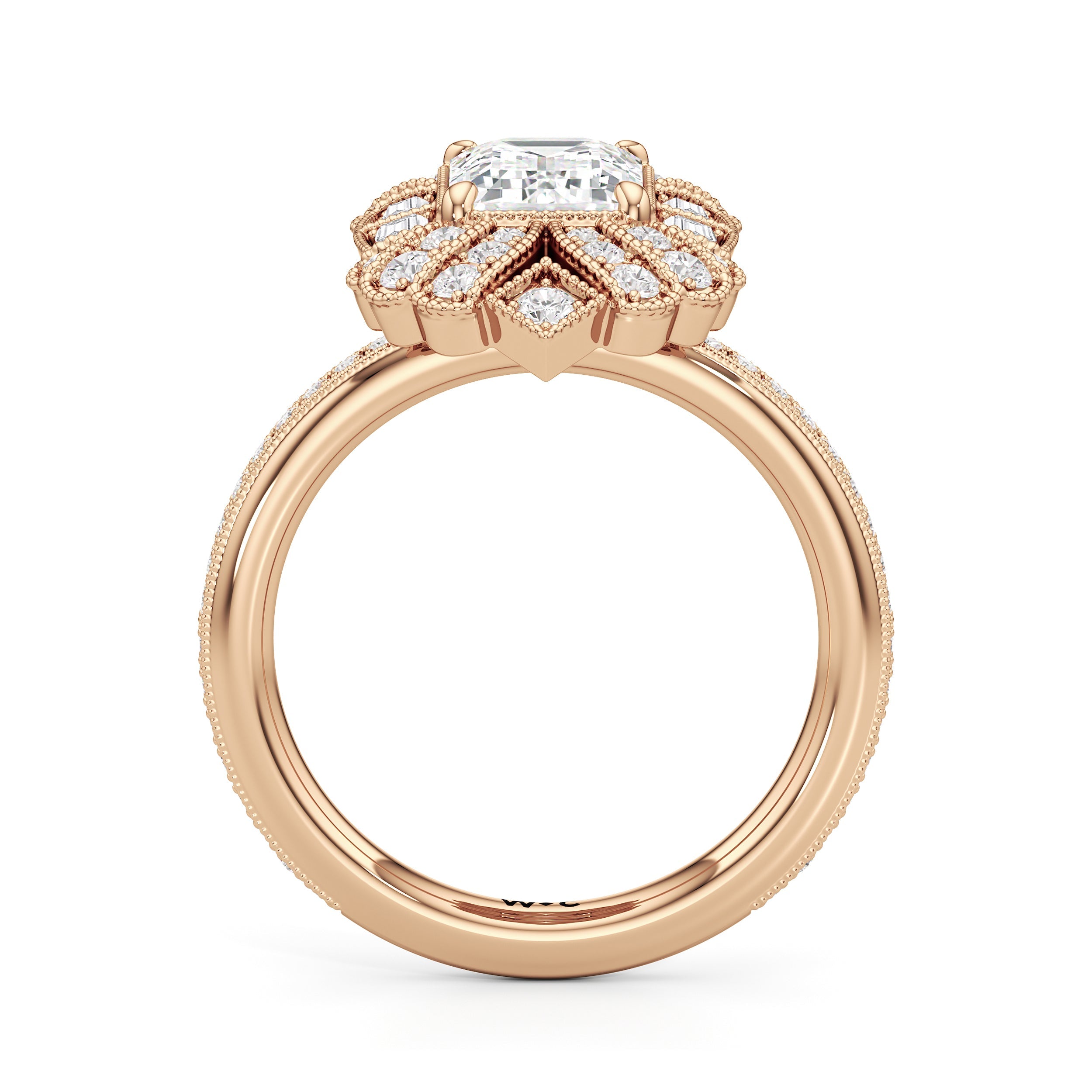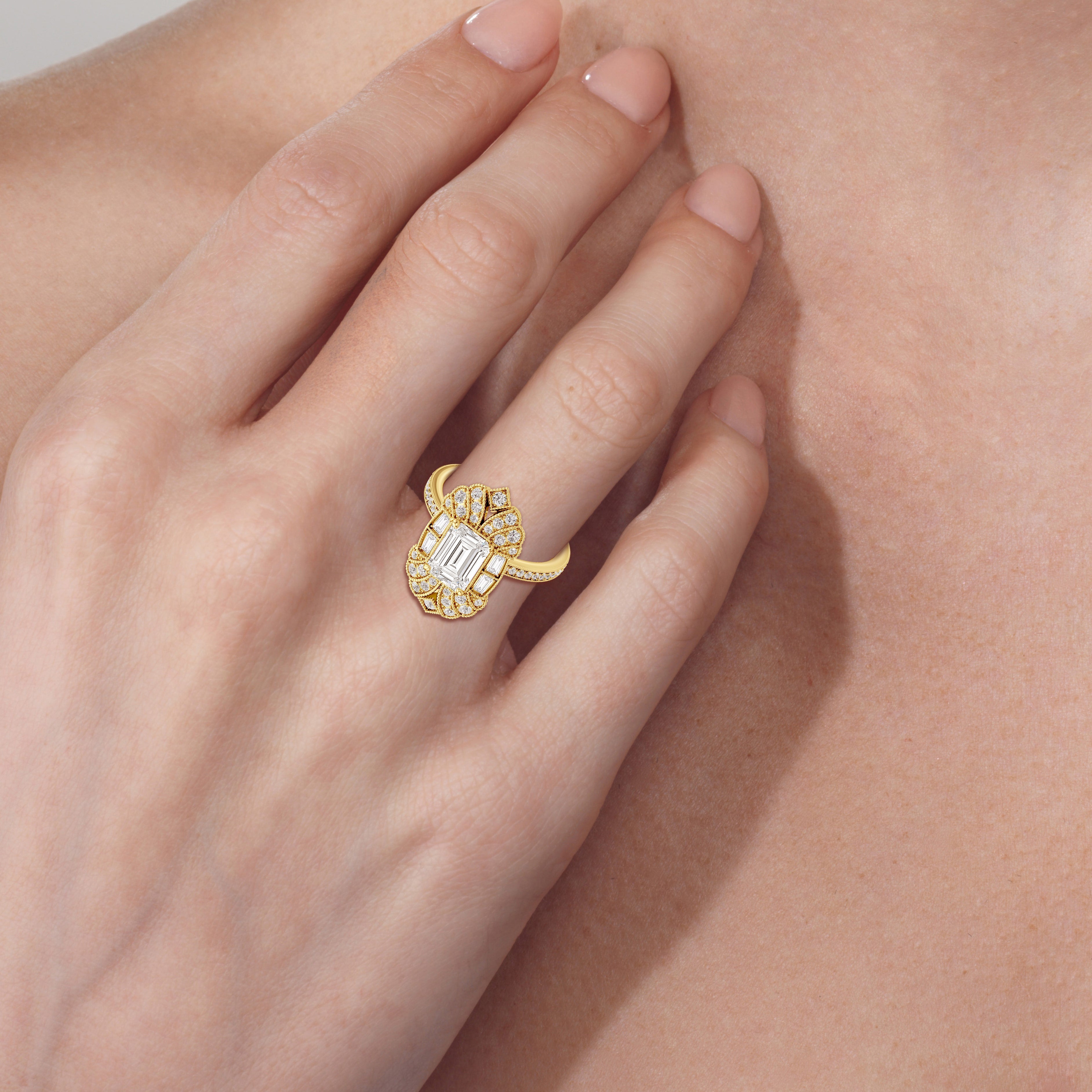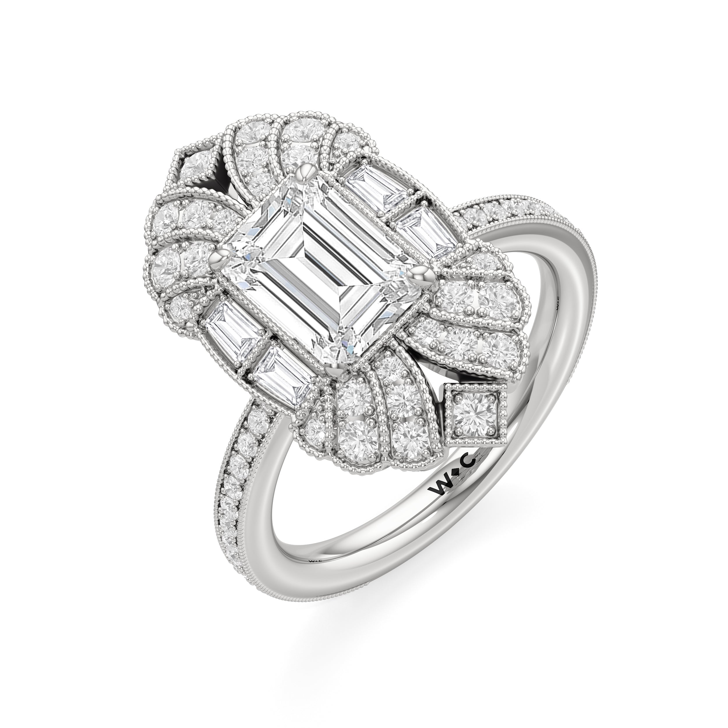A ring that reflects the transition from Art Nouveau to Art Deco, this ring features a combination of graceful fluidity and sleek, streamlined forms. Its design is in early Art Deco architecture, with curved outlines softening the sharp geometry of the step-cut centerstone and side stones. The curved silhouette of the band and the centerpiece, detailed with milgrain borders and traced by round diamonds, shows how ornamental charm can be seamlessly fused with architectural precision.
