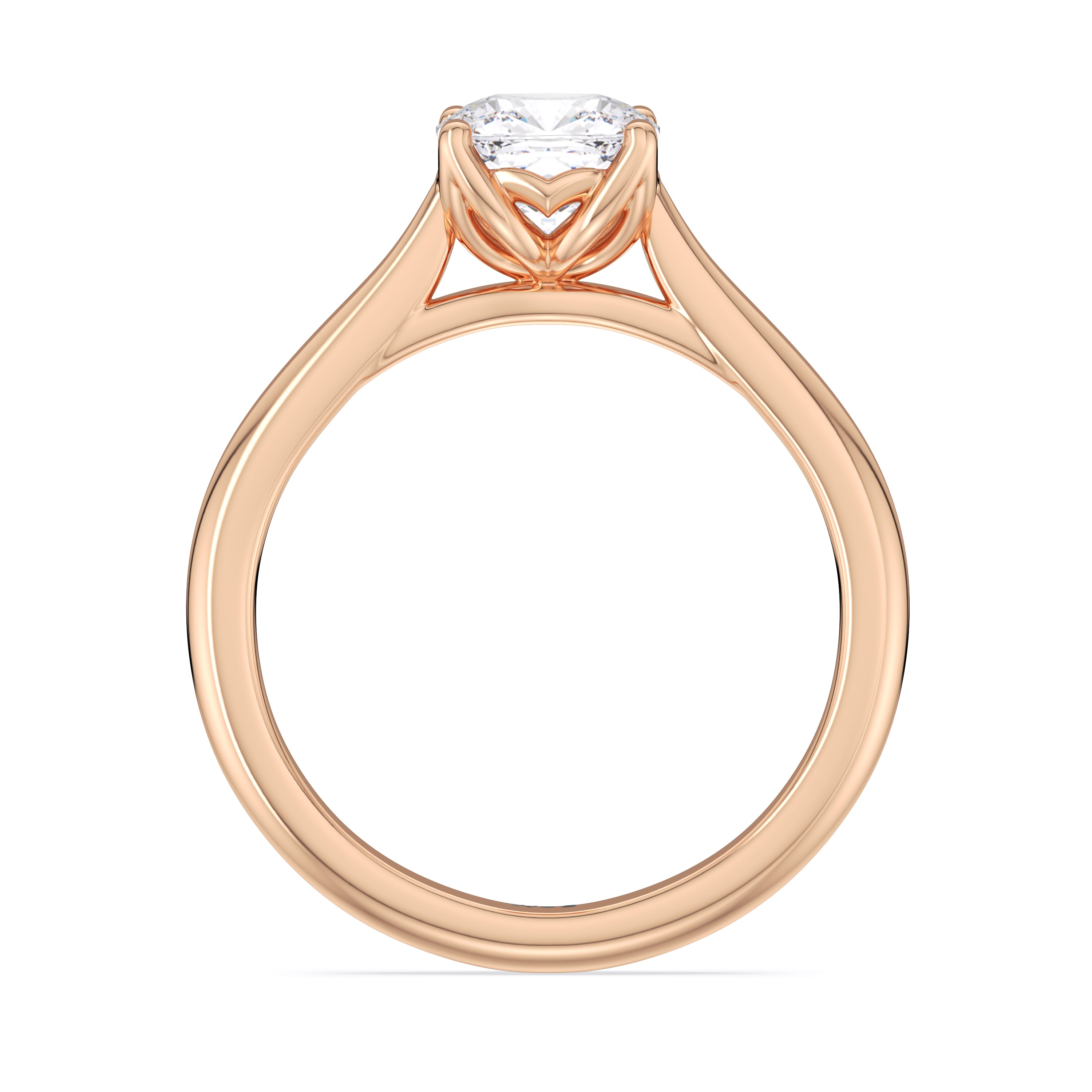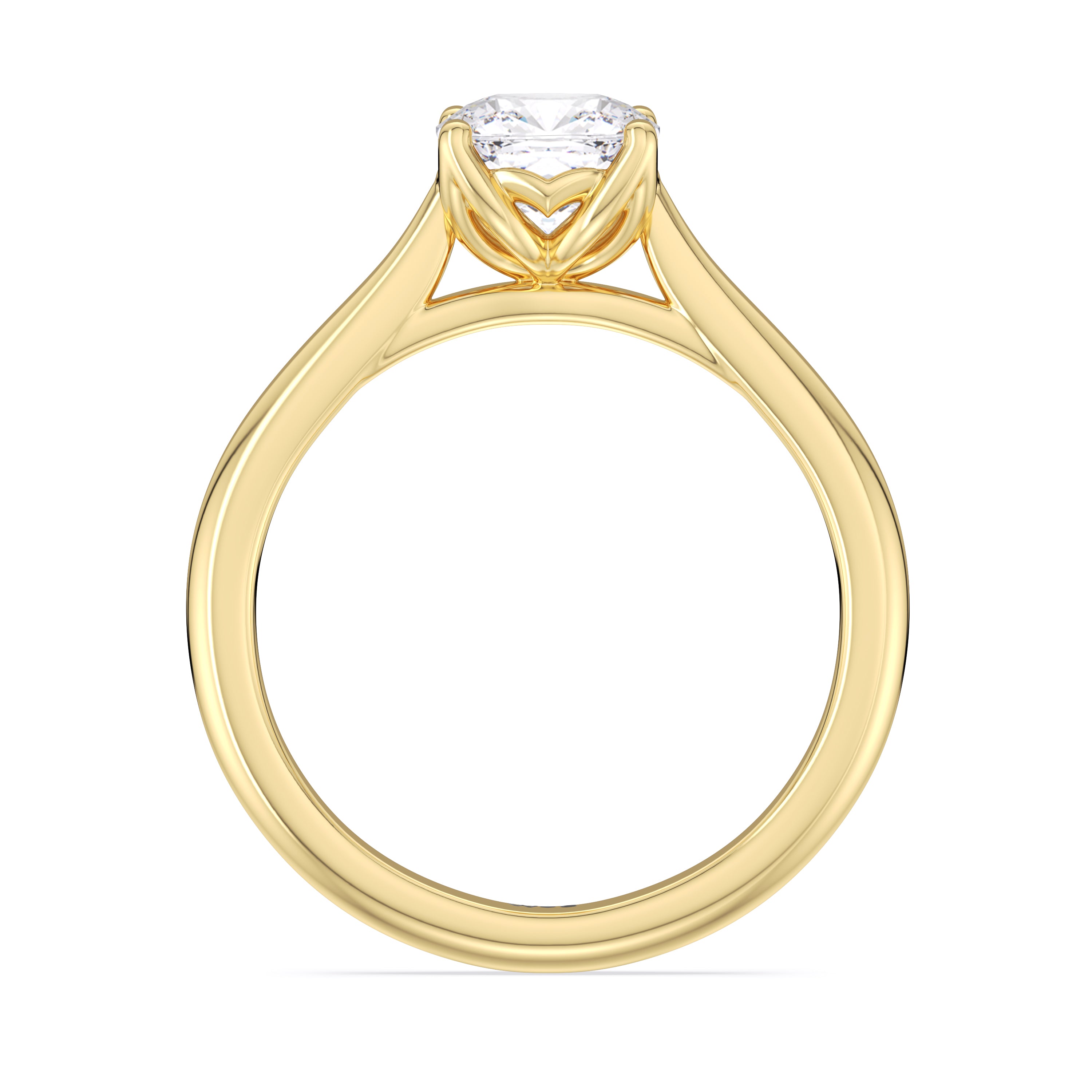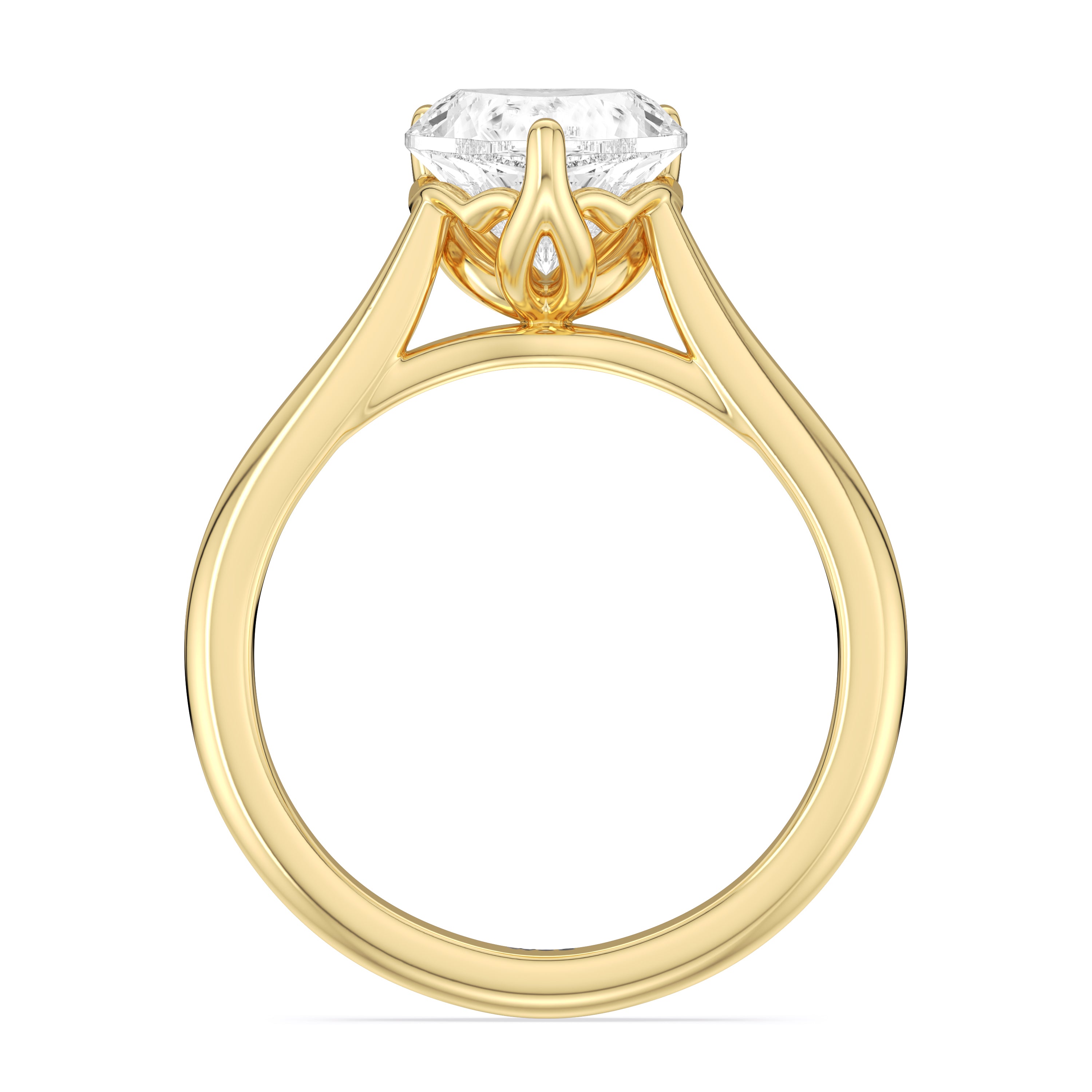 This ring exudes confidence with its stunning simplicity. Its single stone is nestled in a tulip basket and is effortlessly taking the spotlight. A chic tapered band complements the solitary diamond's delicate beauty.