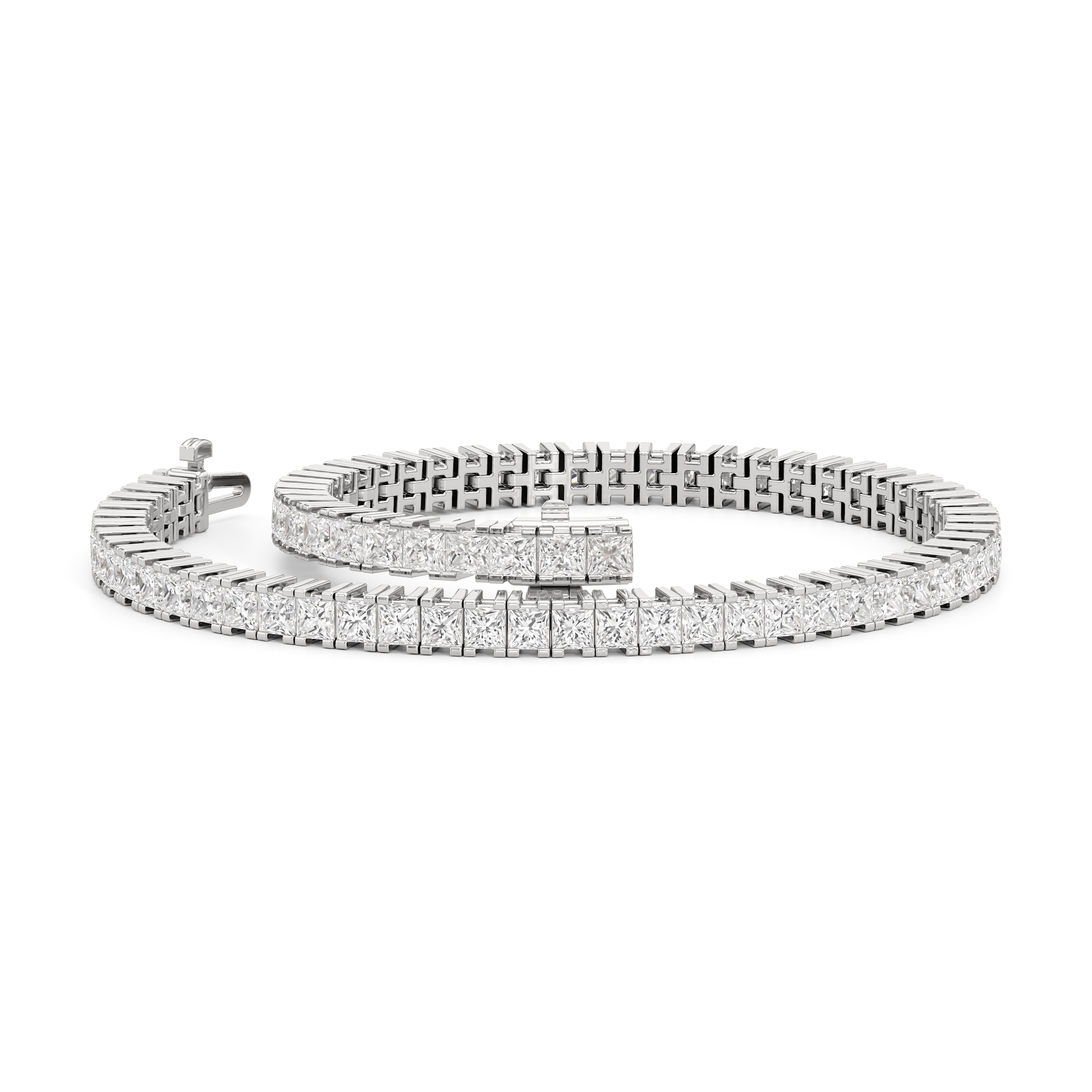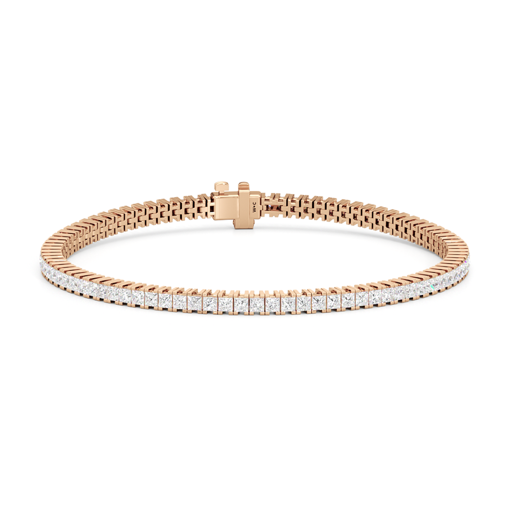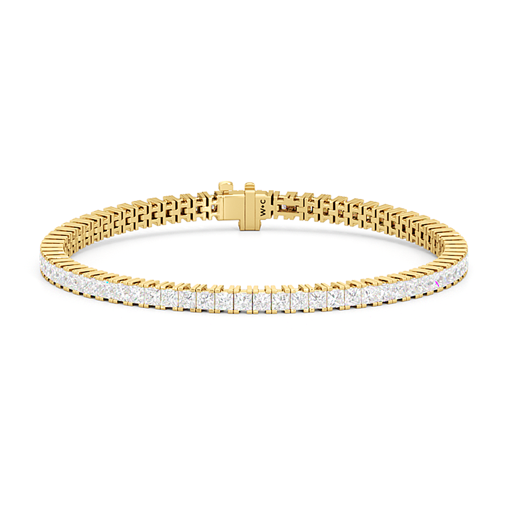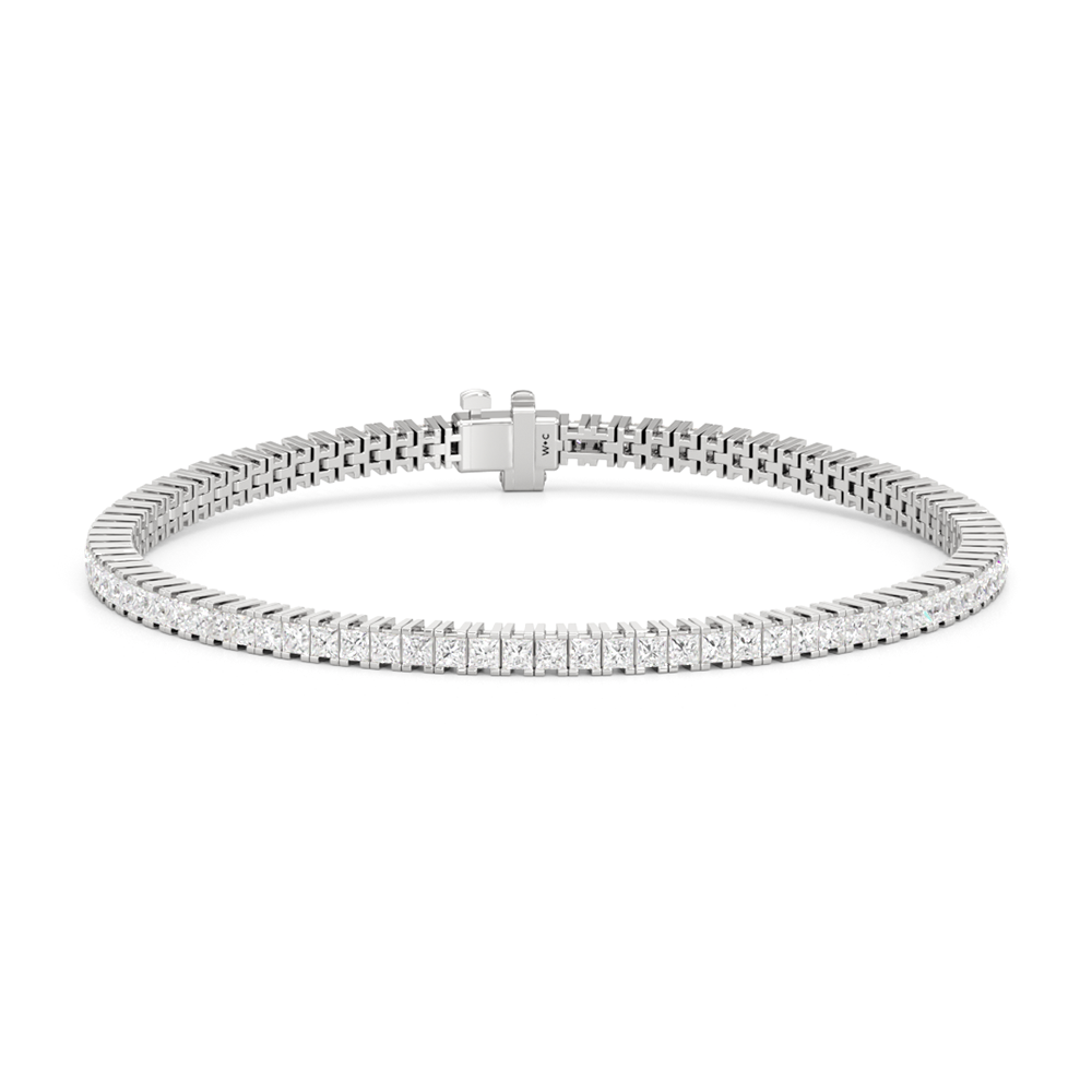 A diamond tennis bracelet that will wrap nicely around the wrist. This piece features princess-cut diamonds on four-prong baskets that sit very closely together. The continuous, no-gap line of diamonds makes the prongs appear invisible and makes the diamonds' sparkle seamless and truly mesmerizing.