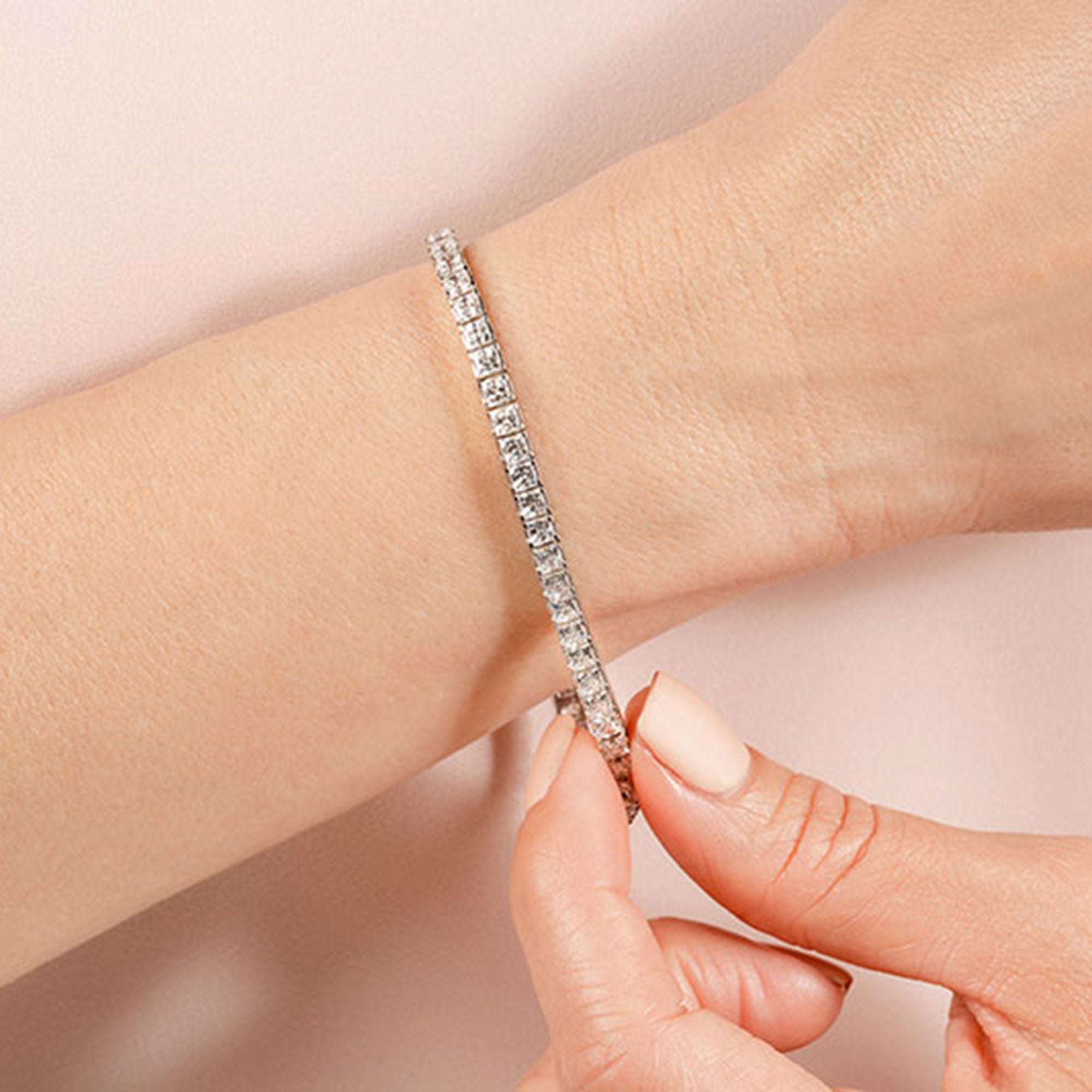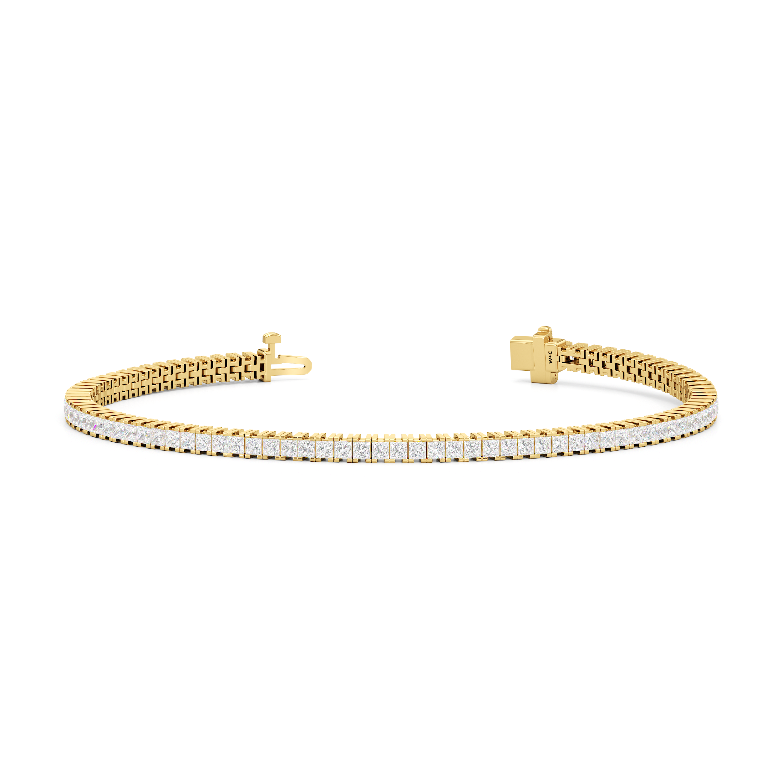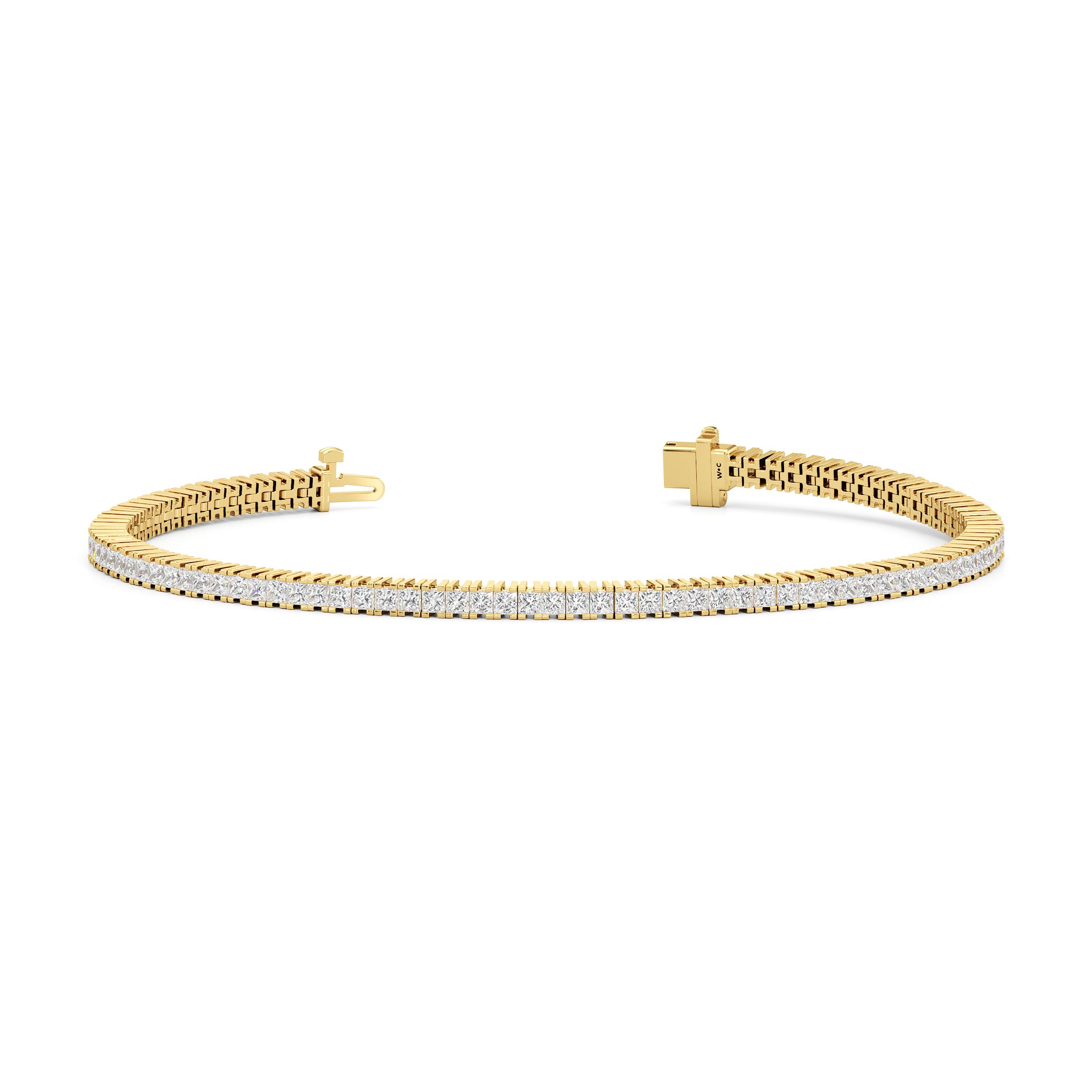 A diamond tennis bracelet that will wrap nicely around the wrist. This piece features princess-cut diamonds on four-prong baskets that sit very closely together. The continuous, no-gap line of diamonds makes the prongs appear invisible and makes the diamonds' sparkle seamless and truly mesmerizing.