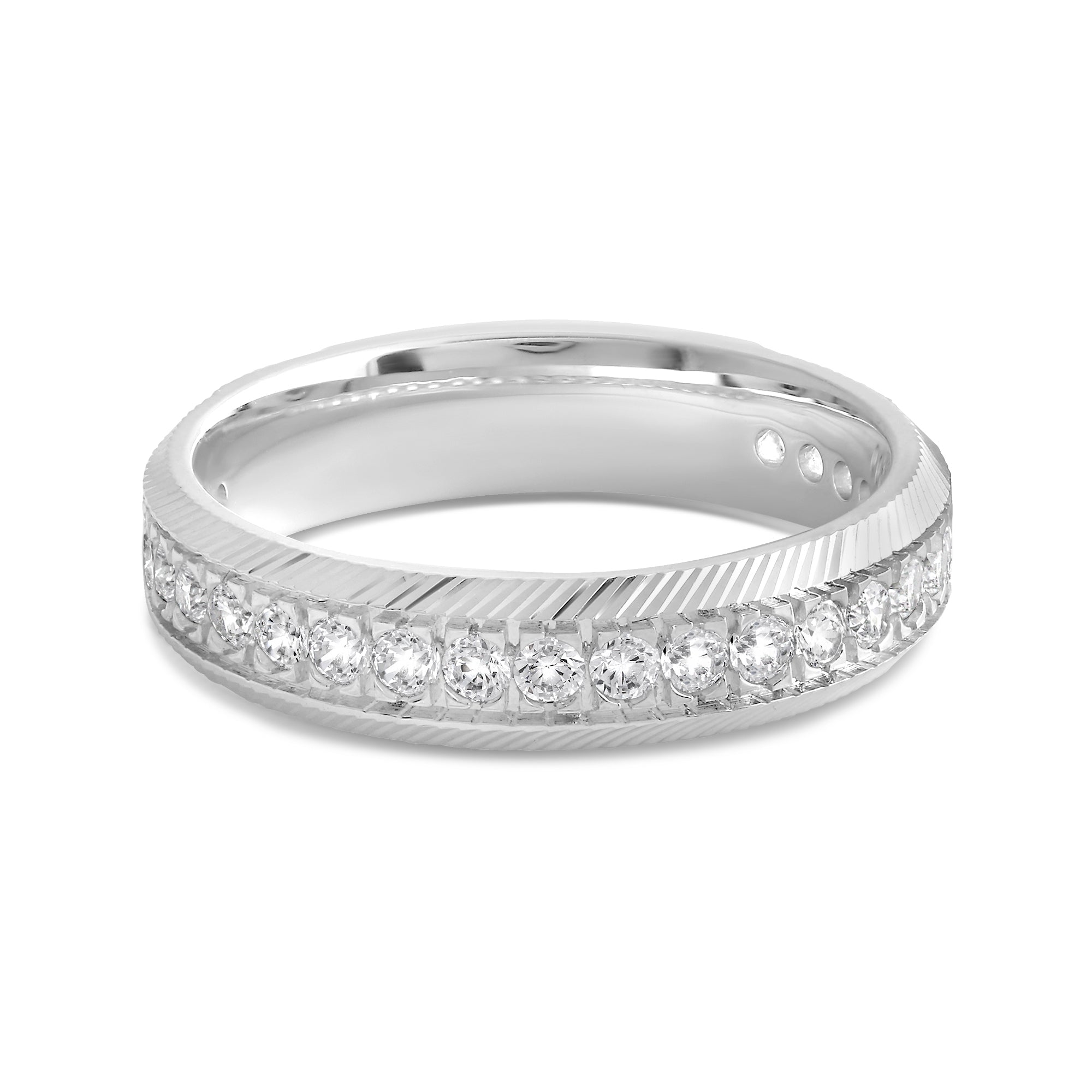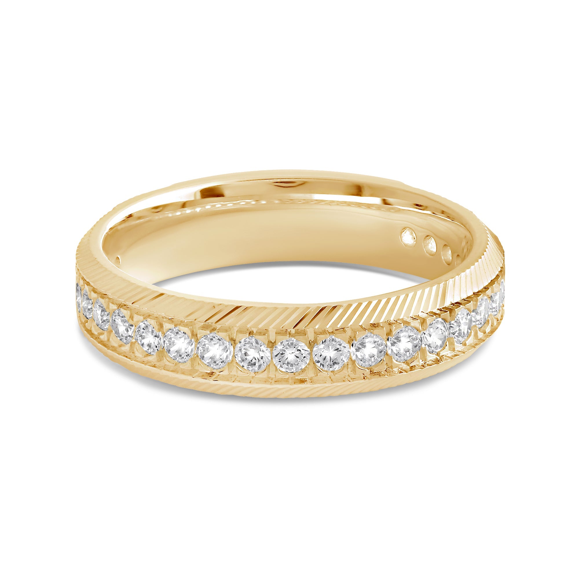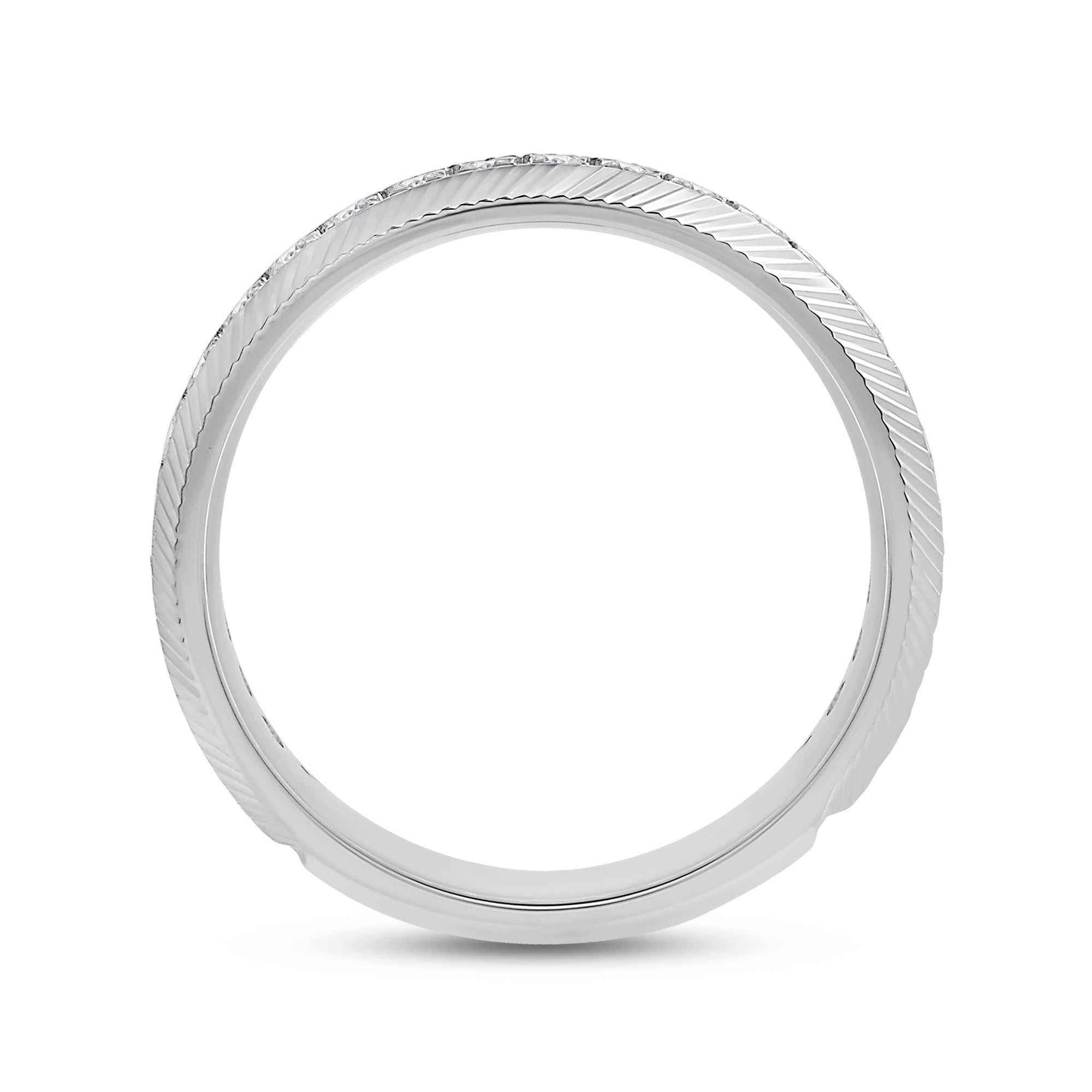 This band's character will give your stack an elevated appeal. The band is extensively detailed with brilliance and texture from the circle of diamonds and the precisely engraved cross pattern. Adding this ring to your ensemble will effortlessly polish your look.