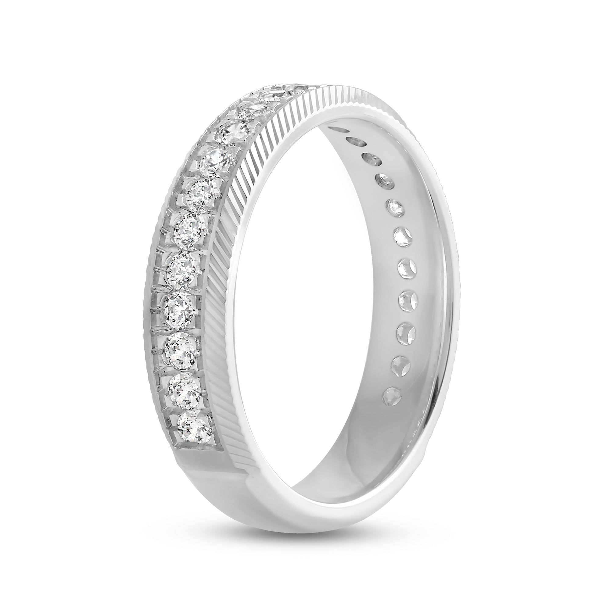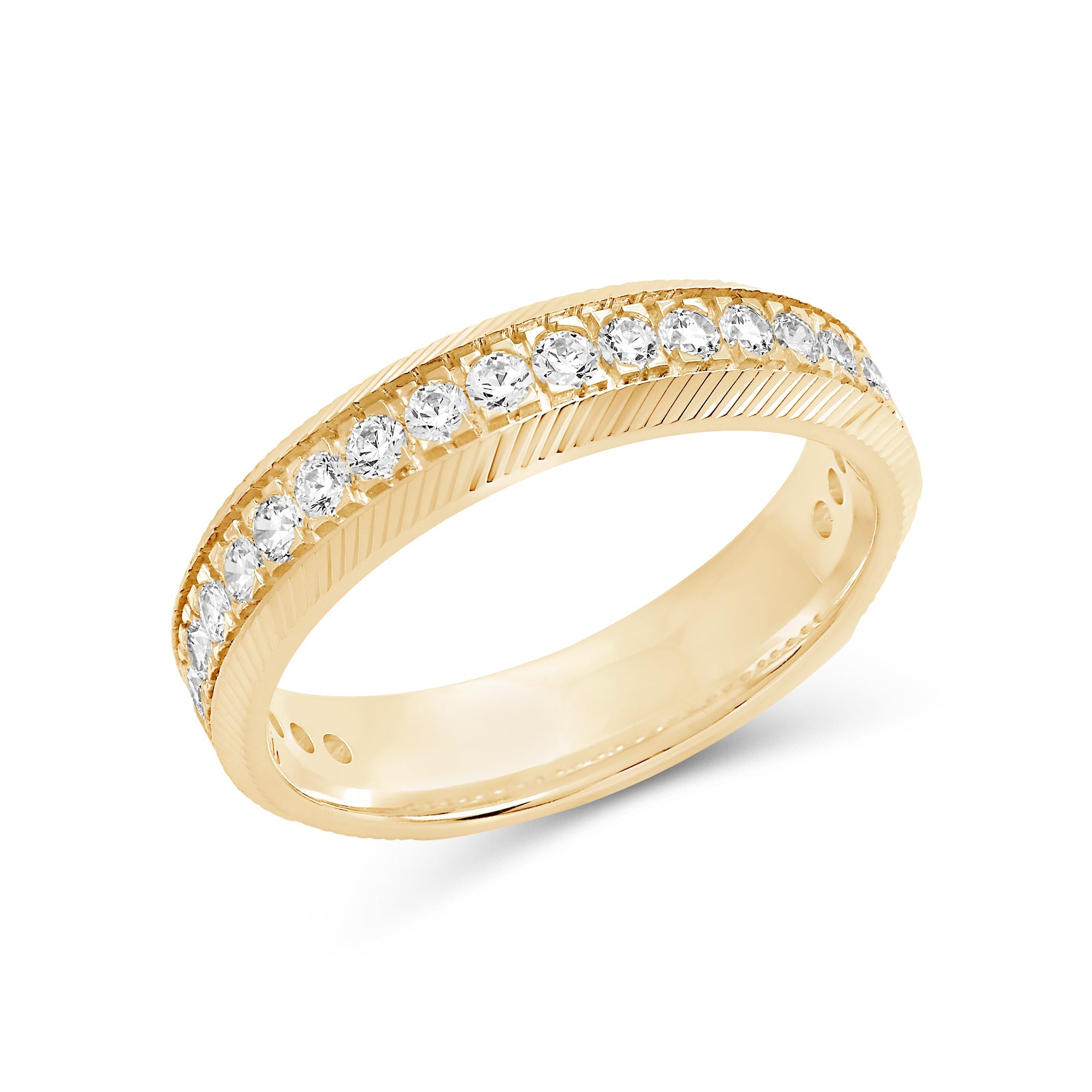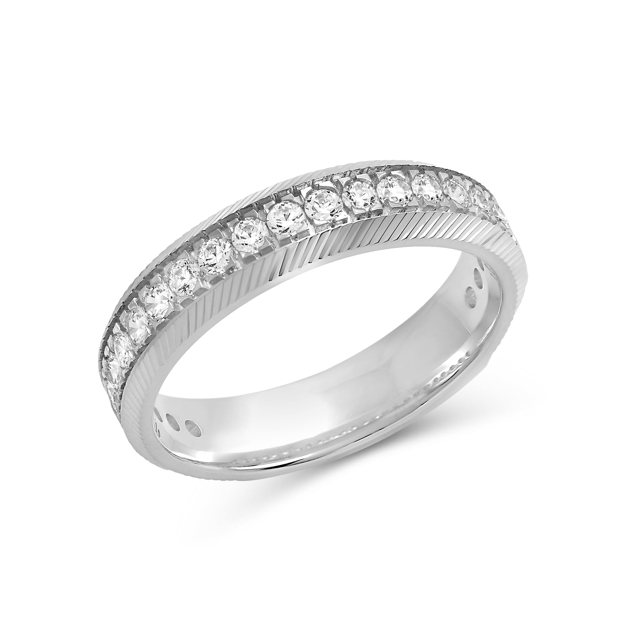 This band's character will give your stack an elevated appeal. The band is extensively detailed with brilliance and texture from the circle of diamonds and the precisely engraved cross pattern. Adding this ring to your ensemble will effortlessly polish your look.