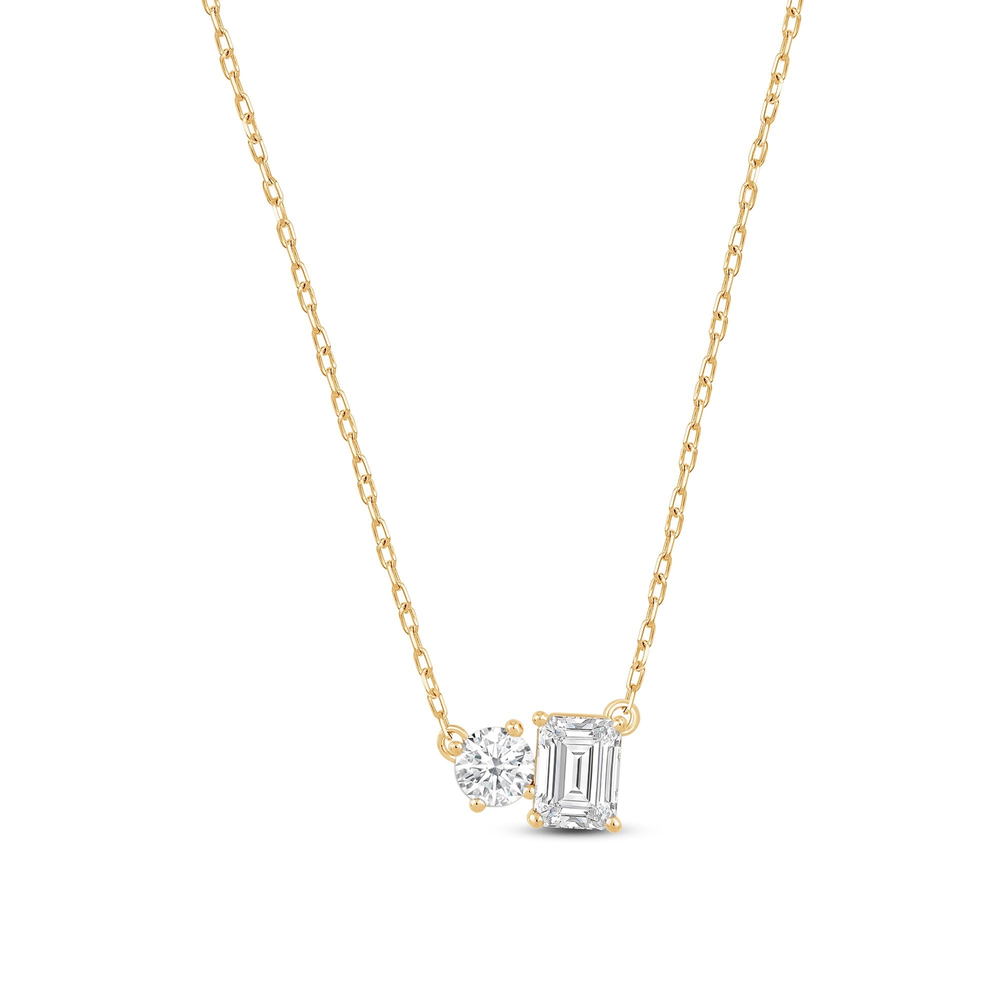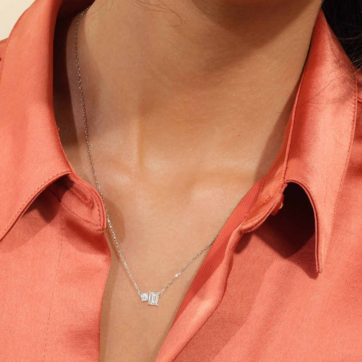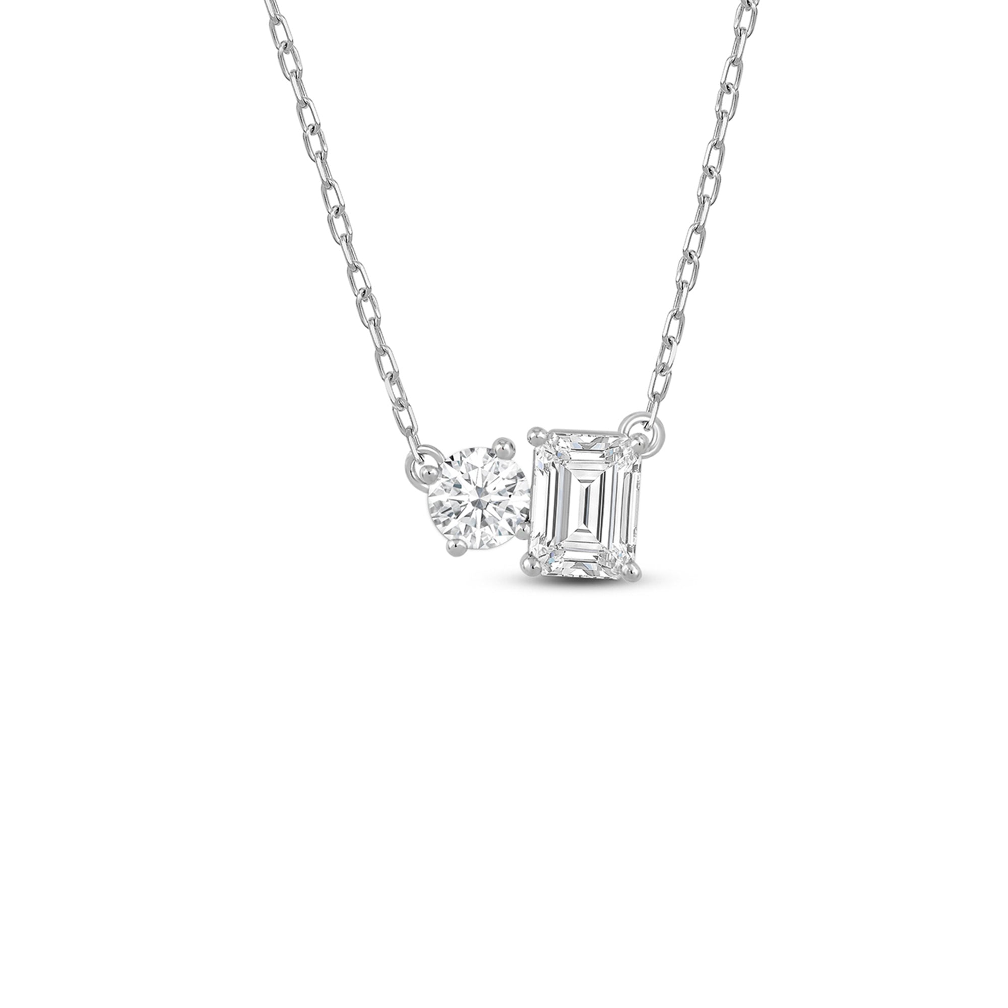 The beauty of restraint is clearly evident in this necklace. It features a slender necklace chain holding a two-stone pendant composed of a round and emerald-cut diamond. Those who love luxury but appreciate subtlety will be instantly drawn to this two-stone diamond necklace's easy elegance.