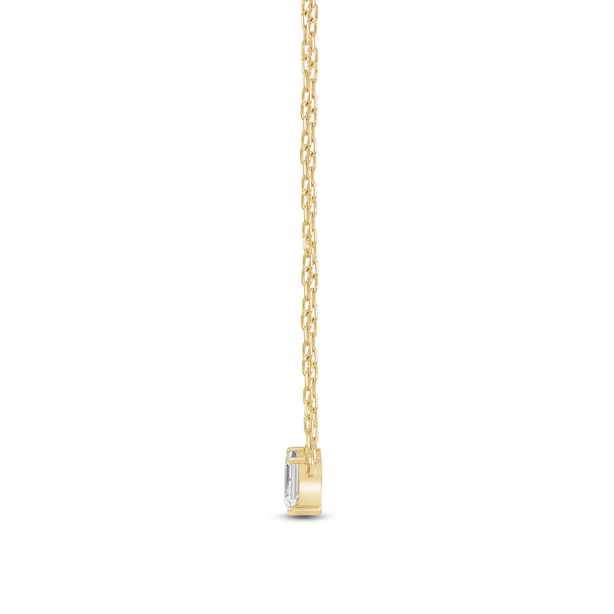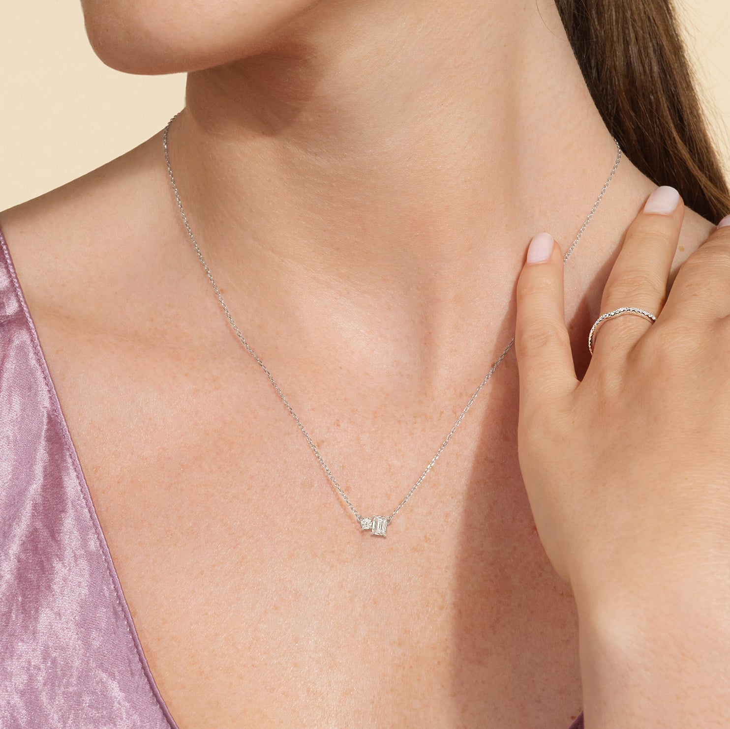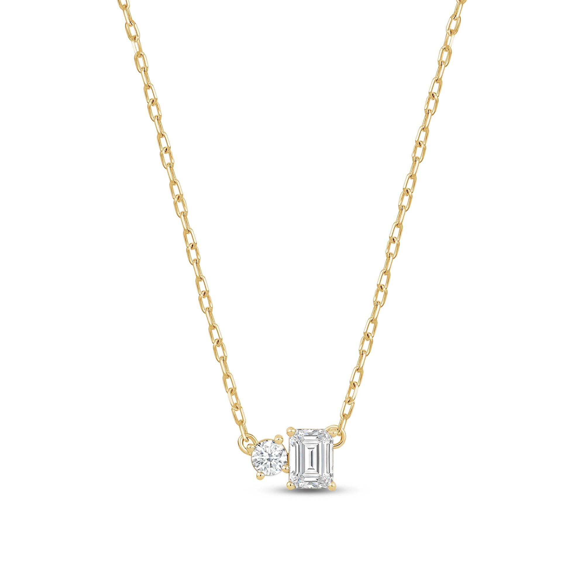 The beauty of restraint is clearly evident in this necklace. It features a slender necklace chain holding a two-stone pendant composed of a round and emerald-cut diamond. Those who love luxury but appreciate subtlety will be instantly drawn to this two-stone diamond necklace's easy elegance.