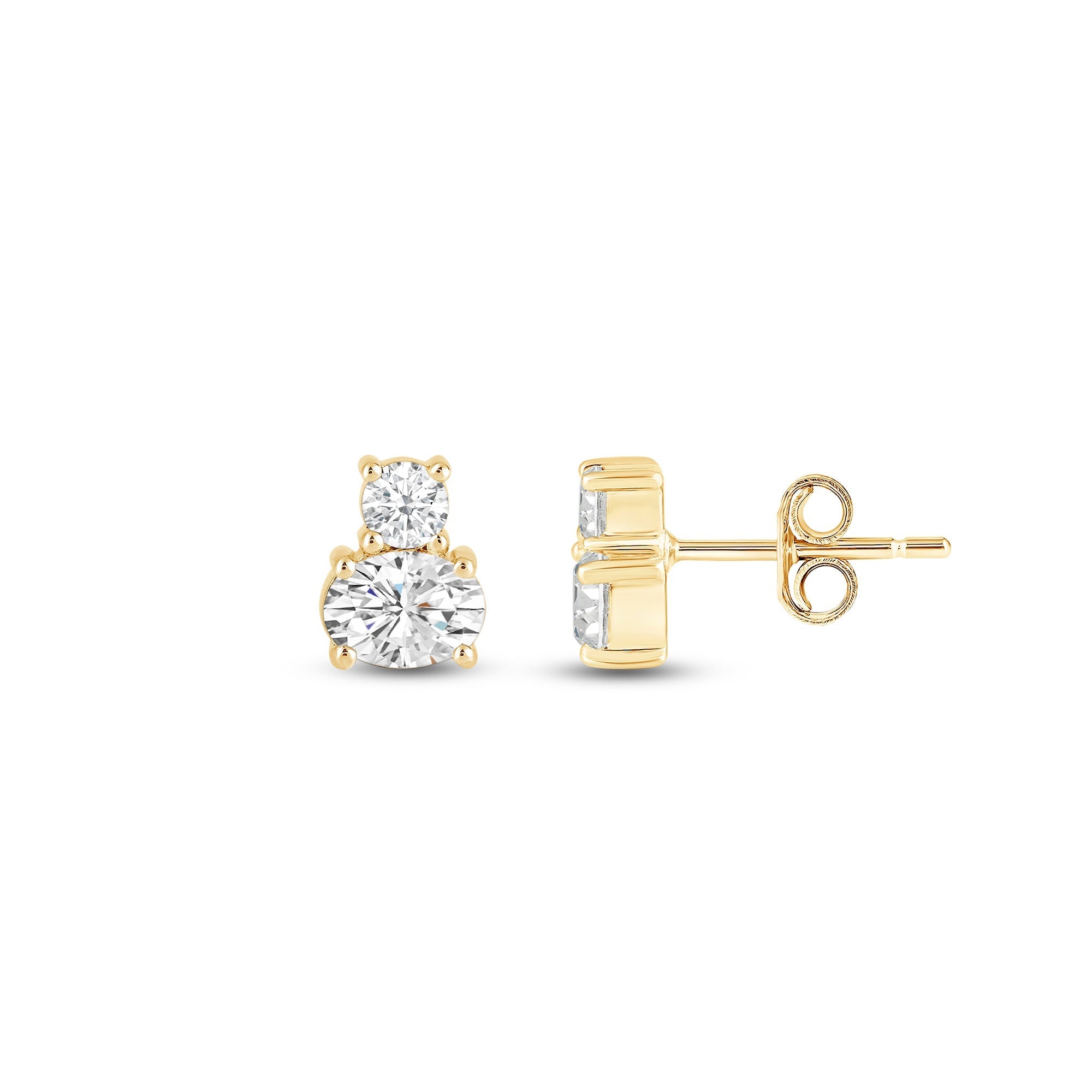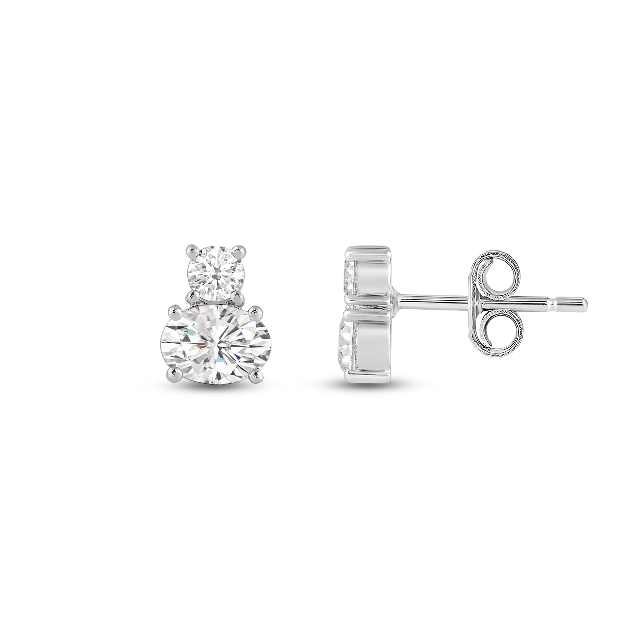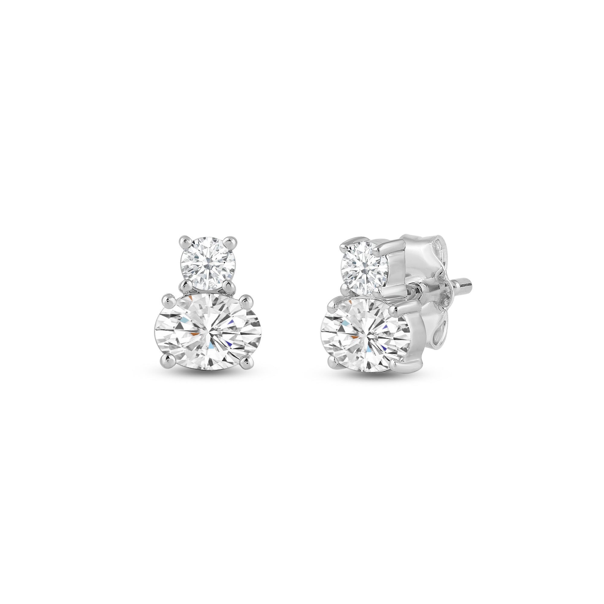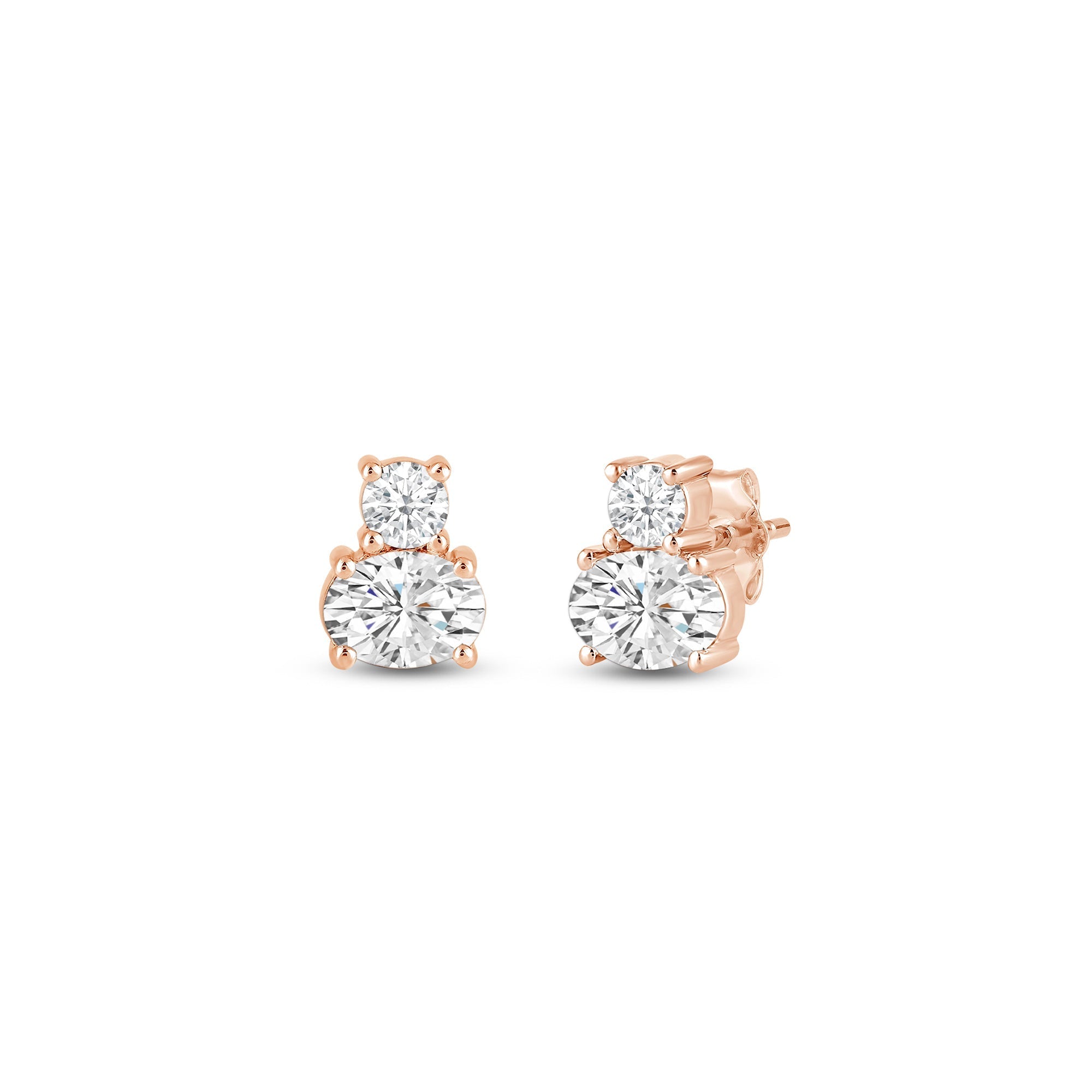 These two-stone stud earrings feature a design that embraces simplicity and elegance. Each stud has a two-stone setting, with a round diamond and an oval diamond set on prongs. The versatile look of this pair makes it suitable for any outfit or occasion.