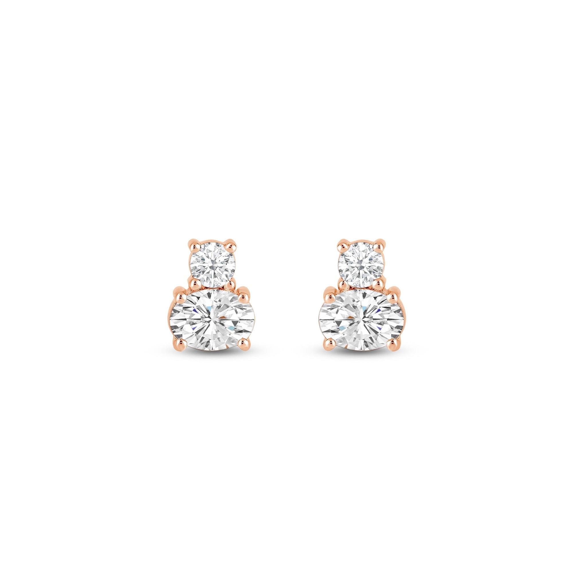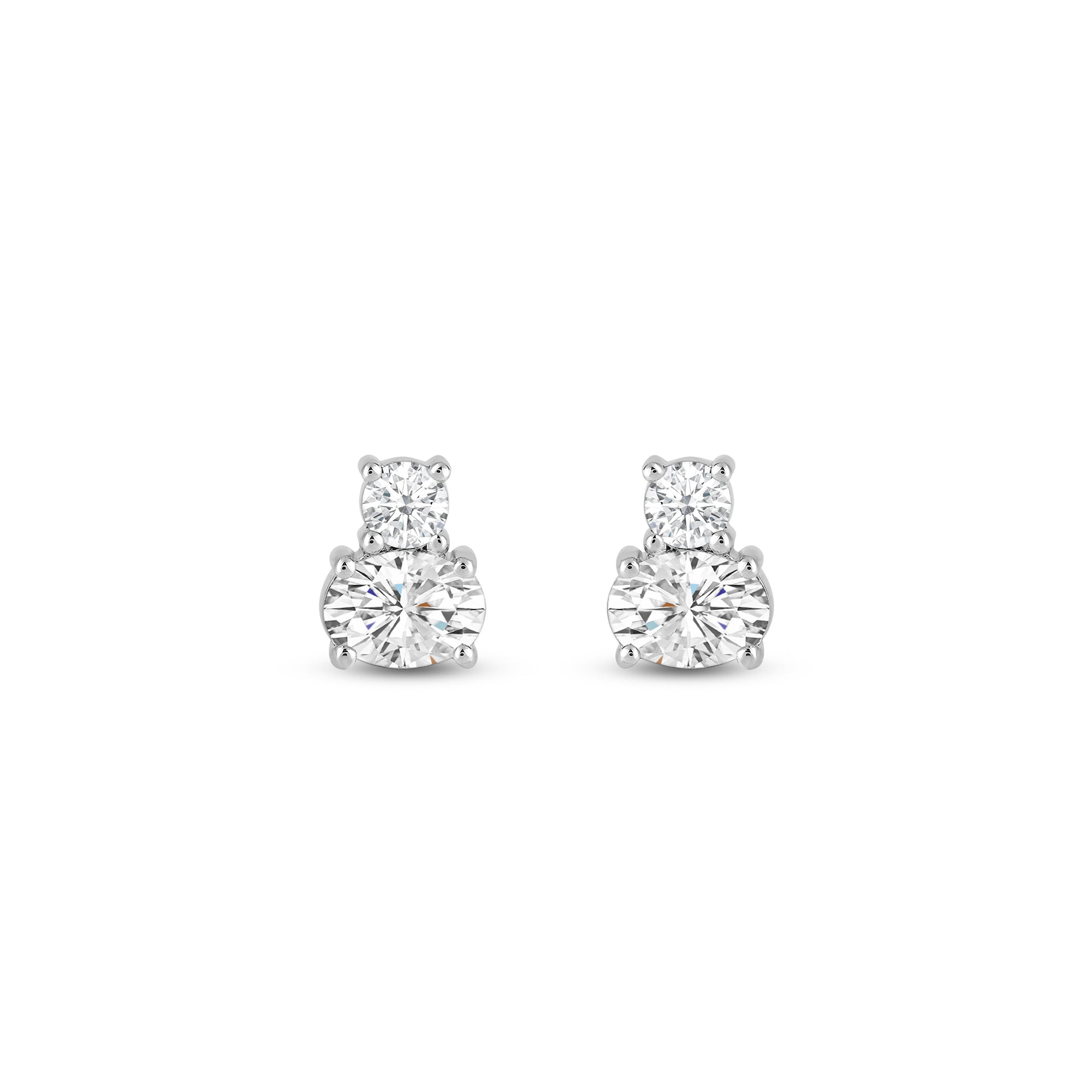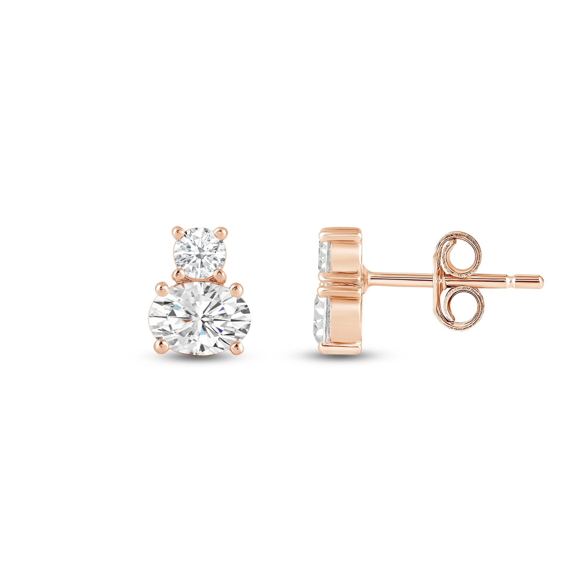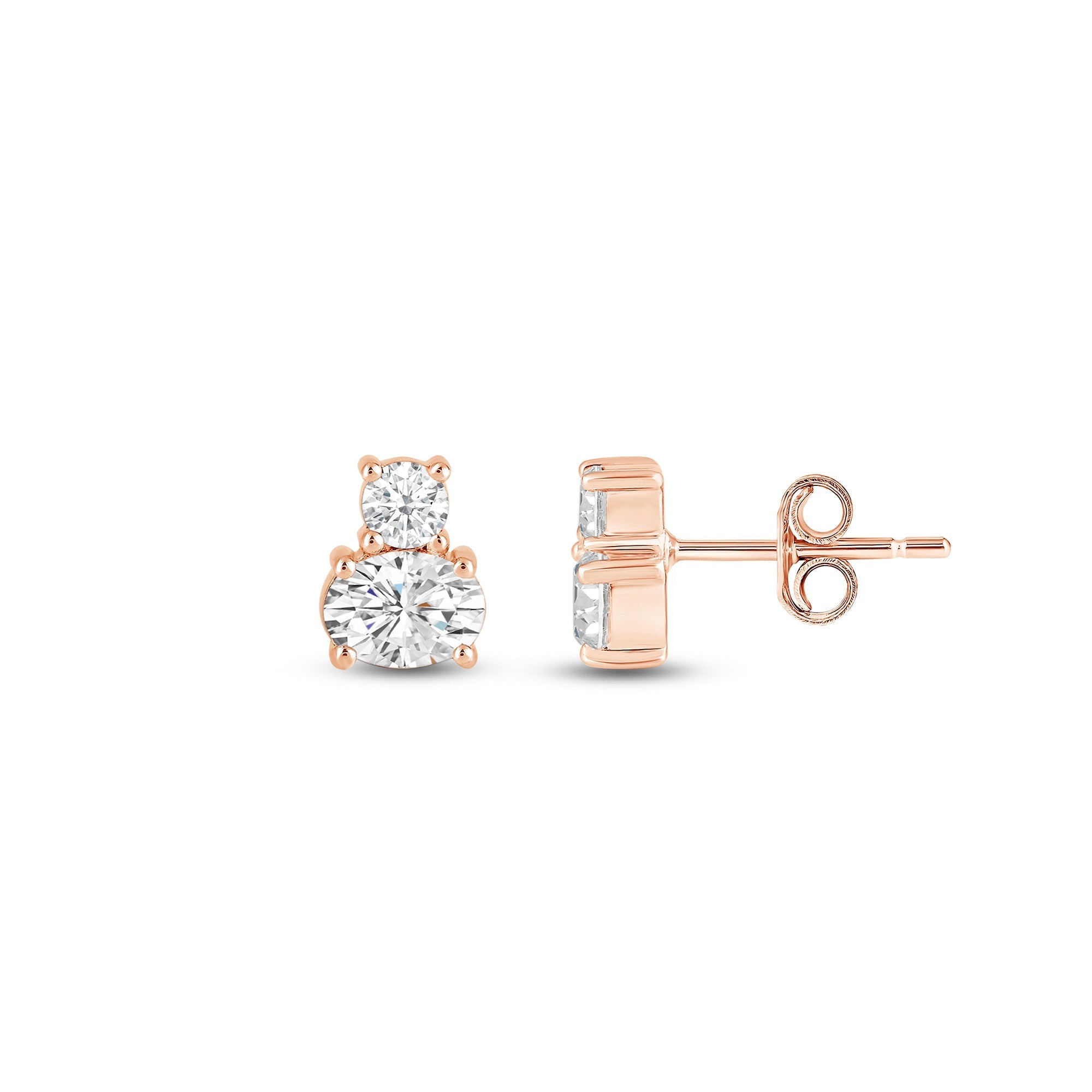 These two-stone stud earrings feature a design that embraces simplicity and elegance. Each stud has a two-stone setting, with a round diamond and an oval diamond set on prongs. The versatile look of this pair makes it suitable for any outfit or occasion.