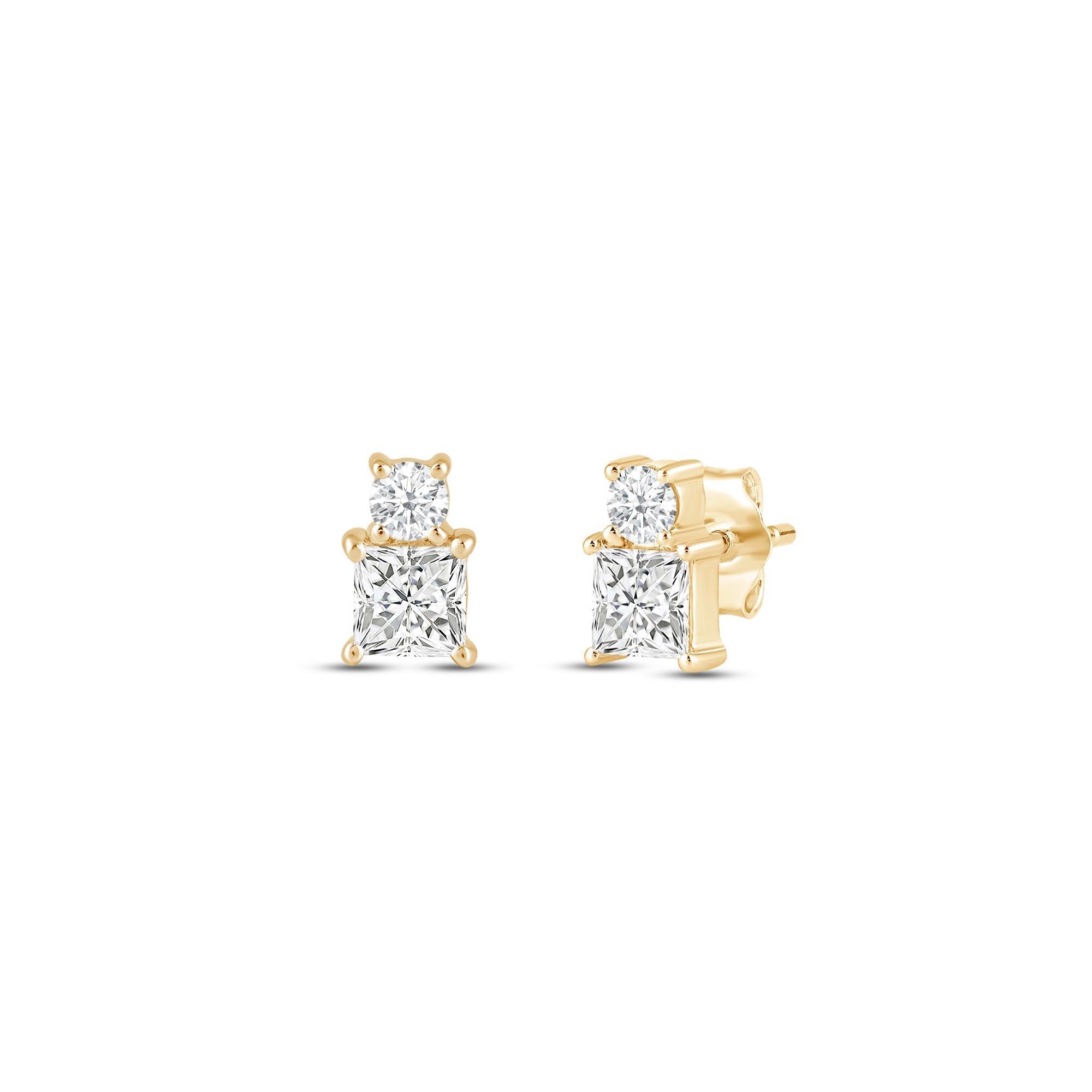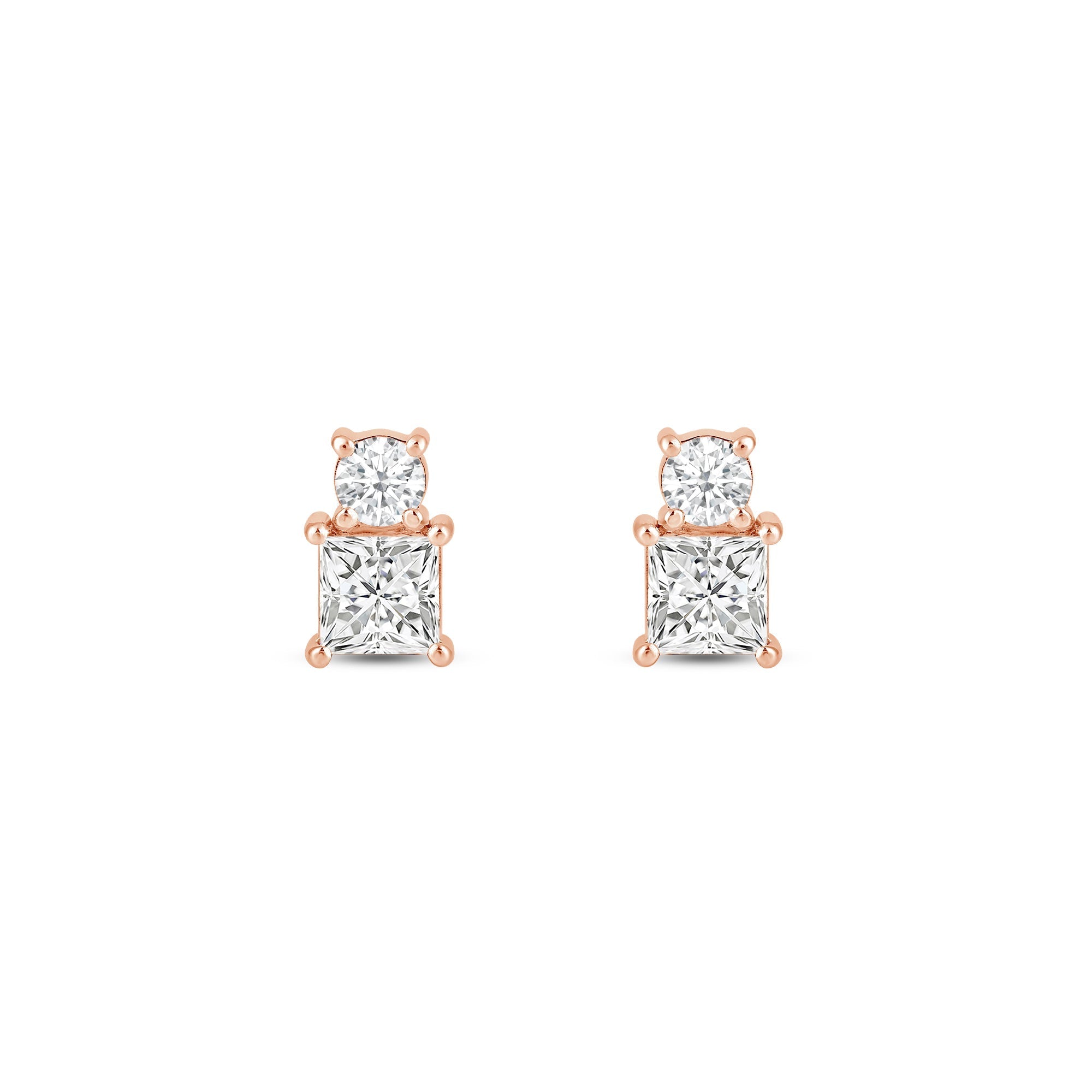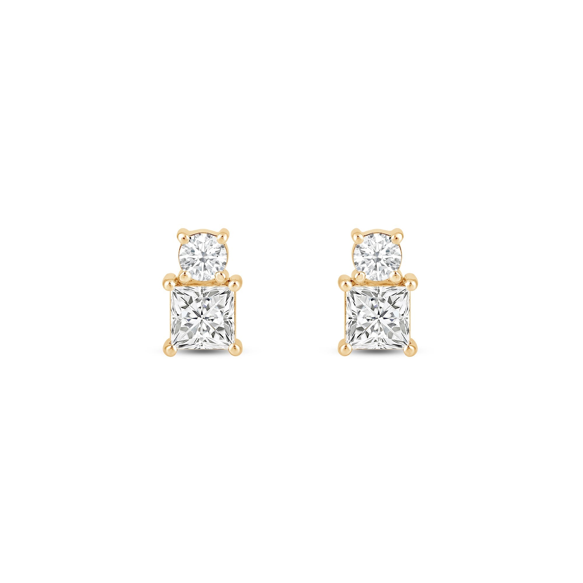 Looking for earrings with minimal style yet maximum impact? These earrings are less than half an inch in size but can give you twice the sparkle. The two-stone prong setting bears a round diamond and a princess-cut diamond - two diamond cuts with the most stunning sparkle.