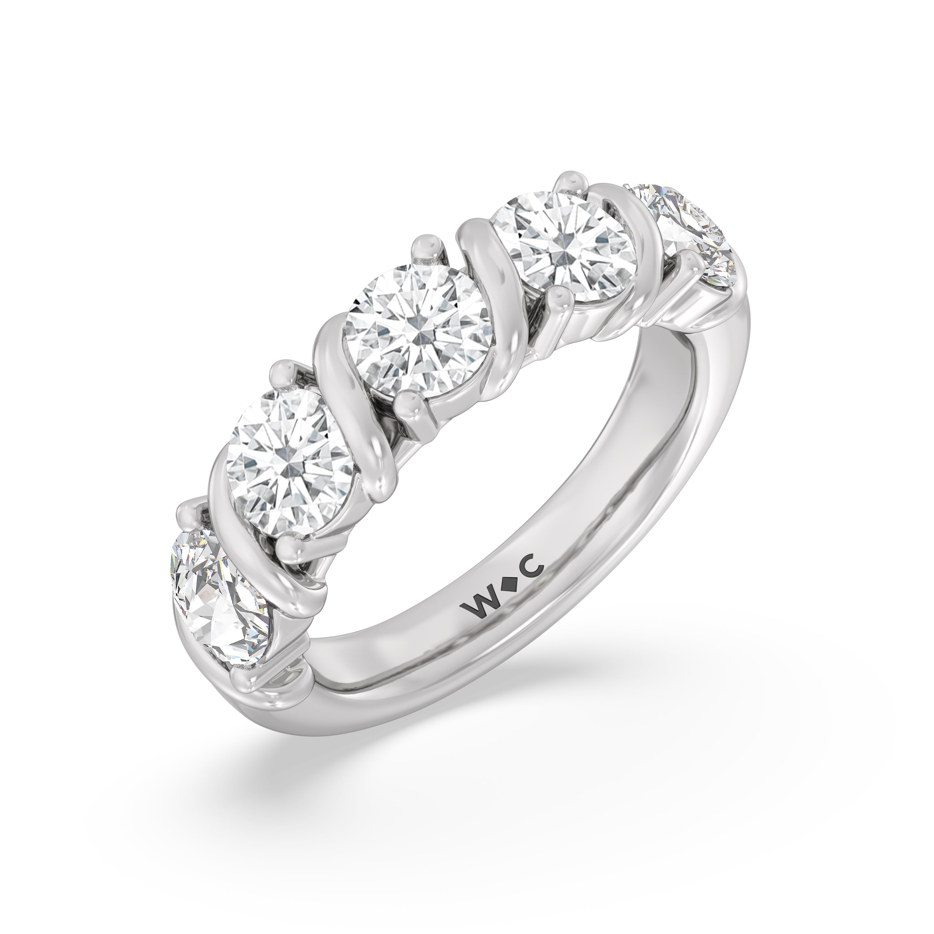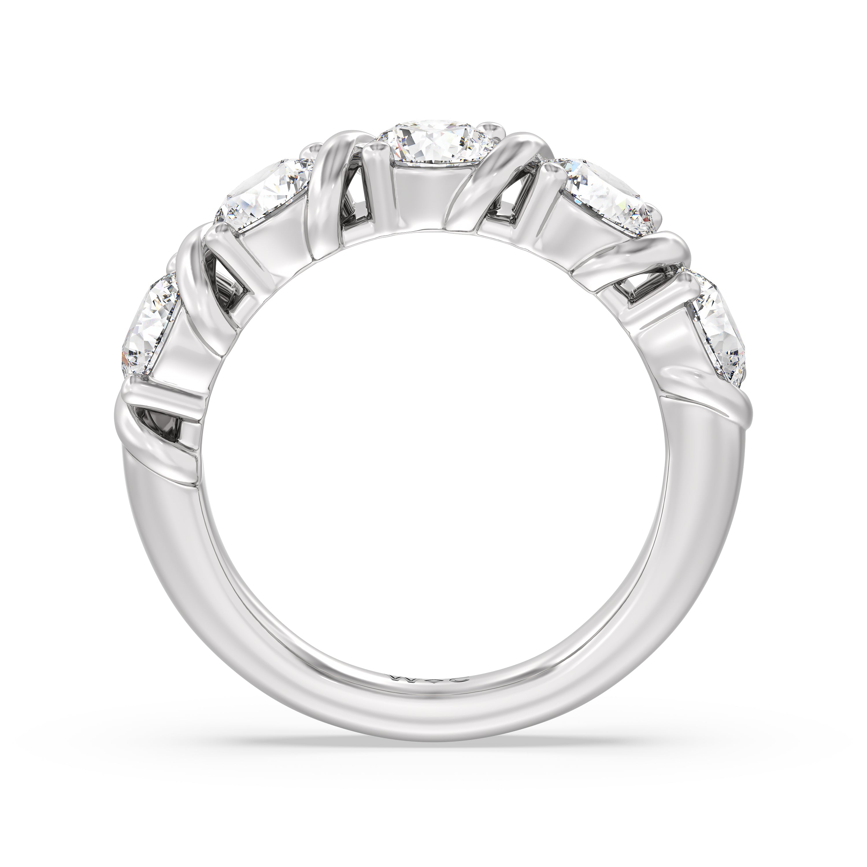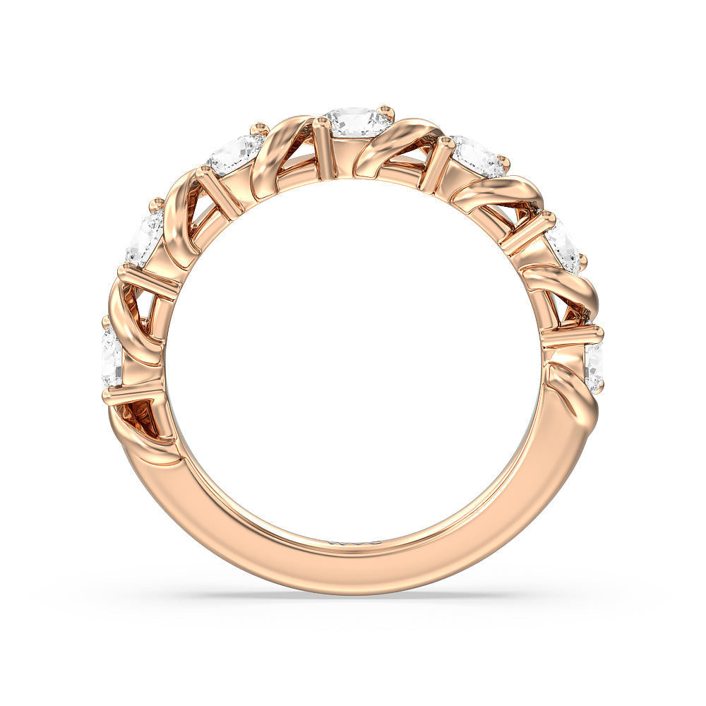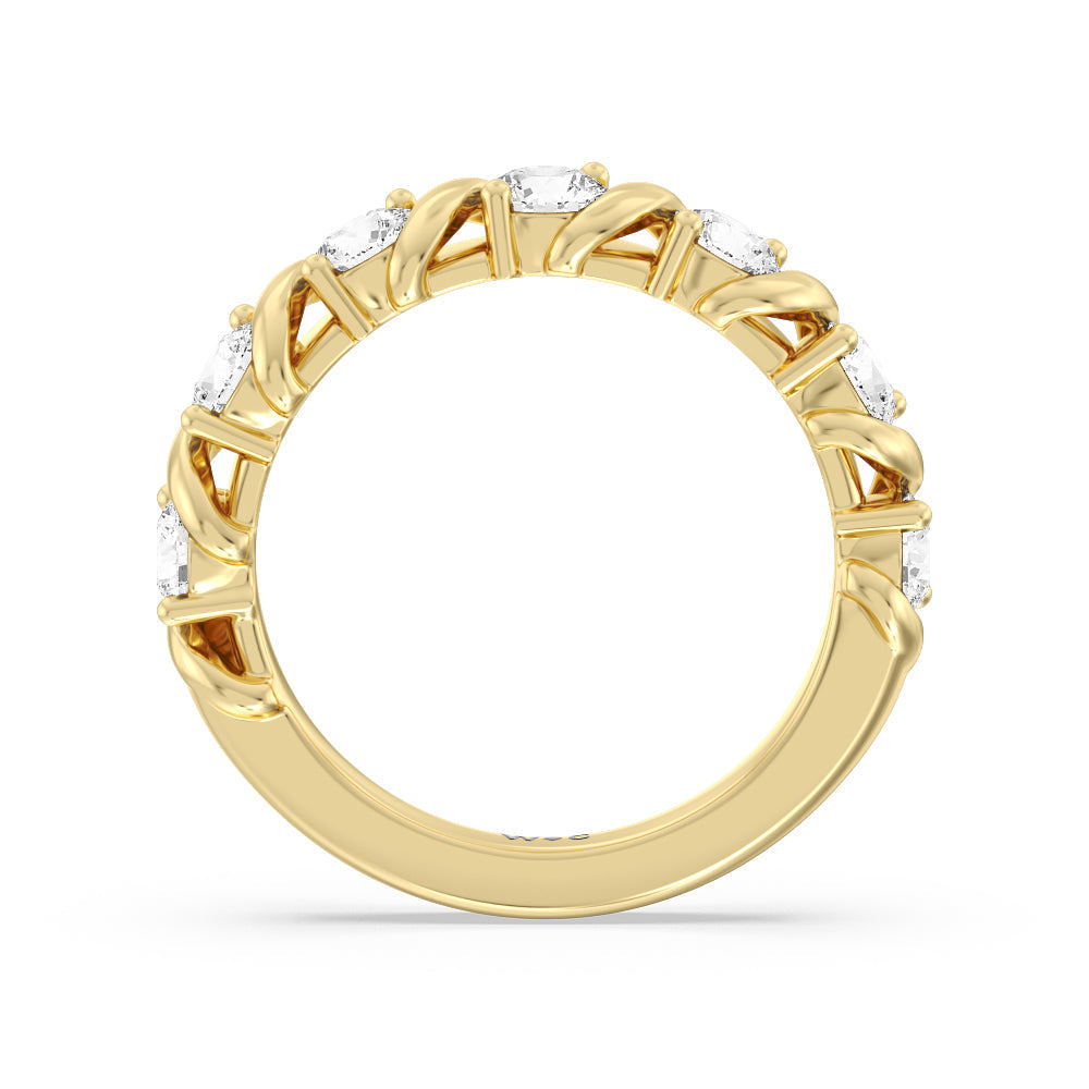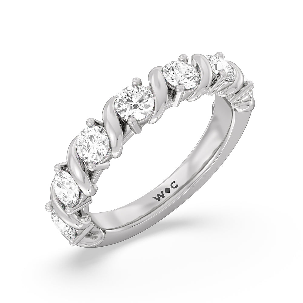 Made for a hopeless romantic, this anniversary ring charms with its understated sparkle and tactile detail. The highly polished band features seven round diamonds, each mounted on a two-prong setting. A polished metal ribbon swirls in between each brilliant gemstone for a curvy and visually fluid aesthetic.