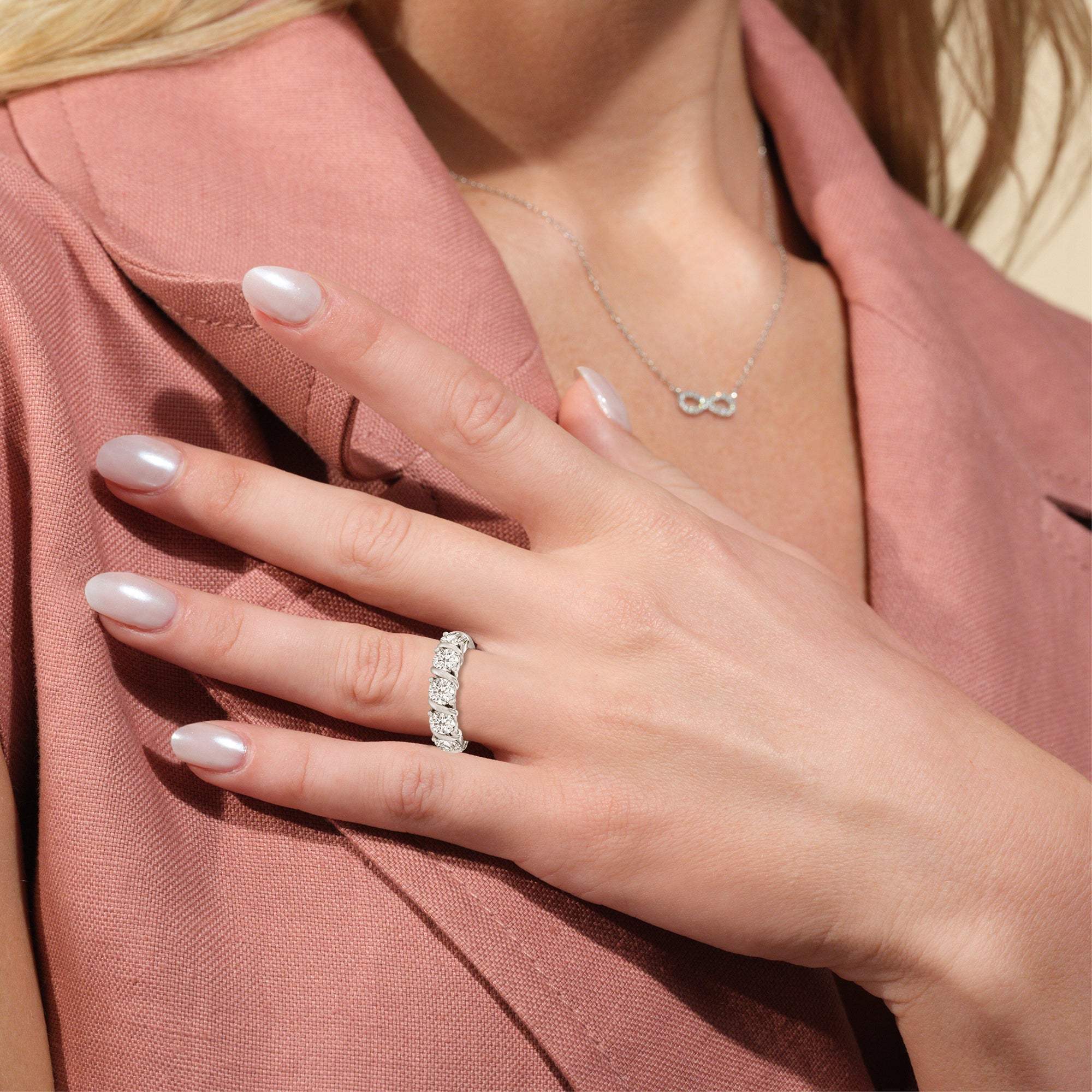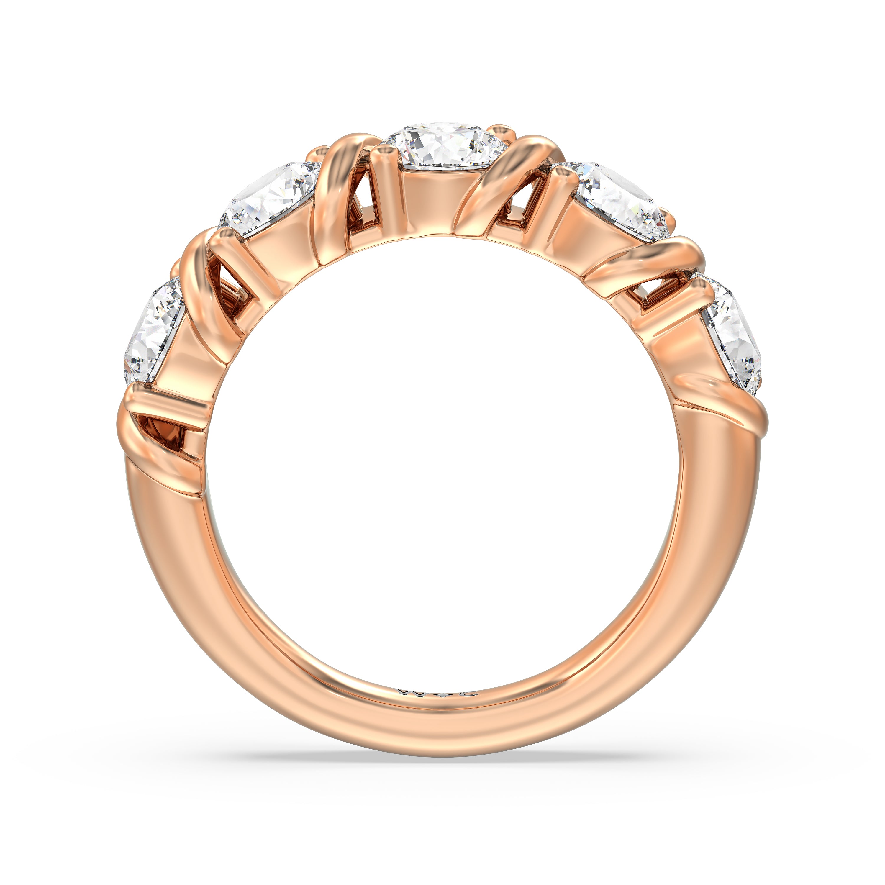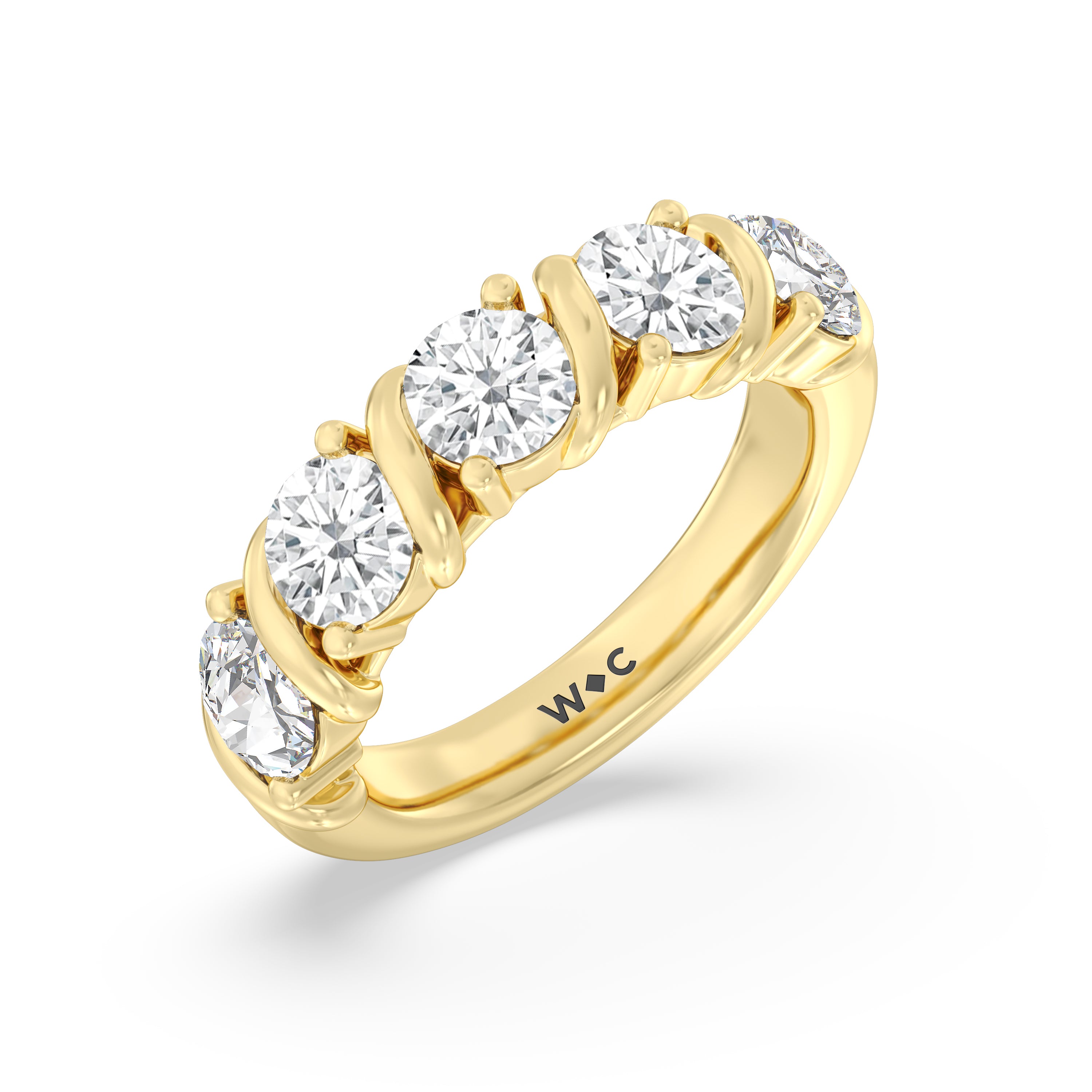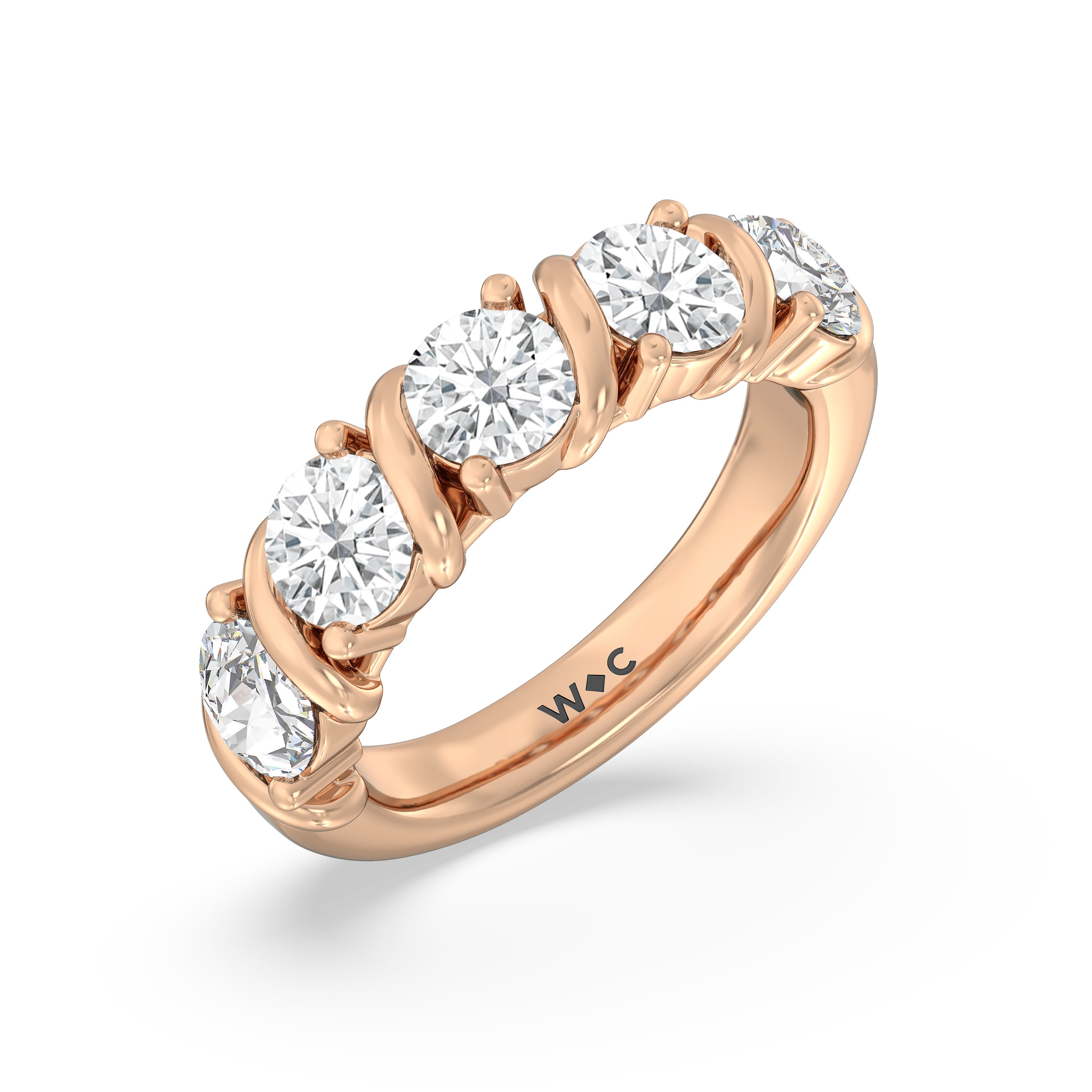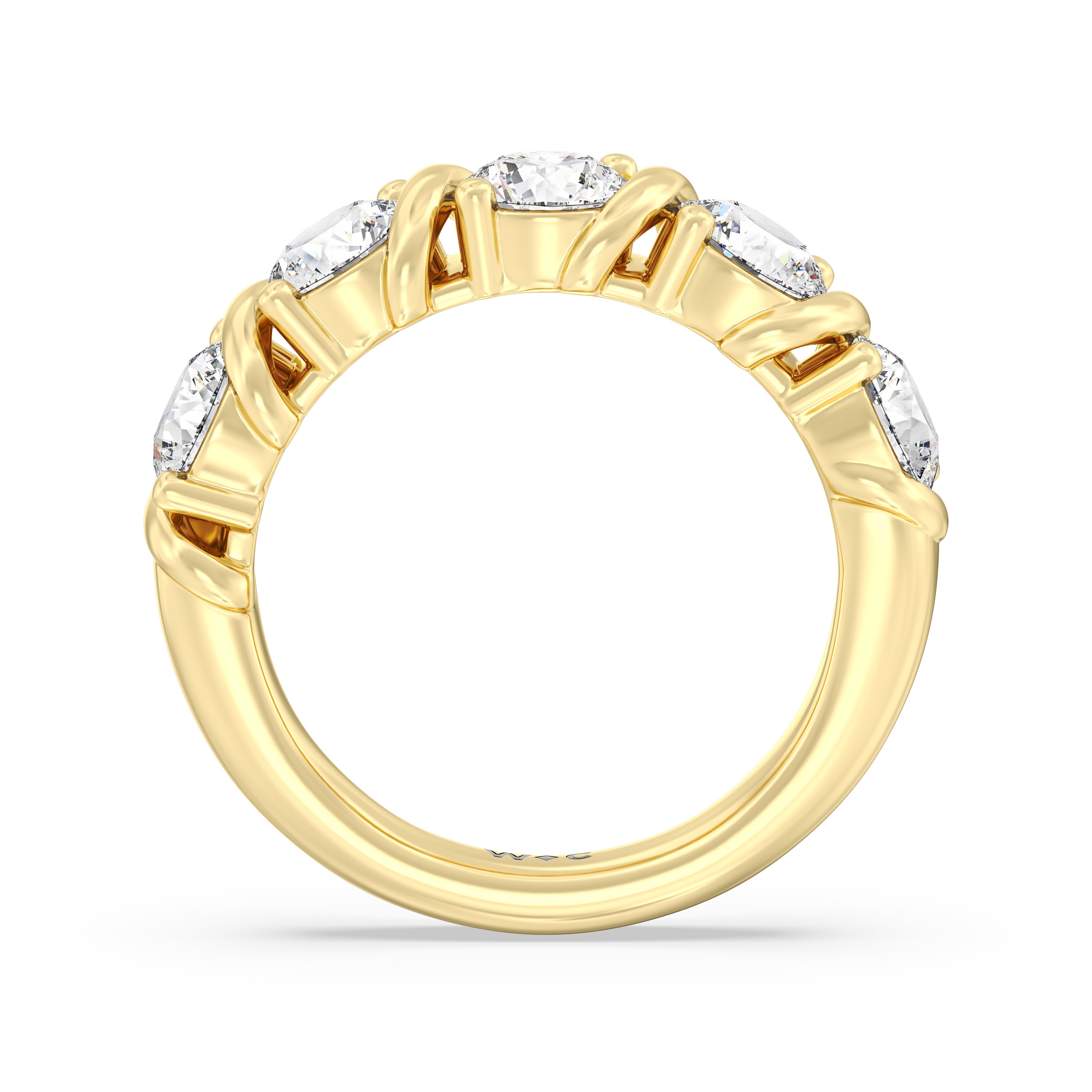 Made for a hopeless romantic, this anniversary ring charms with its understated sparkle and tactile detail. The highly polished band features seven round diamonds, each mounted on a two-prong setting. A polished metal ribbon swirls in between each brilliant gemstone for a curvy and visually fluid aesthetic.