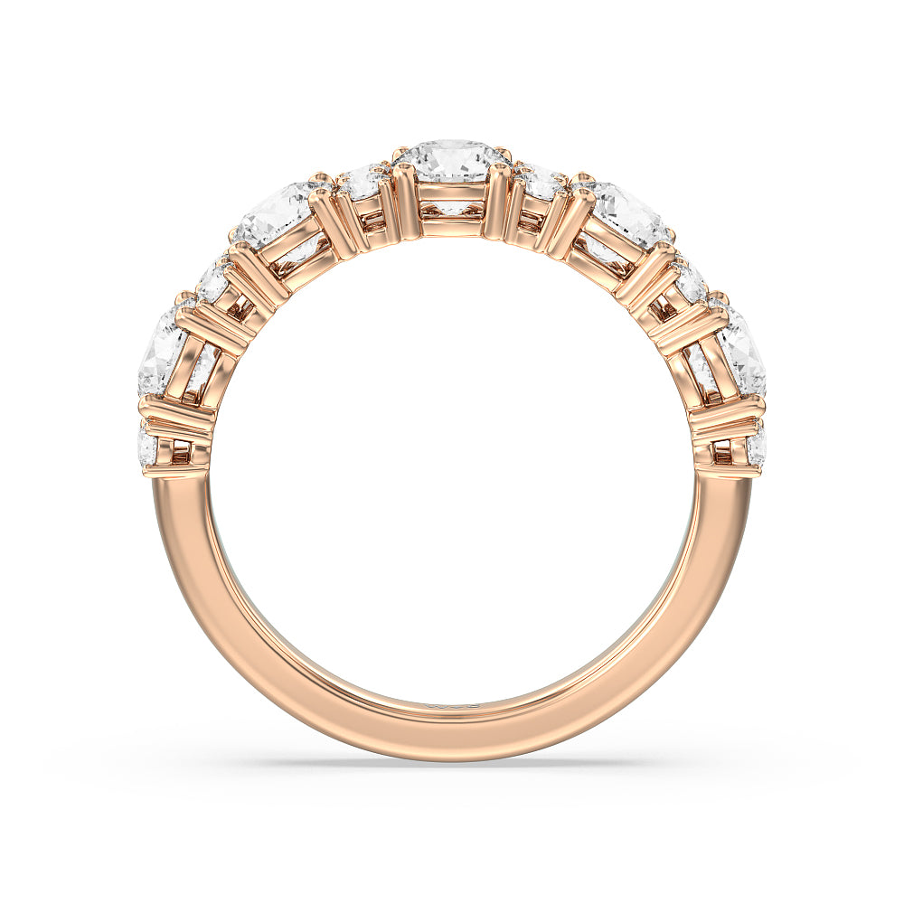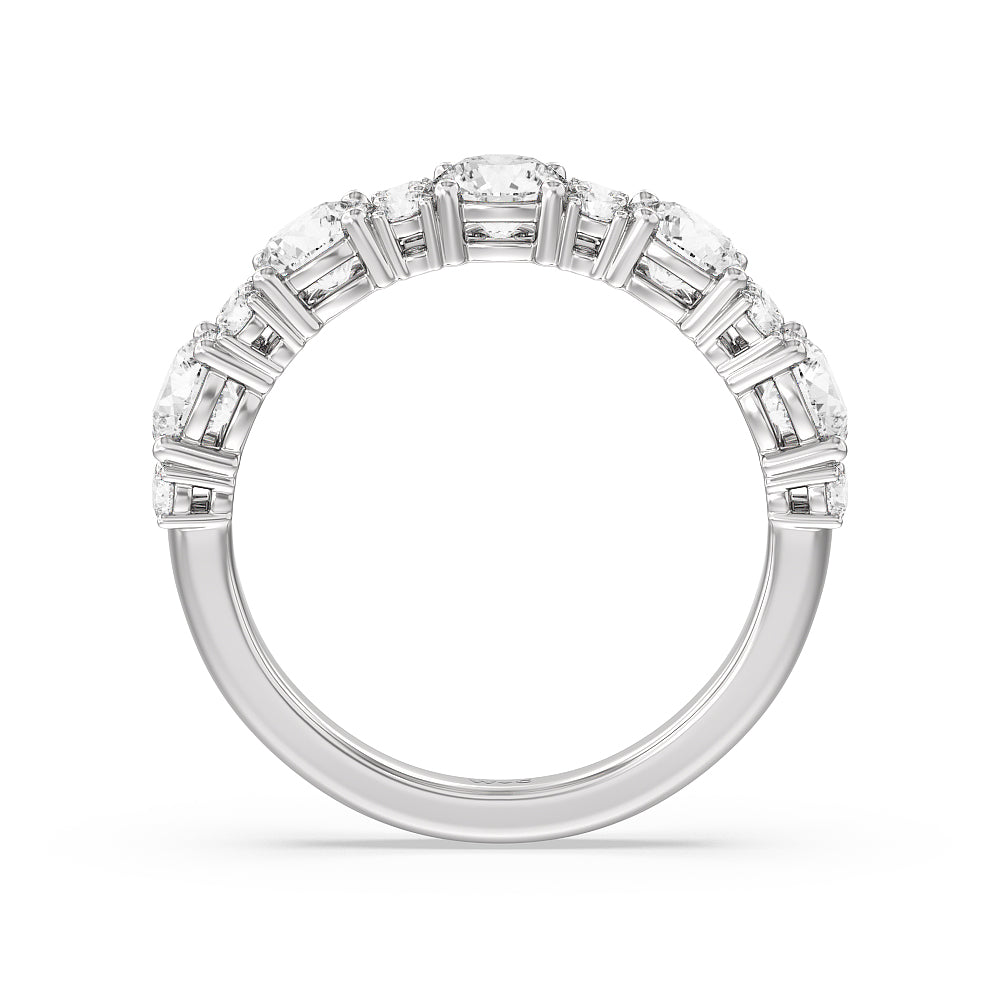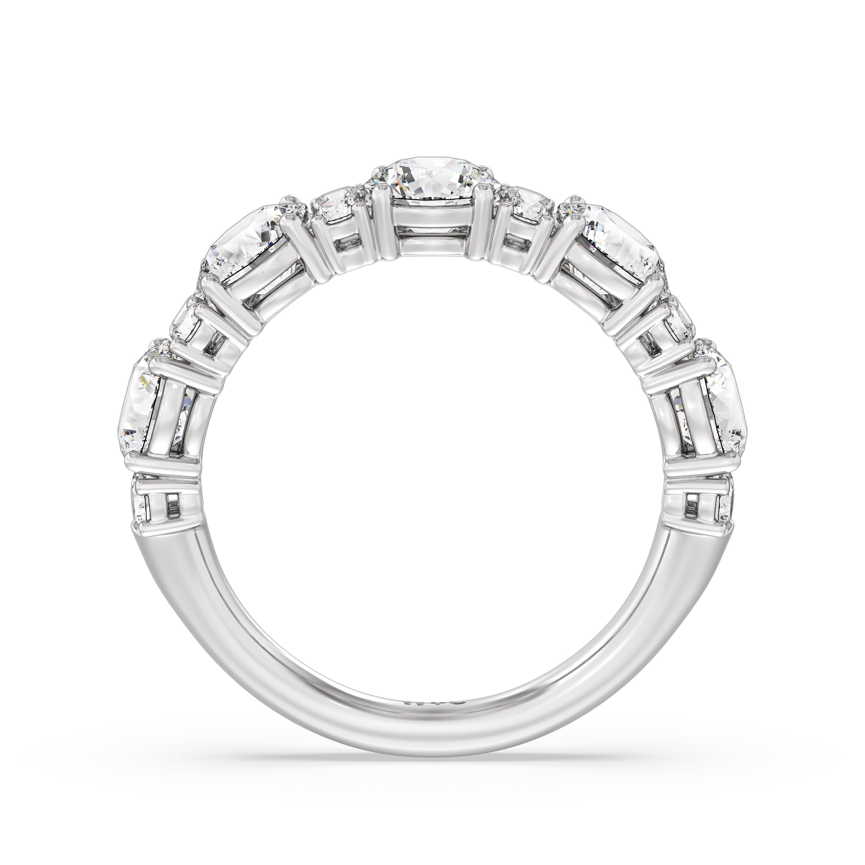 This anniversary ring is designed with elevated simplicity. It features a polished band that very slightly tapers towards the back. The top half of the shank is traced with an alternating pattern of round diamonds and duos of petite round diamonds. With the round diamond cut's facets, this ring is sure to dazzle every time it catches the light. The silhouette of this diamond band makes it the perfect choice for stacking with an engagement ring or a wedding band.
