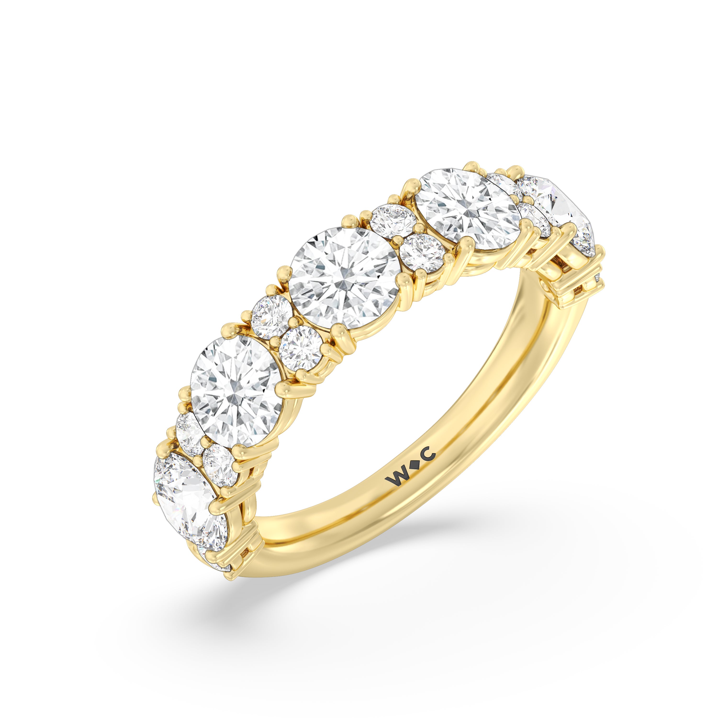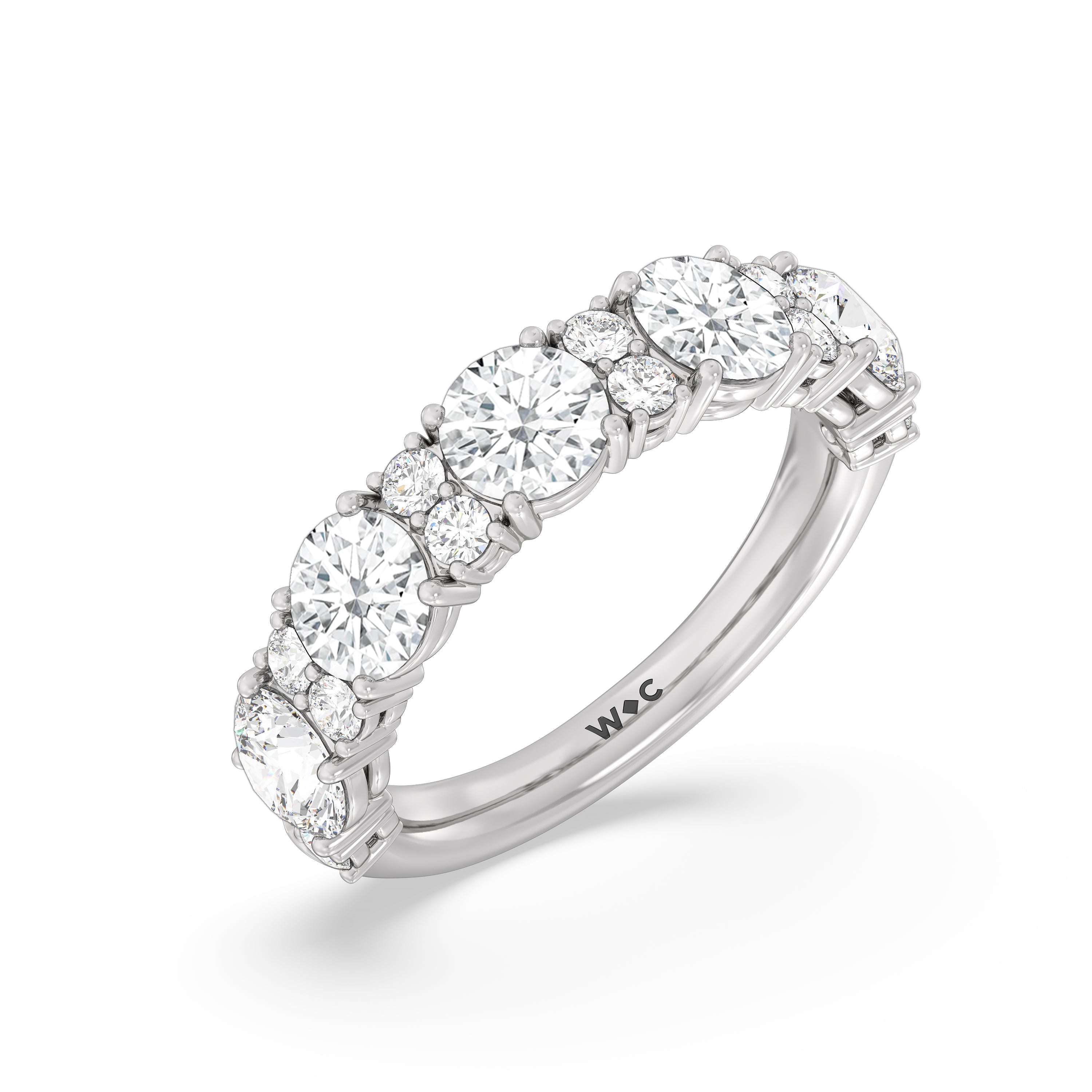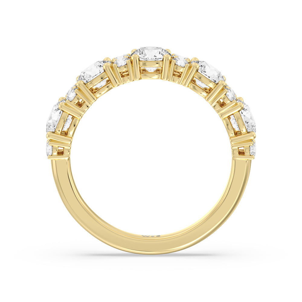 This anniversary ring is designed with elevated simplicity. It features a polished band that very slightly tapers towards the back. The top half of the shank is traced with an alternating pattern of round diamonds and duos of petite round diamonds. With the round diamond cut's facets, this ring is sure to dazzle every time it catches the light. The silhouette of this diamond band makes it the perfect choice for stacking with an engagement ring or a wedding band.