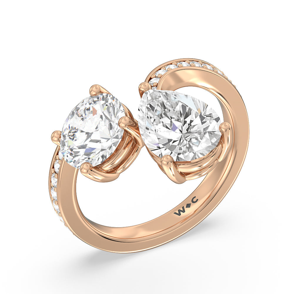 An absolute stunner, this two-stone ring with a beautifully curved band makes an excellent choice to pledge your love and commitment. Its polished shank features diamond-traced shoulders with ends that don't meet. One end slightly curves and holds a 1.75 ct round diamond while the other end curves more dramatically, securing a 2.50 ct pear-cut diamond.