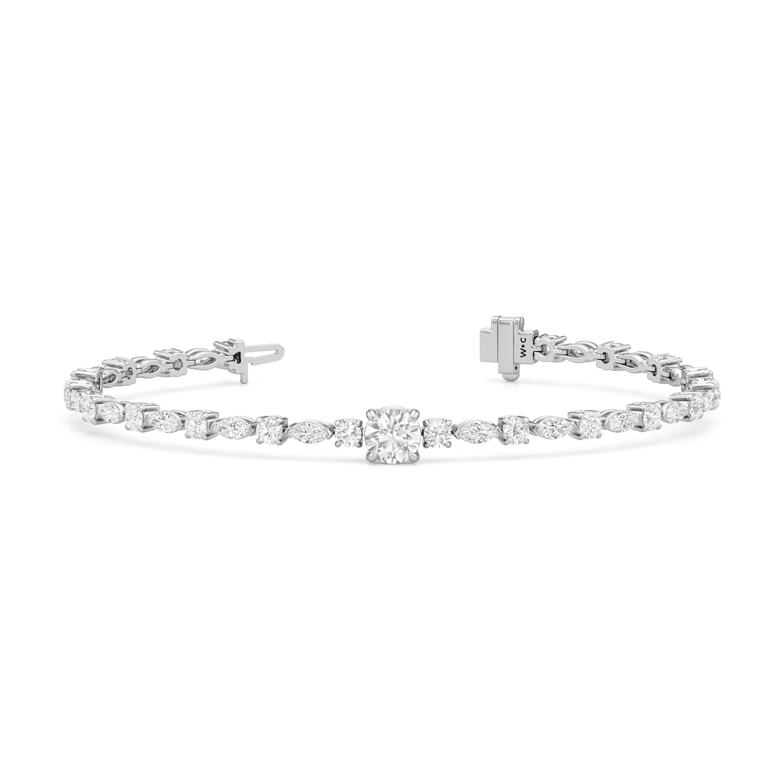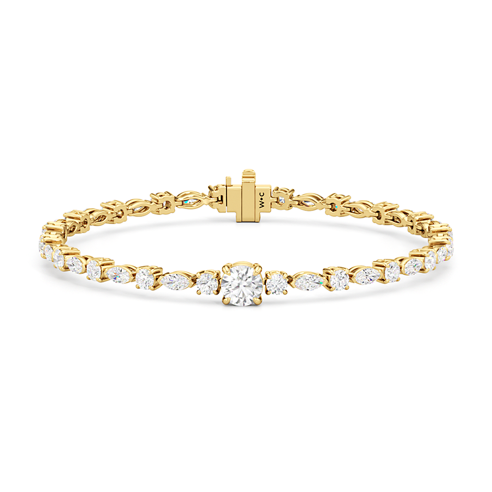 A refined piece of jewelry that highlights the allure of simplicity. This 4.91-carat diamond tennis bracelet features a row of round and marquise diamonds on an alternating pattern. A 0.75-ct round diamond marks the center of the line, lending an extra dazzling effect.