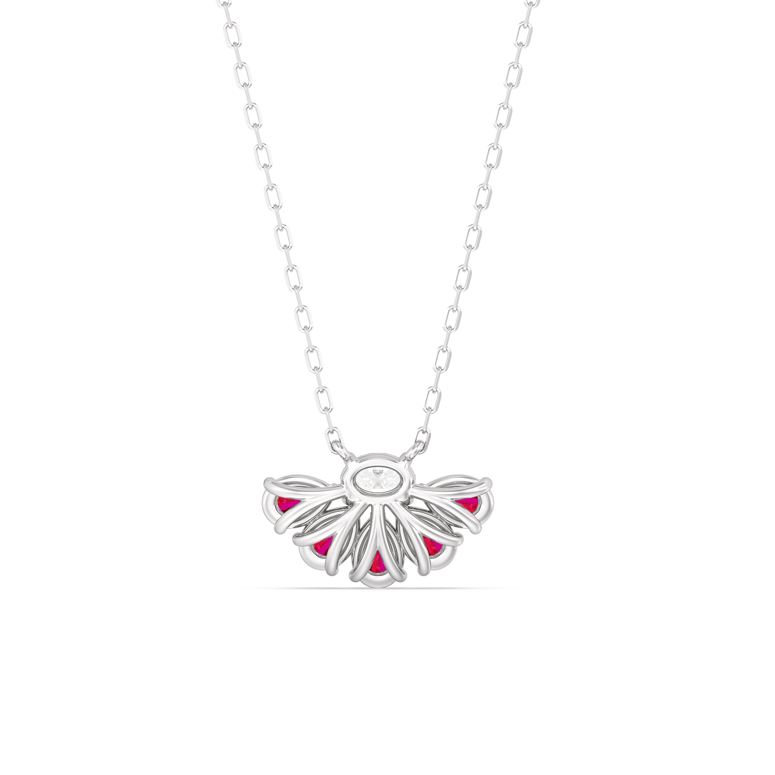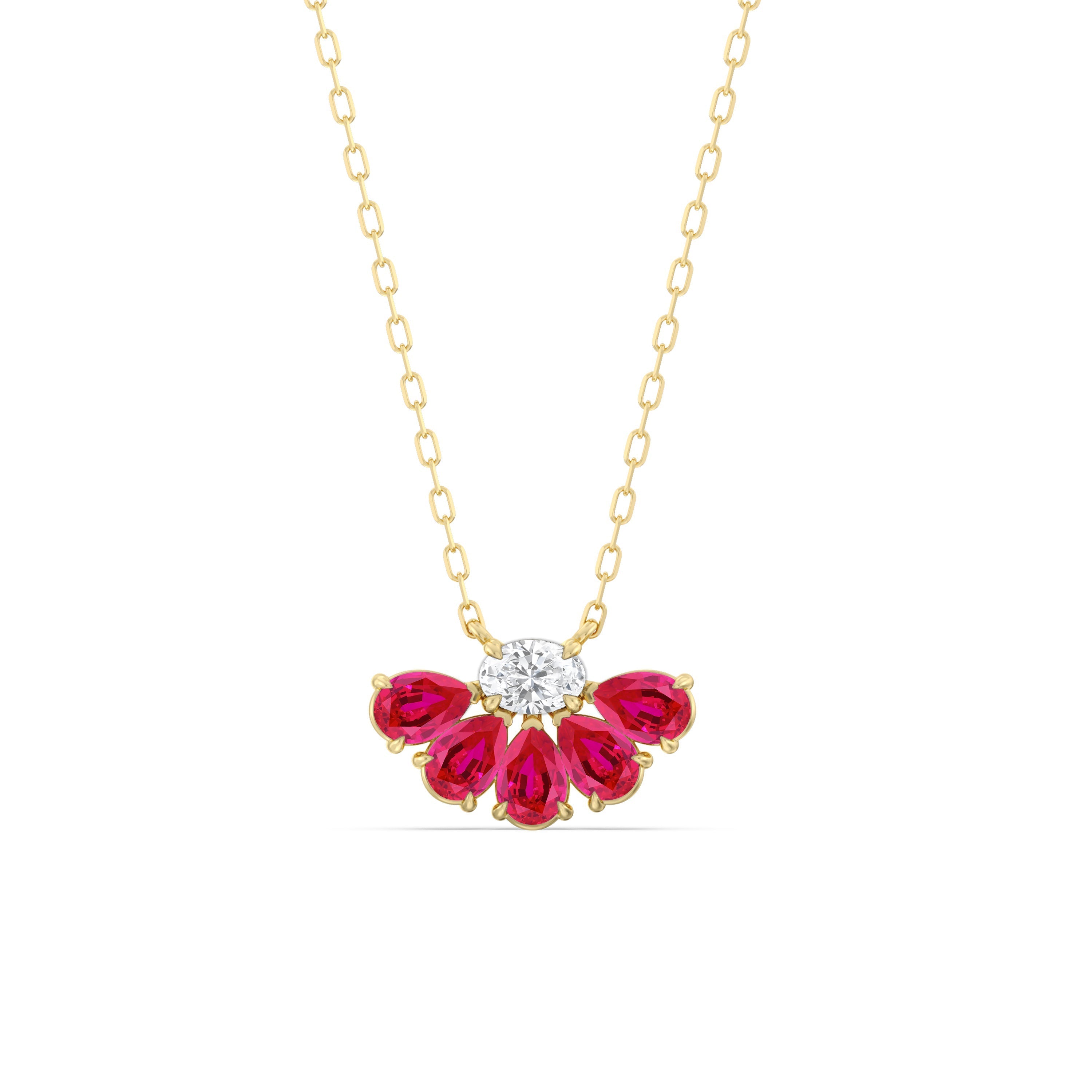 The Daisy Petals Necklace is inspired by the phrase "counting daisies," crafted to bring a touch of charm to your look. The lush necklace holds a radiant pendant composed of a cluster of diamonds. A single oval diamond, set east-west, is decorated below with five pear-cut ruby that form a fan-shaped silhouette mimicking petals, while the top half represents petals that have already been picked. Its soft beauty and subtle sparkle make this necklace effortlessly elegant.