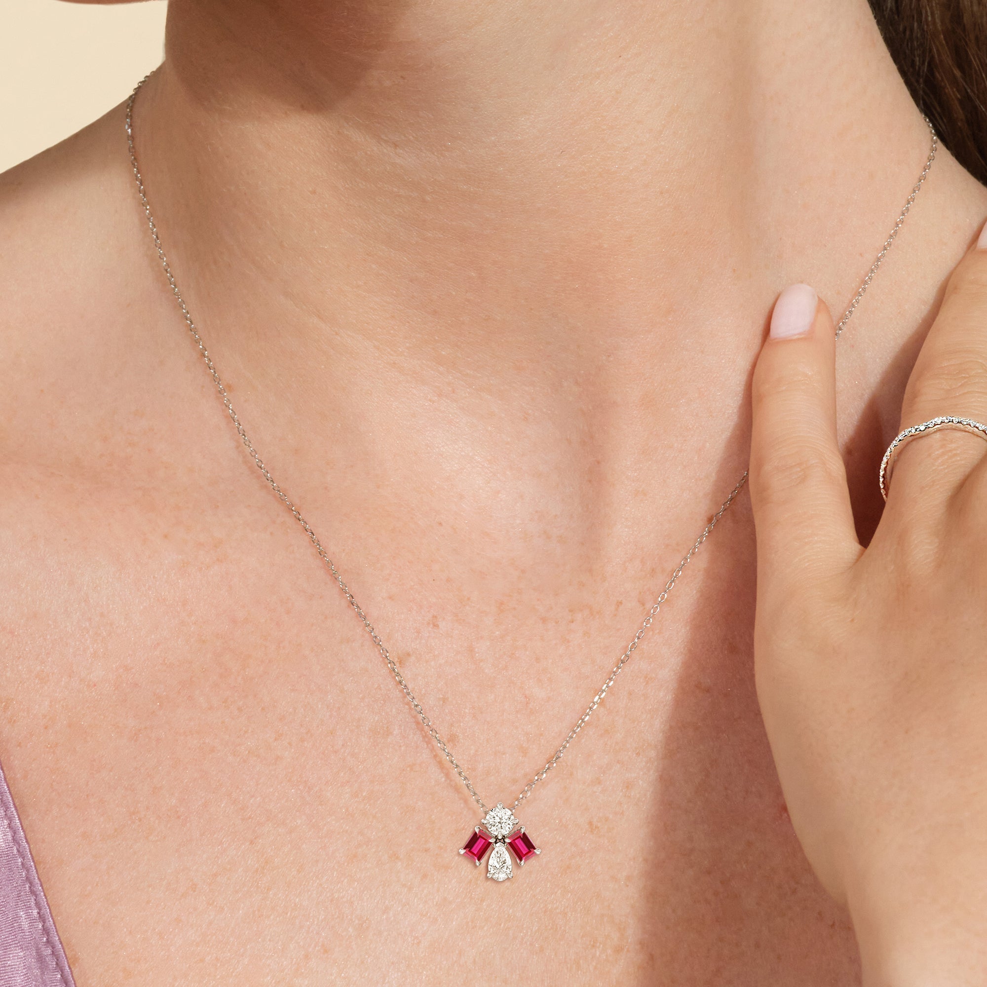 With this necklace as part of your daily jewelry rotation, expect a look that is effortlessly elegant every time. The necklace features a ruby and diamond cluster pendant composed of four diamonds. The combination of shapes and the faceted shine elevate the style of this piece of jewelry.