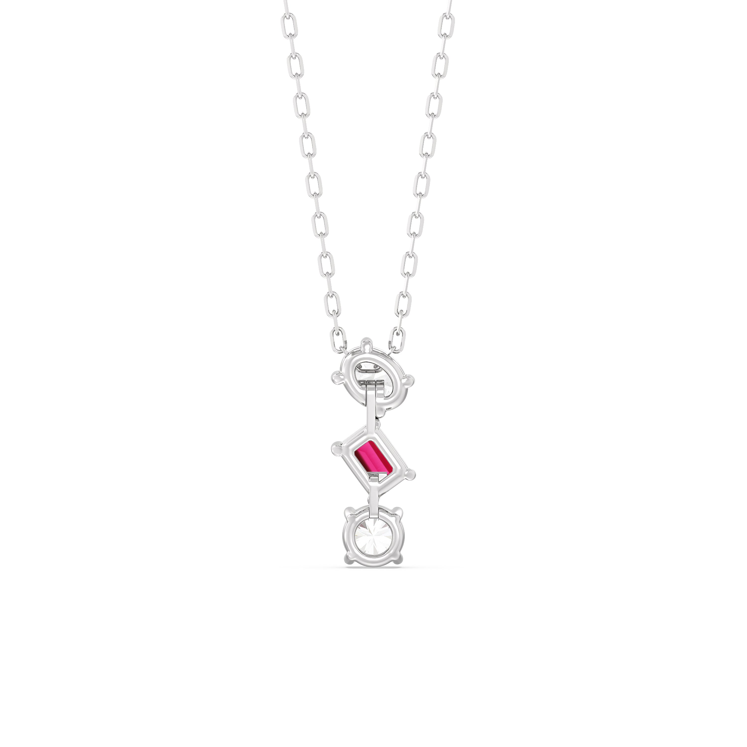 This ruby and diamond trilogy necklace embraces modern elegance with its minimalist aesthetic. It features a vertical row of oval, pear, and round diamonds, Designed with no distracting embellishments, this necklace's pure beauty shines.