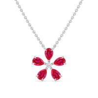 The ruby Periwinkle Necklace is delicately beautiful. Its pendant bears the pinwheel-like look of its namesake, with radially symmetrical and meticulously positioned pear-cut ruby petals. The luxe bloom evokes a sense of nostalgia, bringing to mind warm memories and serving as a notice of the passage of time.