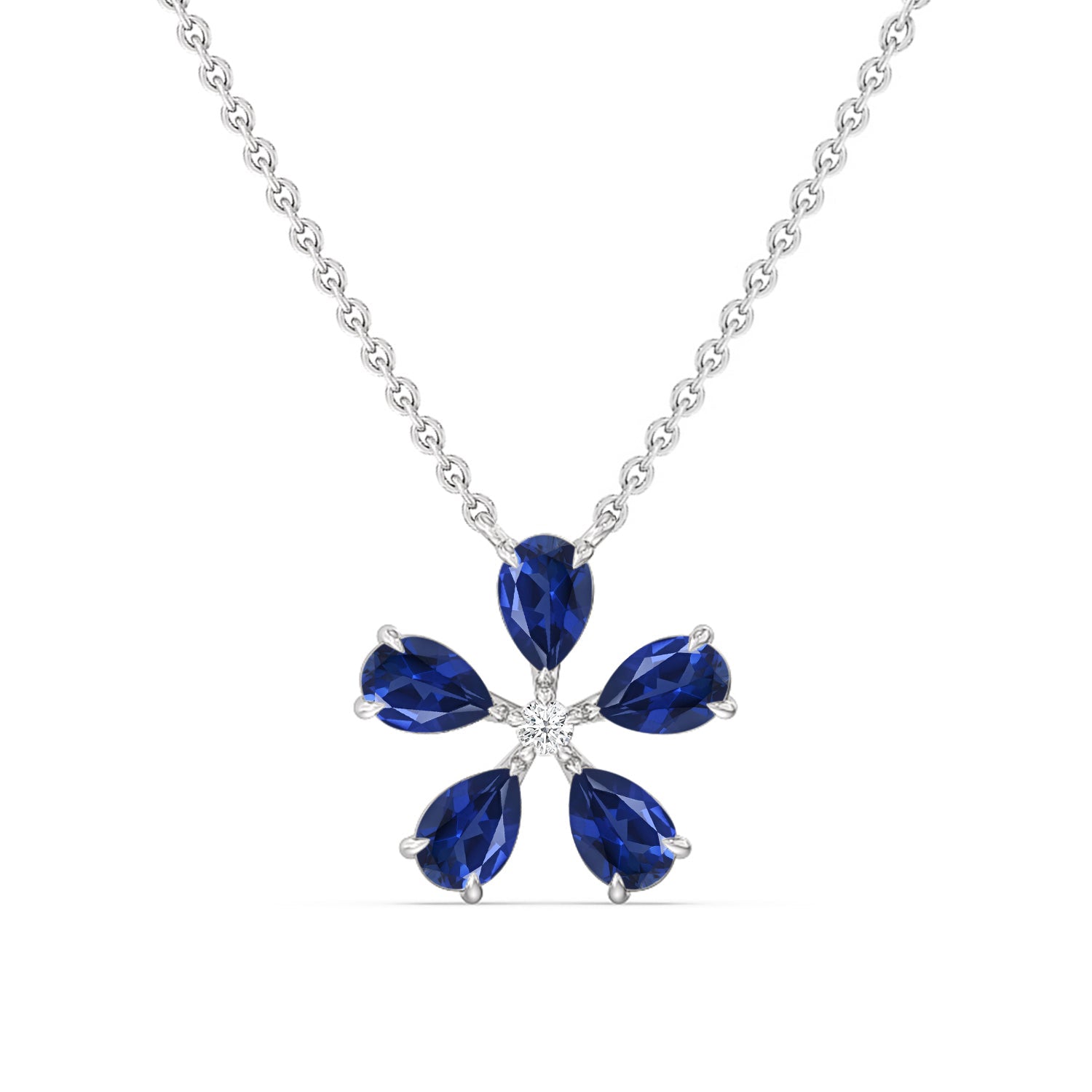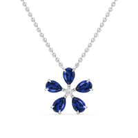 The Sapphire Periwinkle Necklace is delicately beautiful. Its pendant bears the pinwheel-like look of its namesake, with radially symmetrical and meticulously positioned pear-cut Sapphire petals. The luxe bloom evokes a sense of nostalgia, bringing to mind warm memories and serving as a notice of the passage of time.