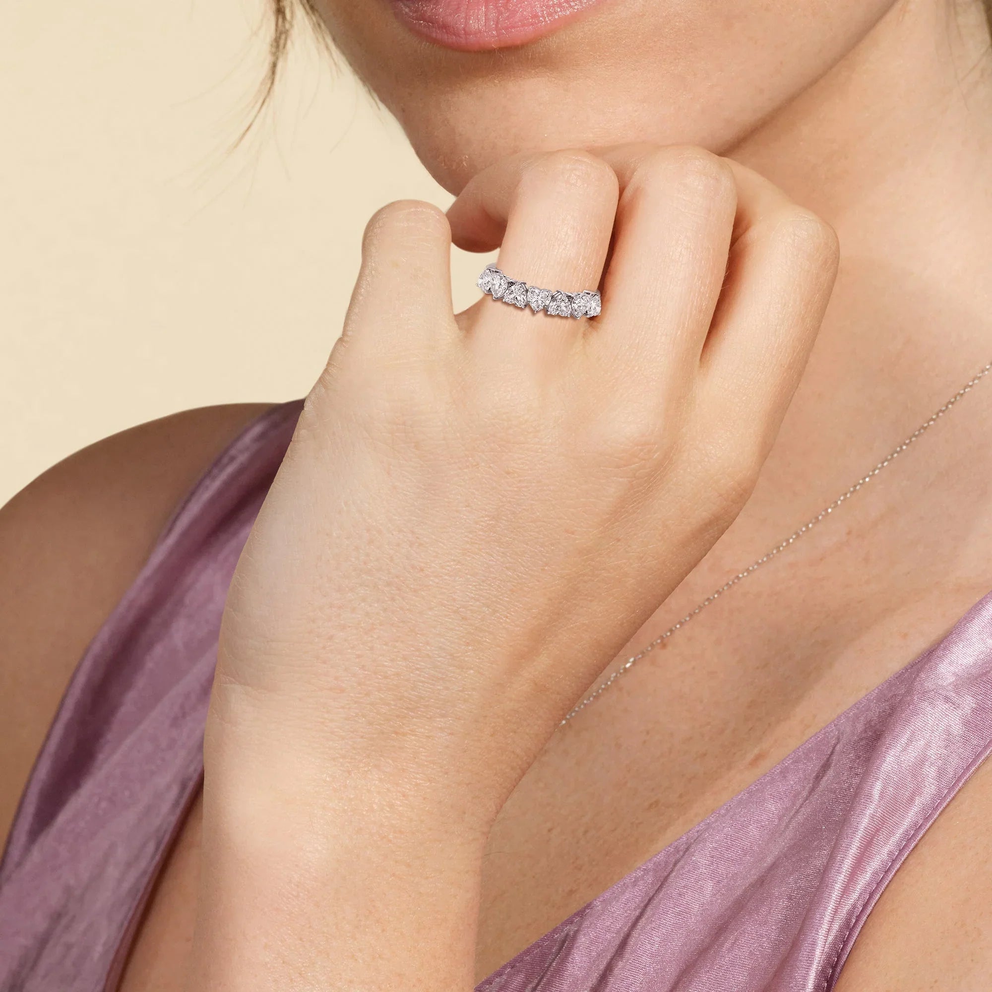 This stunner is the perfect marker of fidelity and commitment. It features a highly polished band that subtly widens towards the top. Seven perfectly cut heart-shaped diamonds bring a sweet sparkle to this symbolic anniversary ring.
