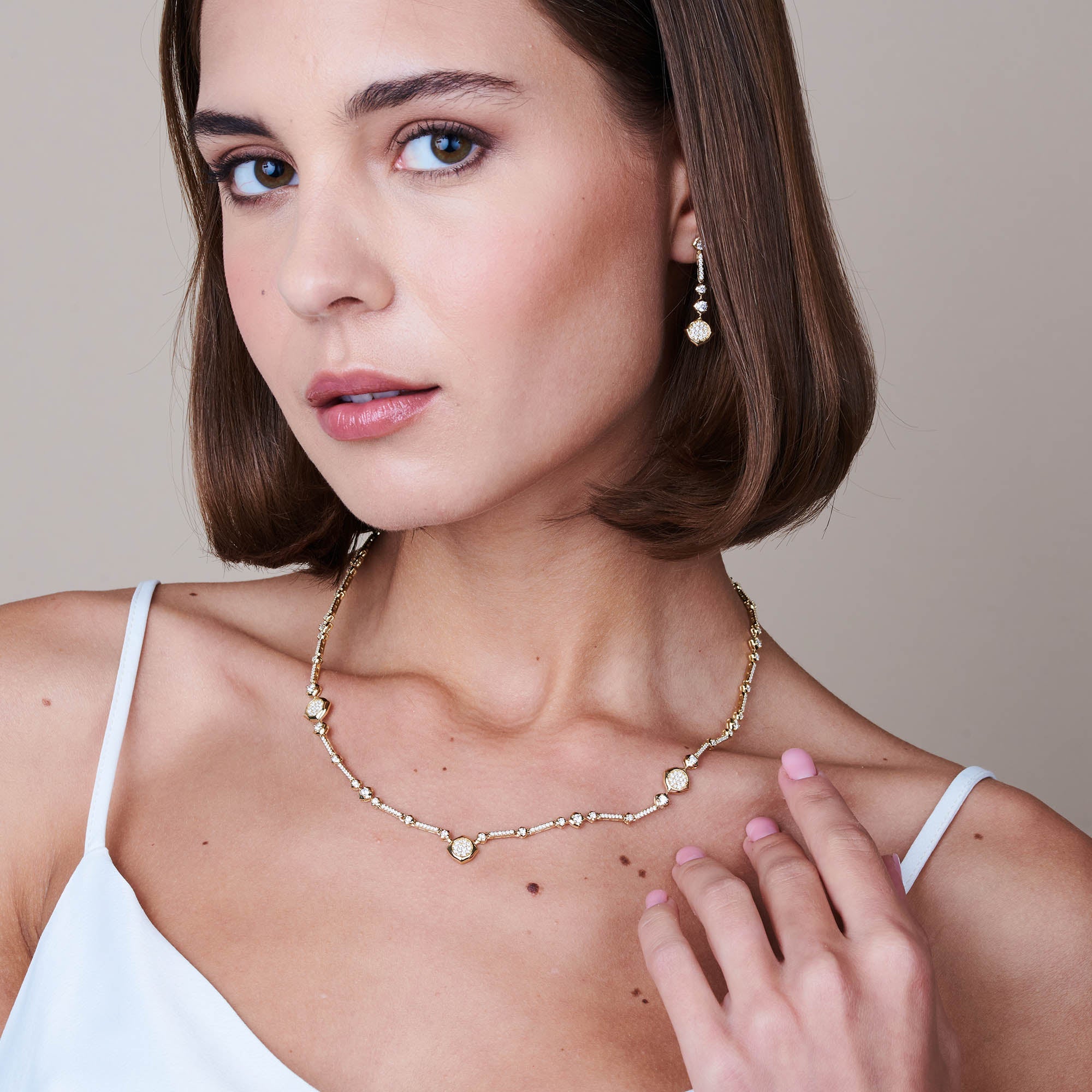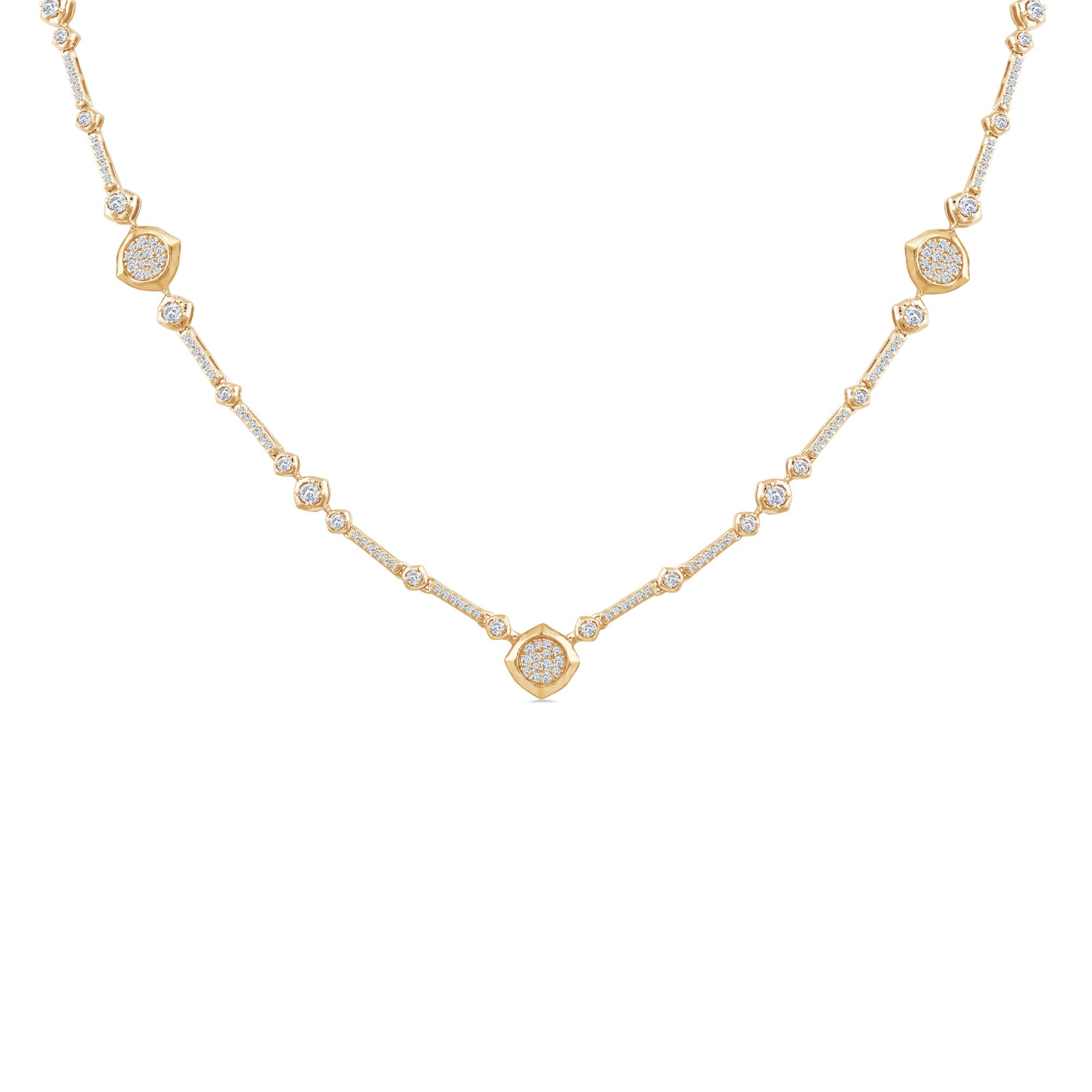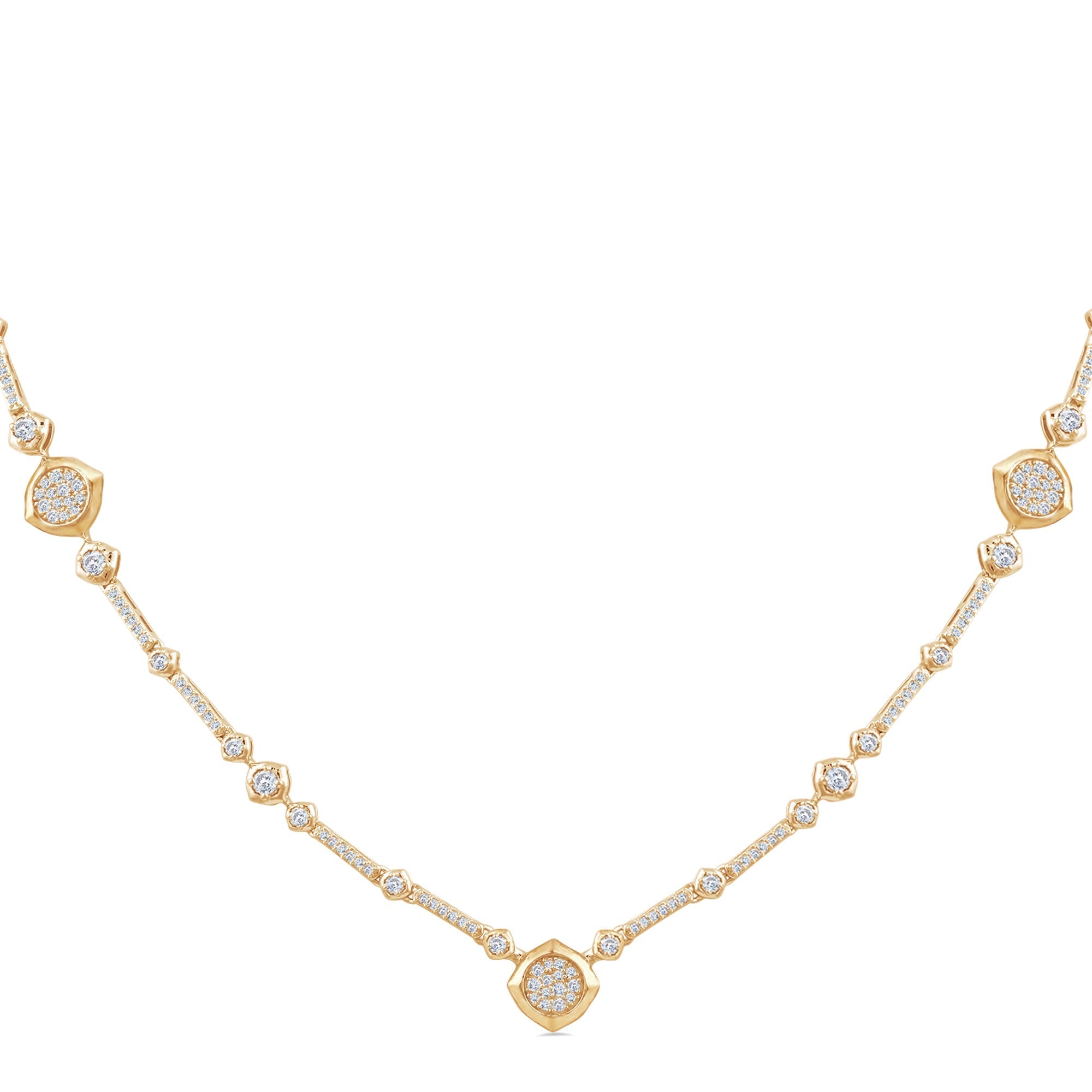 Stunningly glamorous, this lab-created diamond necklace wraps elegantly around the neck, creating an aura of shimmering light. Mixing lines of diamonds along with pave set diamonds signature sculpted cushion-shaped motifs, this necklace is red-carpet ready! Set in 14k gold with 2 3/4Cts total diamond weight.