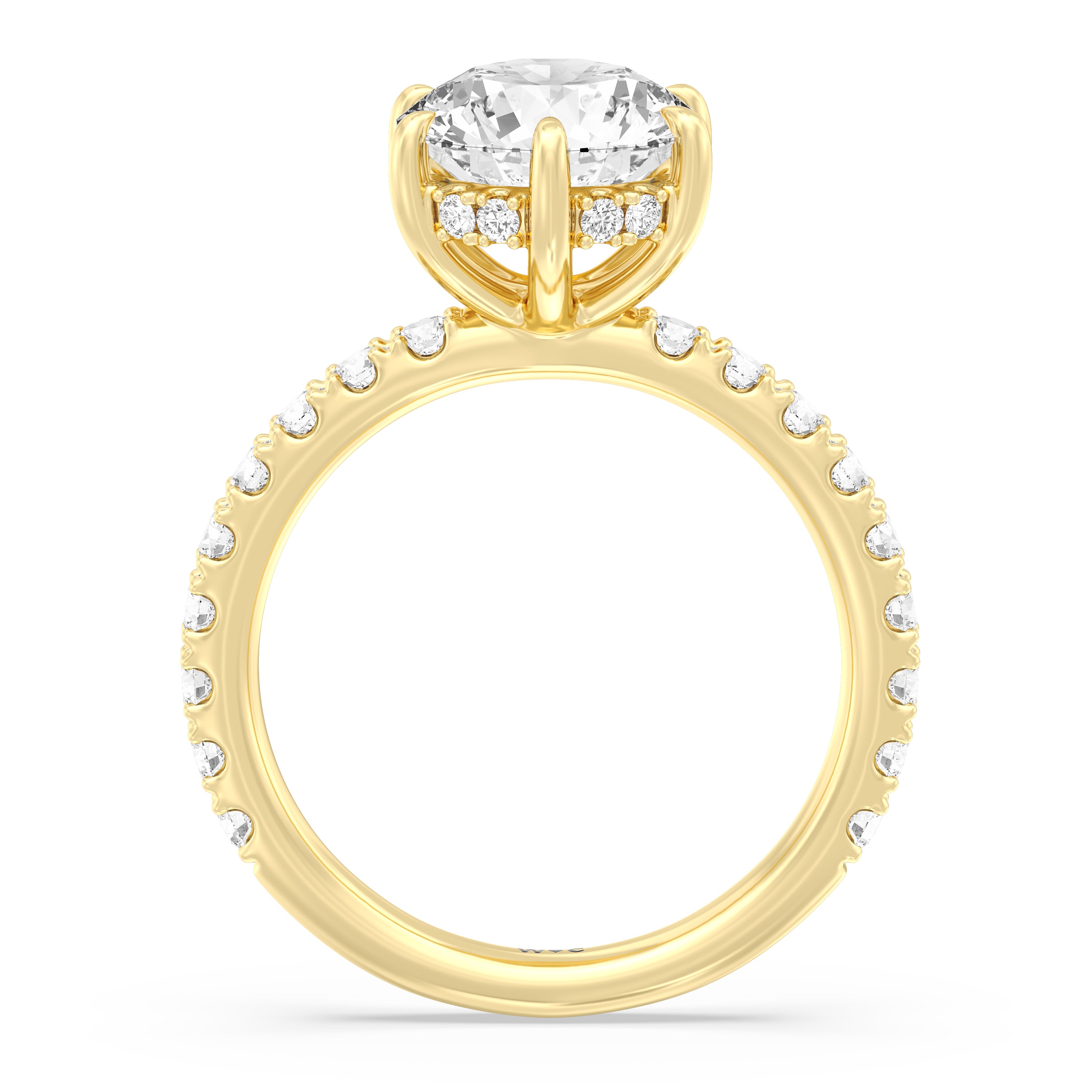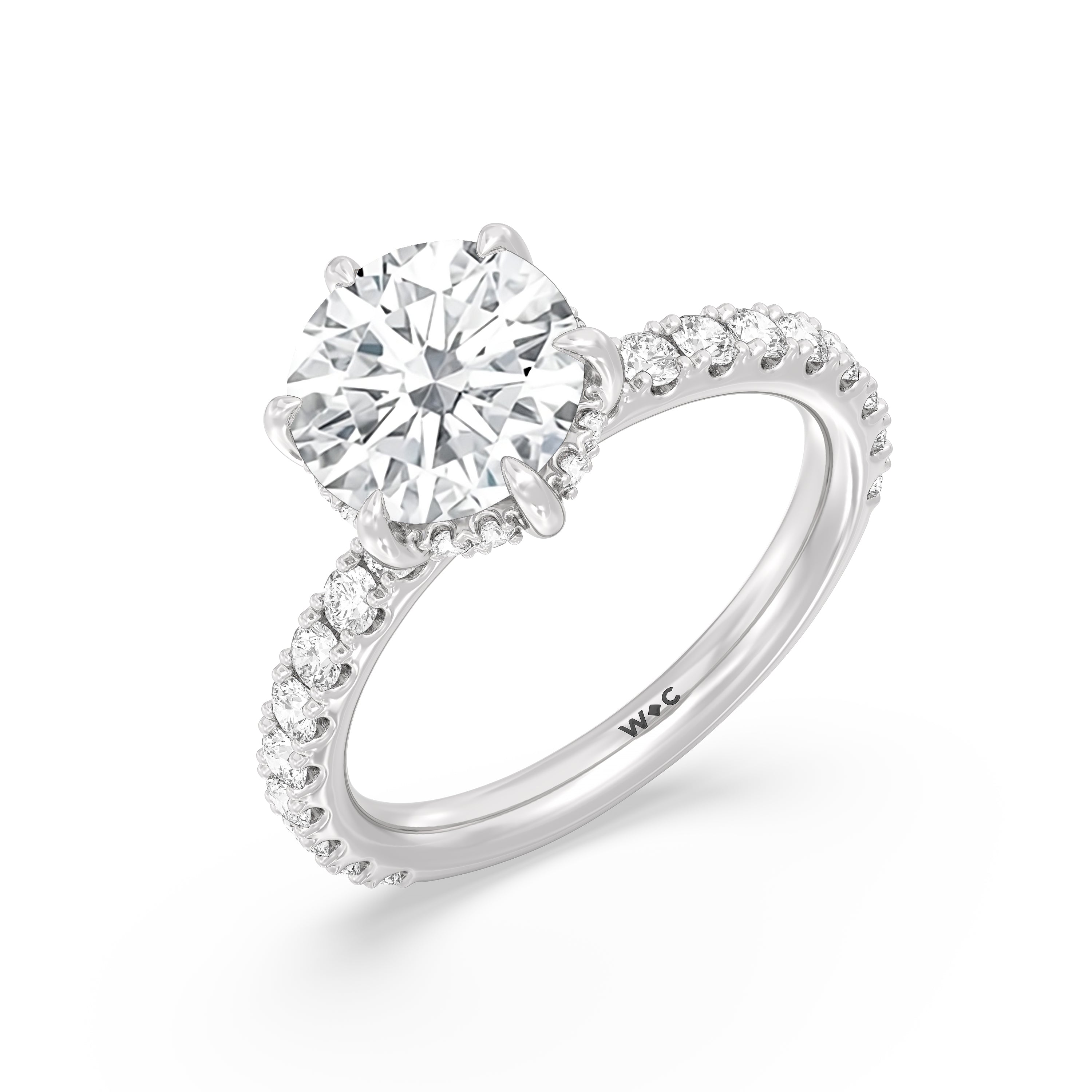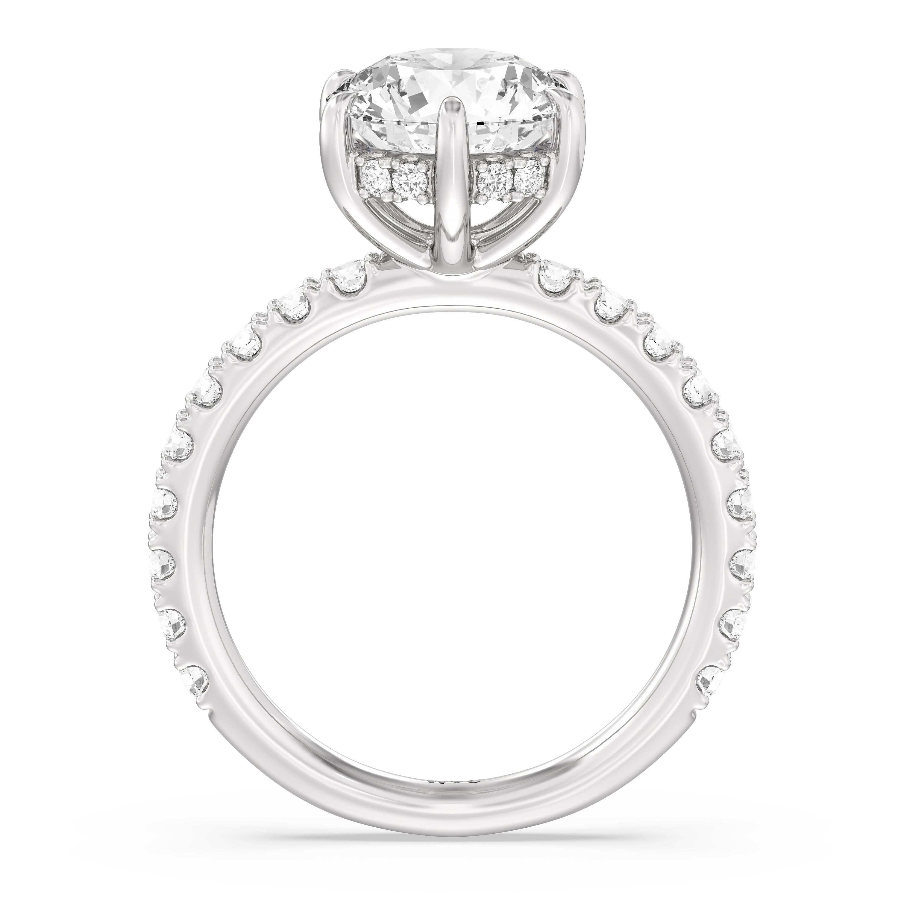 This ring is an elevated solitaire perfect for the lady who desires a bit more opulence in her ring. This piece features a glorious 3-carat round diamond center stone securely held in place by a six-prong setting. At the base of the central gem is a halo of petite round diamonds, shining brightly and harmoniously with the pavé diamond band.